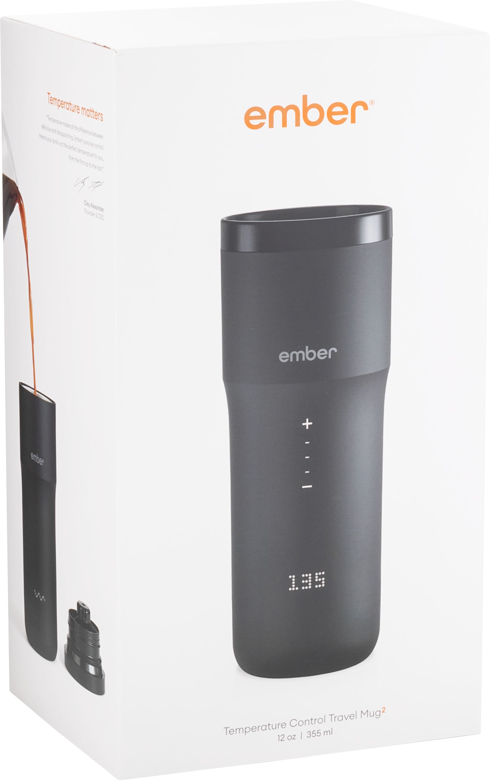The Ember Travel Mug 2+ 12 oz offers precise temperature control in a sleek, portable design. Made from durable 18/8 stainless steel, it features a leak-proof, push-to-open 360° threaded lid for effortless sipping from any angle. The integrated touch display allows you to set and monitor your ideal temperature, while the built-in battery keeps your drink hot for hours. Finished with a reinforced matte coating for a modern, durable feel—perfect for smart, on-the-go sipping.