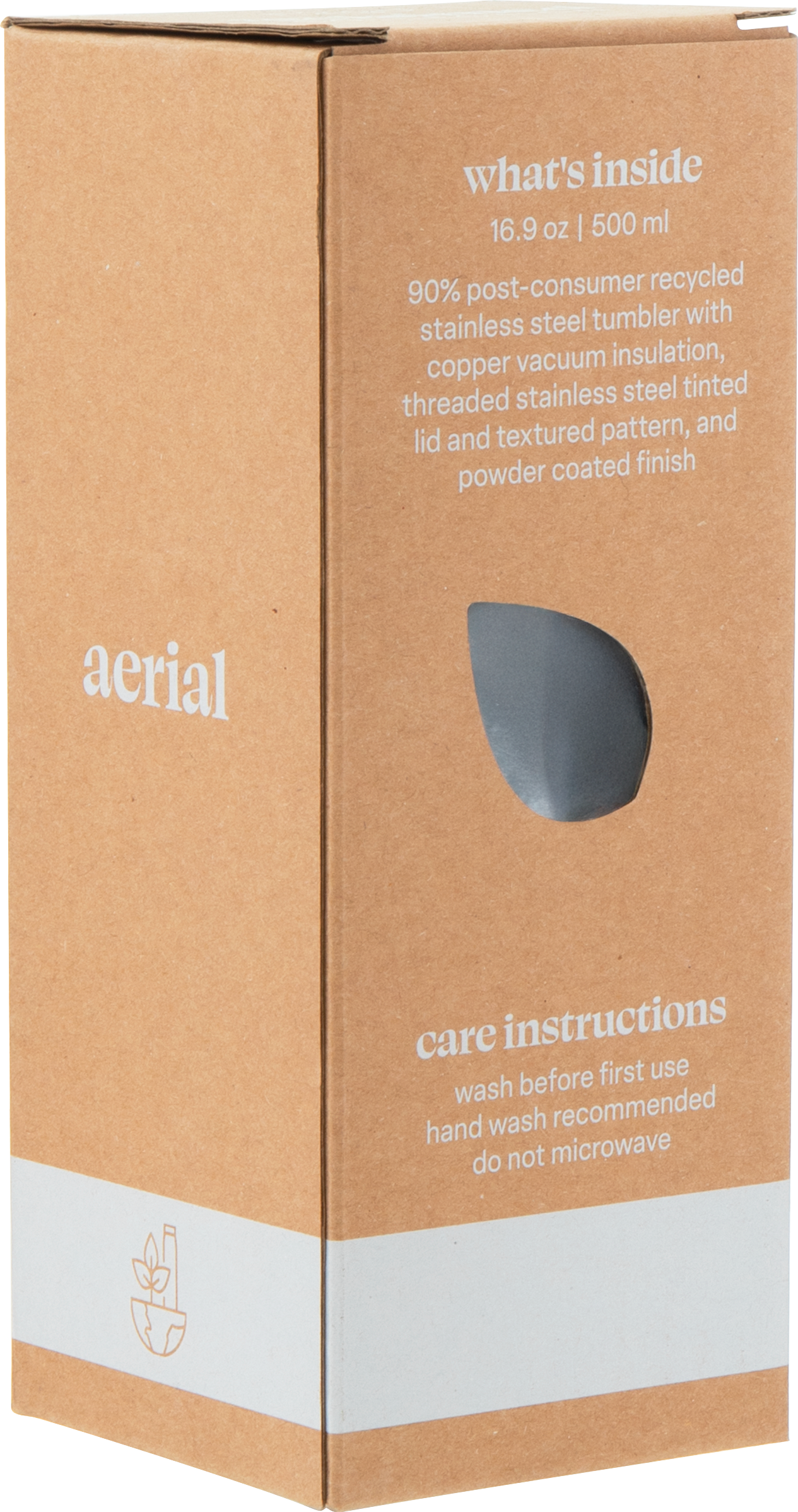 The h2go Aerial 16.9 oz tumbler combines sustainability with style. Made from 91% post-consumer recycled stainless steel, it features copper vacuum insulation to keep drinks hot or cold for hours. The textured powder coated exterior offers a modern look and comfortable grip, while the threaded stainless steel lid with a tinted finish adds a sleek, secure touch. A smart choice for eco-conscious sipping on the go.