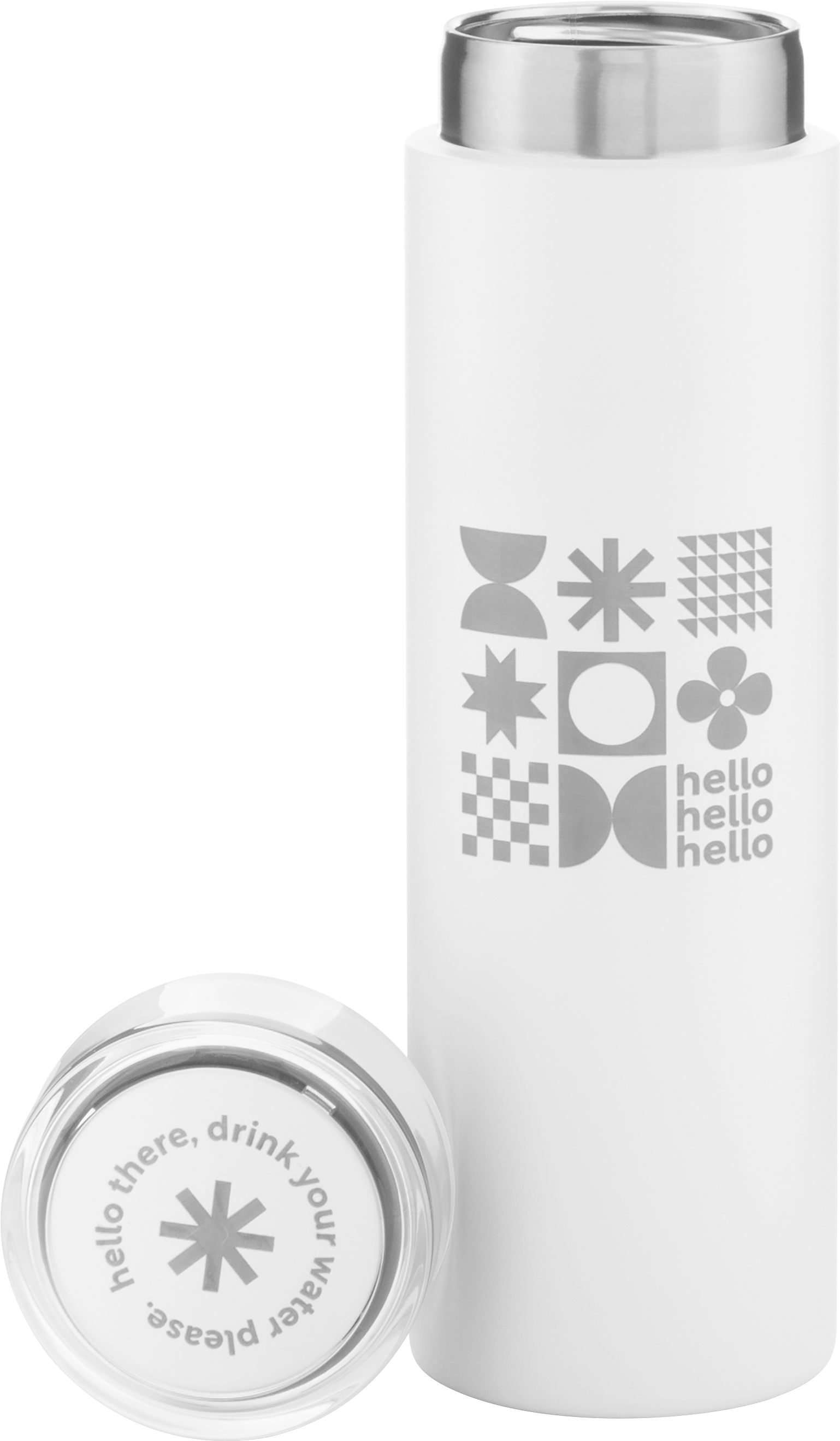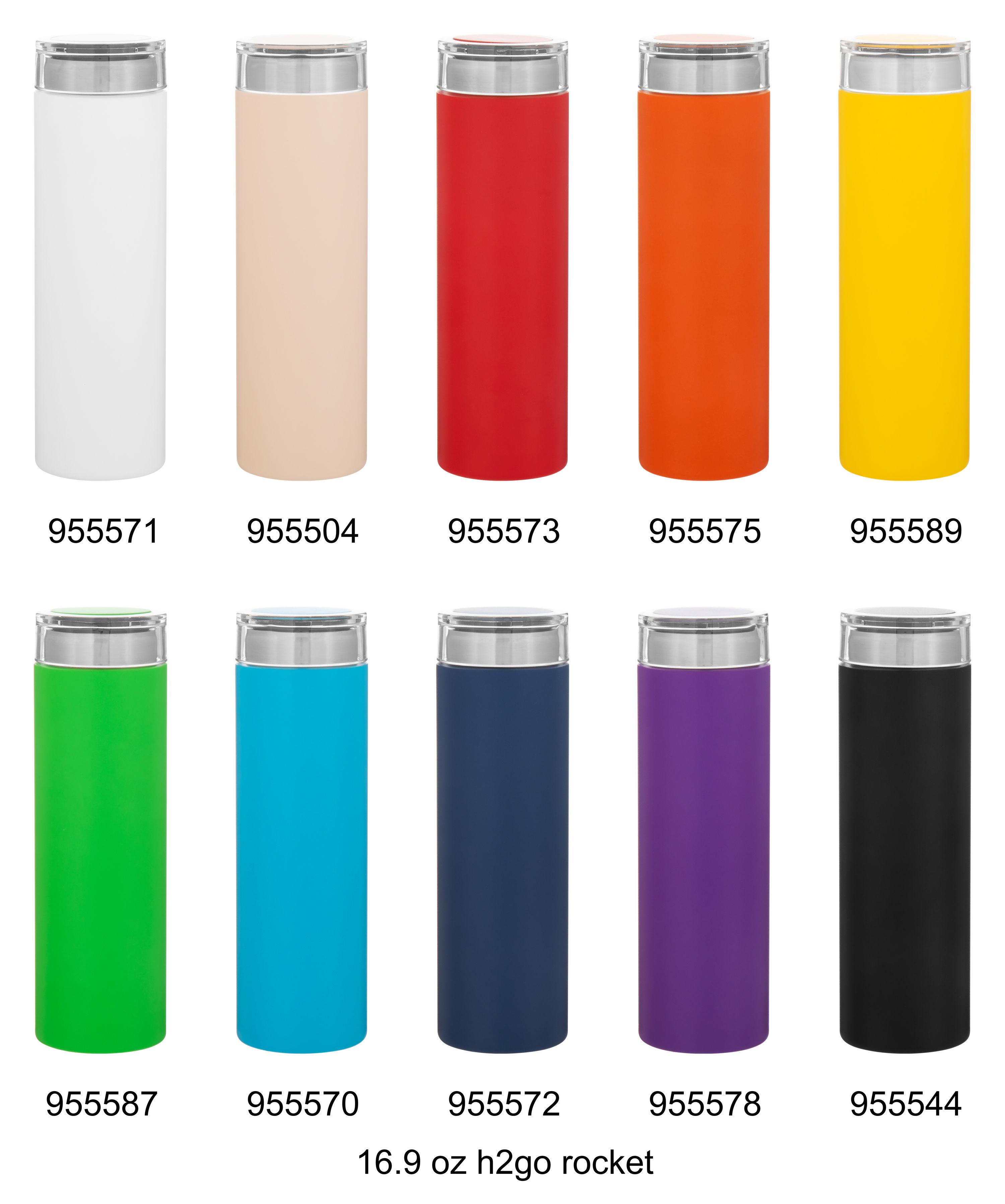 The 16.9 oz h2go Rocket bottle is built for performance and style. Made from double-wall 18/8 stainless steel with copper vacuum insulation, it keeps drinks hot or cold for hours. The threaded Eastman Tritan™ lid with a matching stainless steel top provides a secure, leak-resistant seal, while the matte white powder coated finish offers a sleek look and reliable grip. Ideal for travel, workouts, or daily hydration.