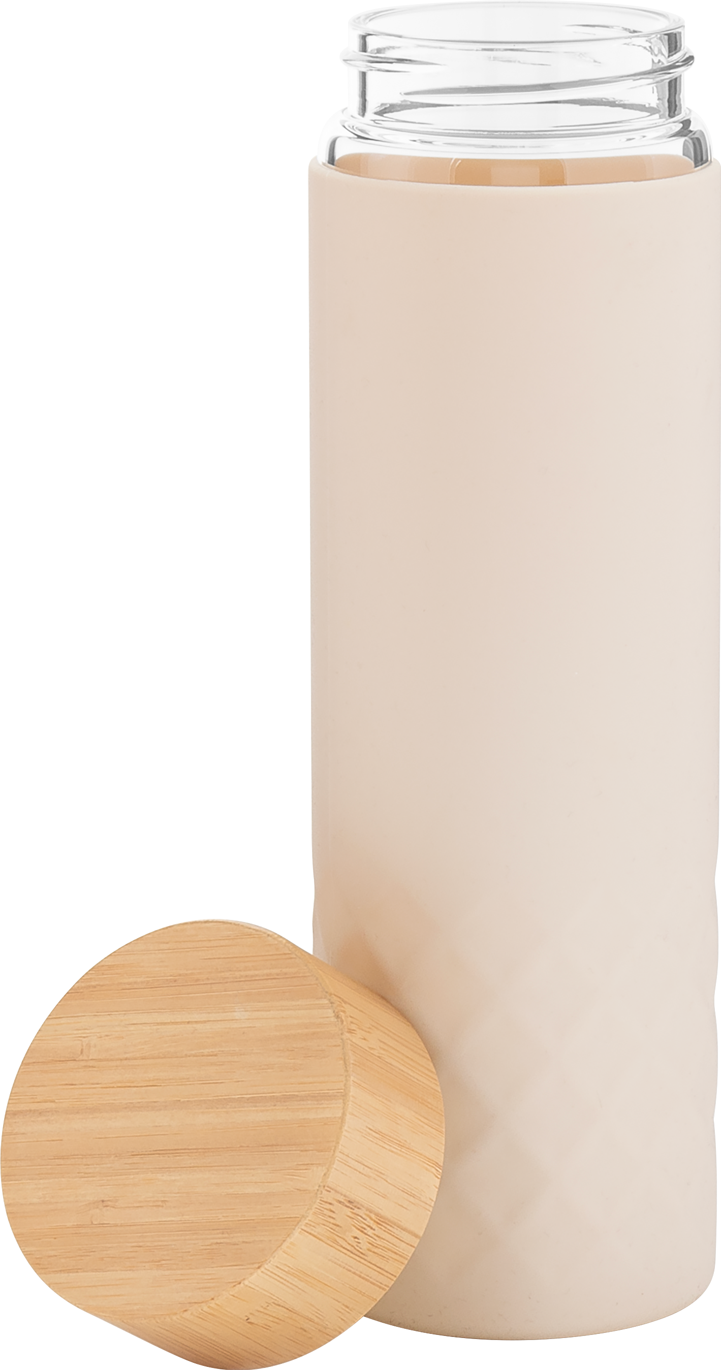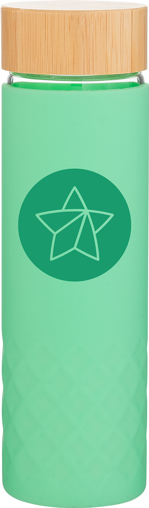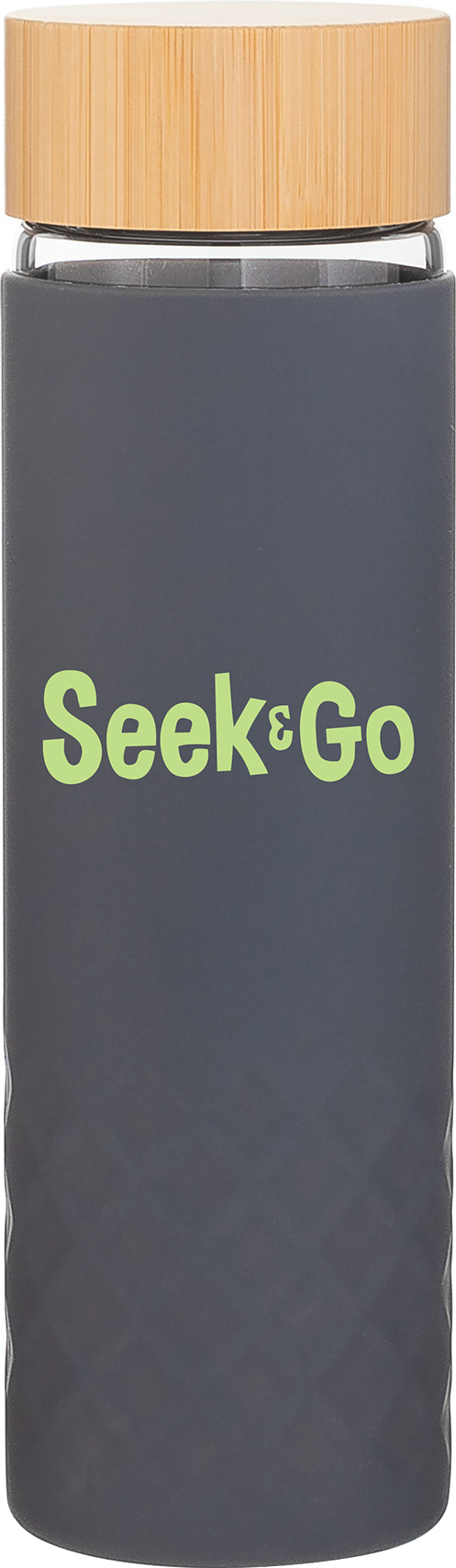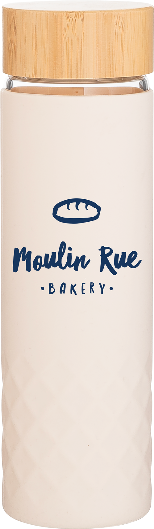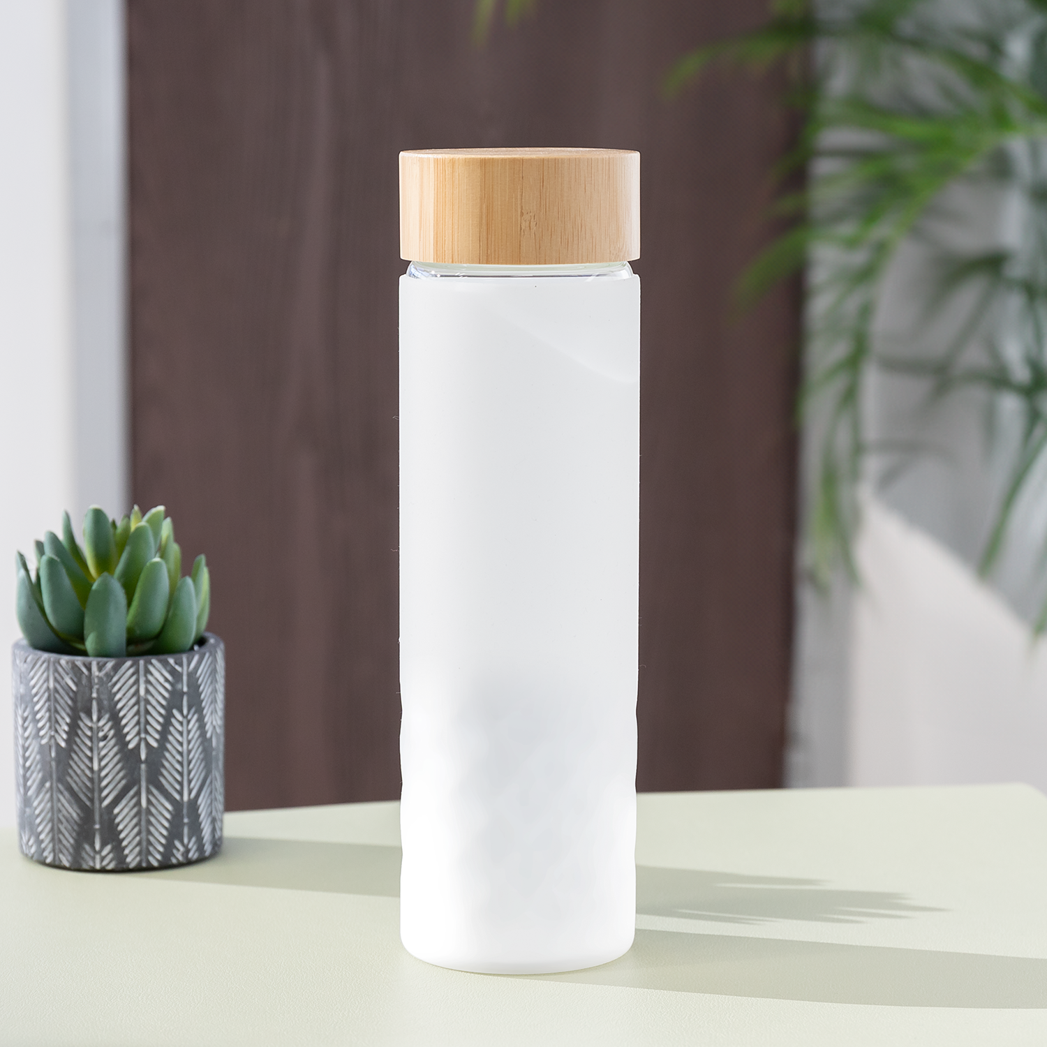 The h2go Dawn 18 oz glass bottle blends clean design with natural details for stylish, everyday hydration. Made from lightweight single wall borosilicate glass, it features a threaded bamboo lid and a protective silicone sleeve that adds grip and guards against bumps. Ideal for cold beverages at home, at work, or on the go.