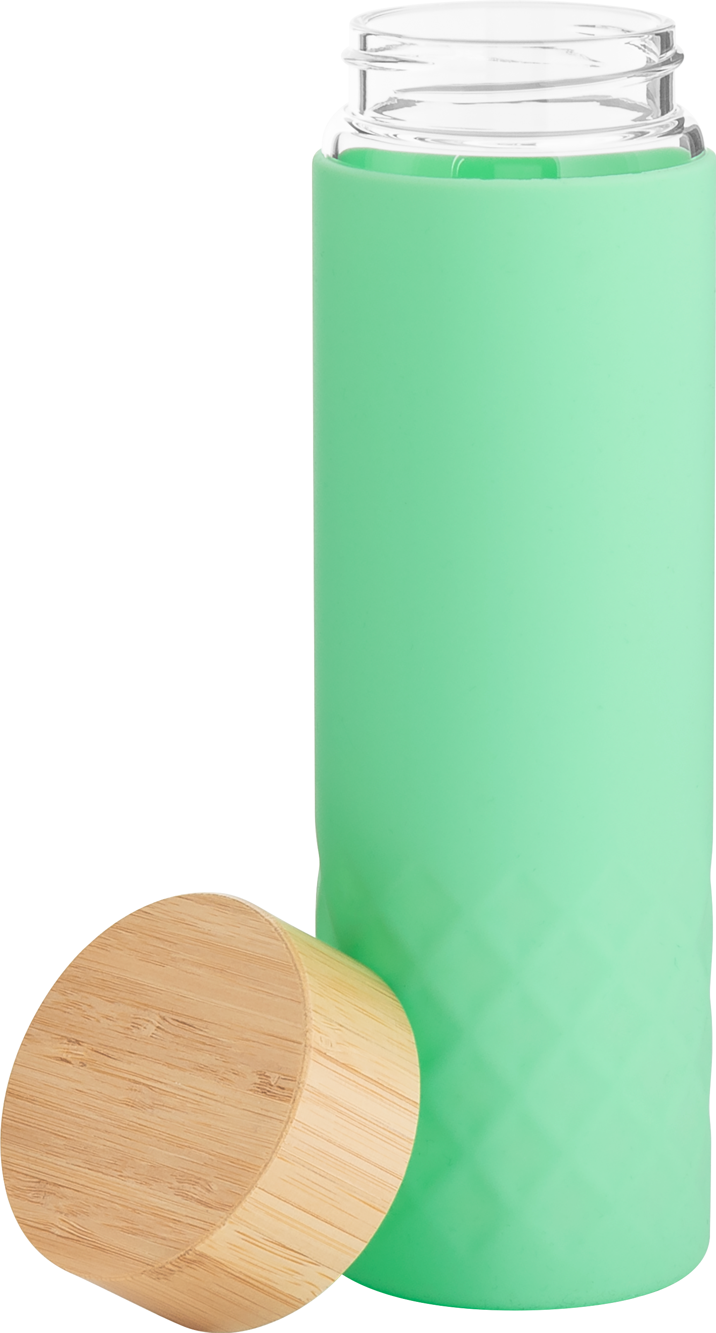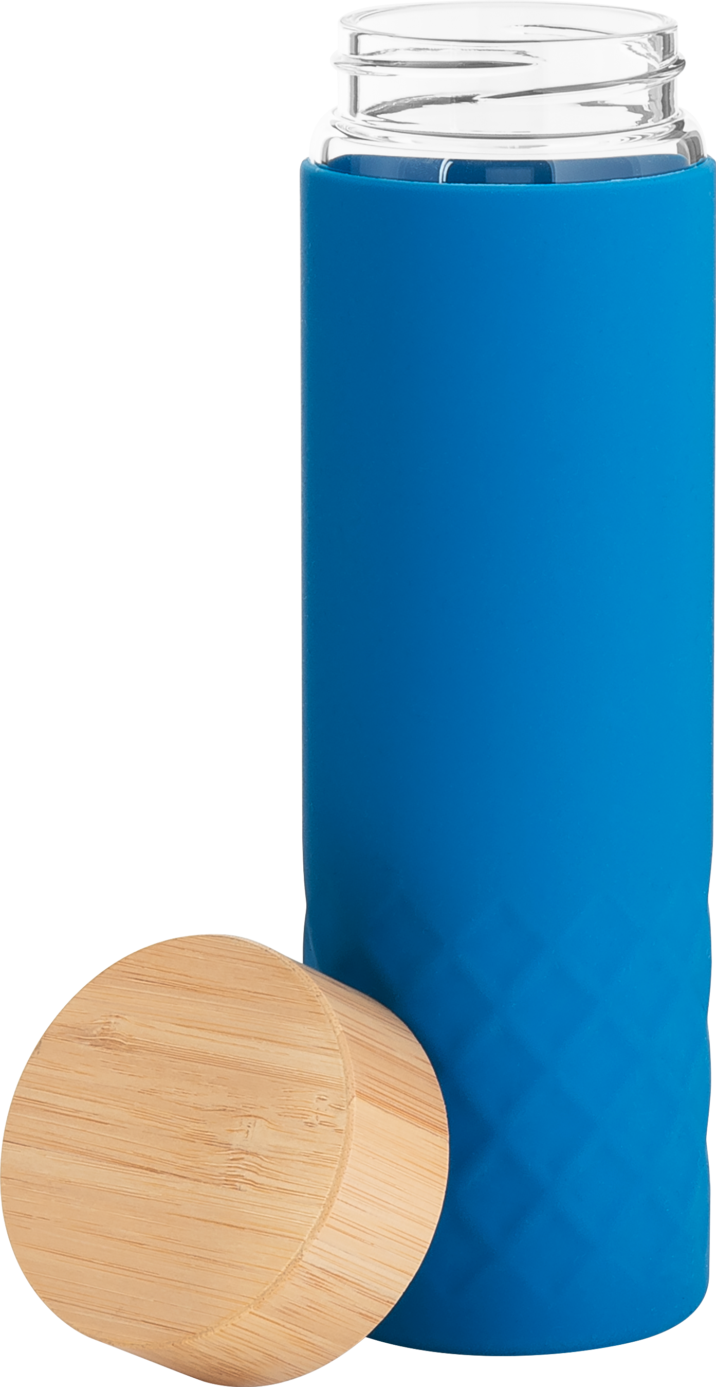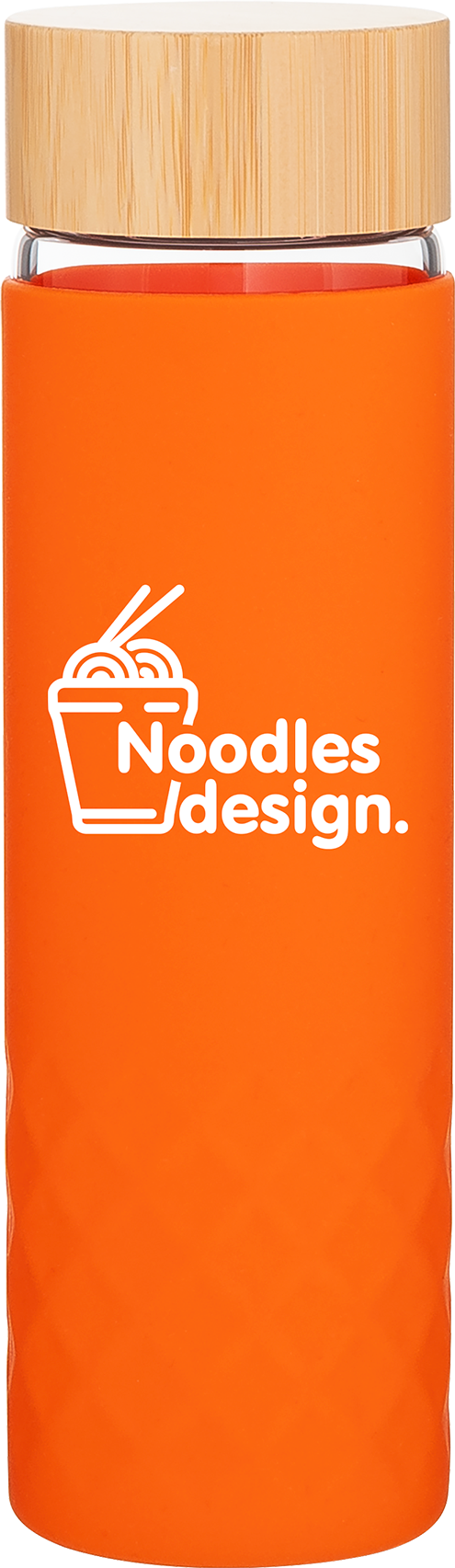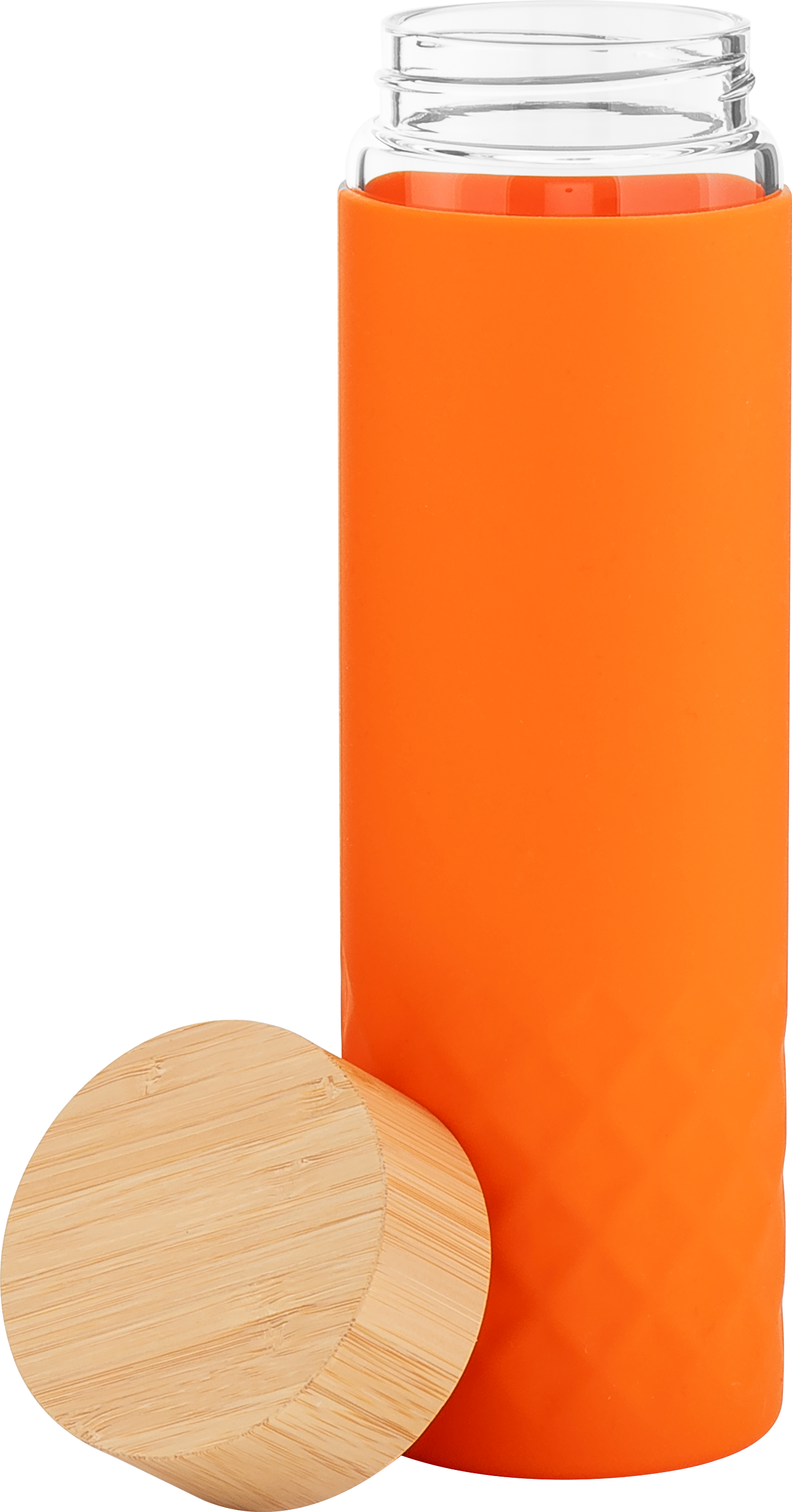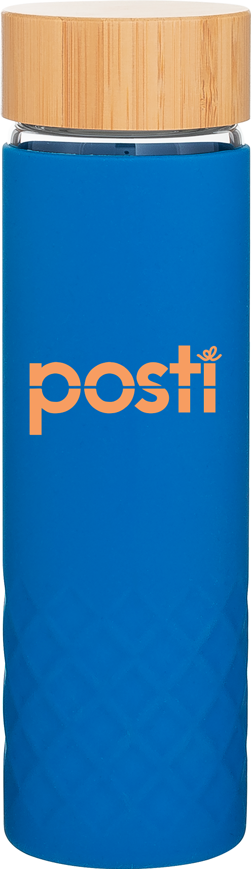 The h2go Dawn 18 oz glass bottle blends clean design with natural details for stylish, everyday hydration. Made from lightweight single wall borosilicate glass, it features a threaded bamboo lid and a protective silicone sleeve that adds grip and guards against bumps. Ideal for cold beverages at home, at work, or on the go.