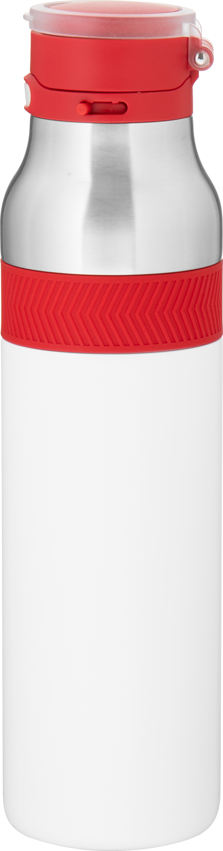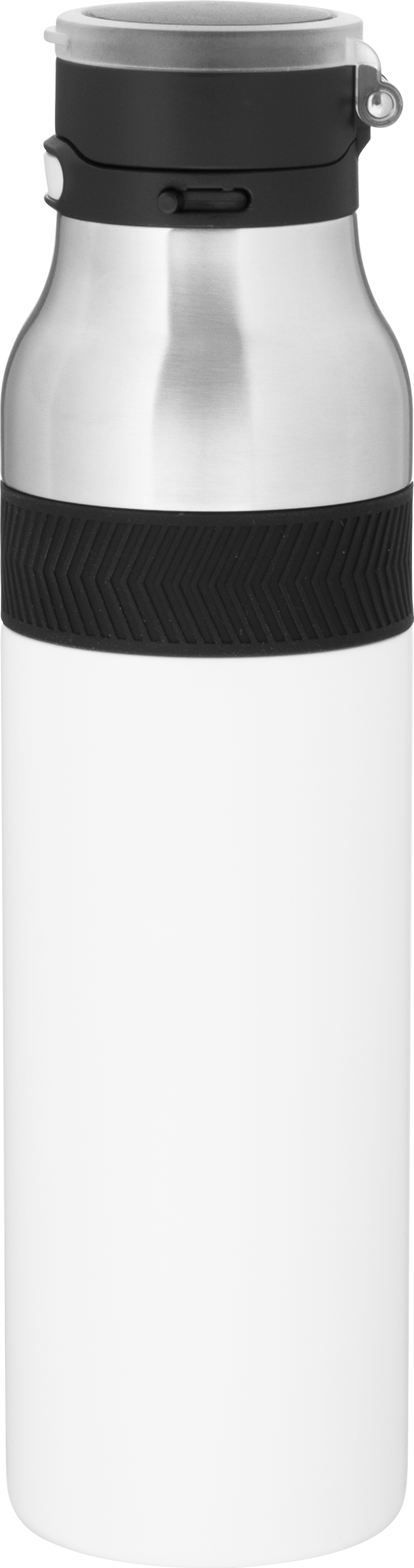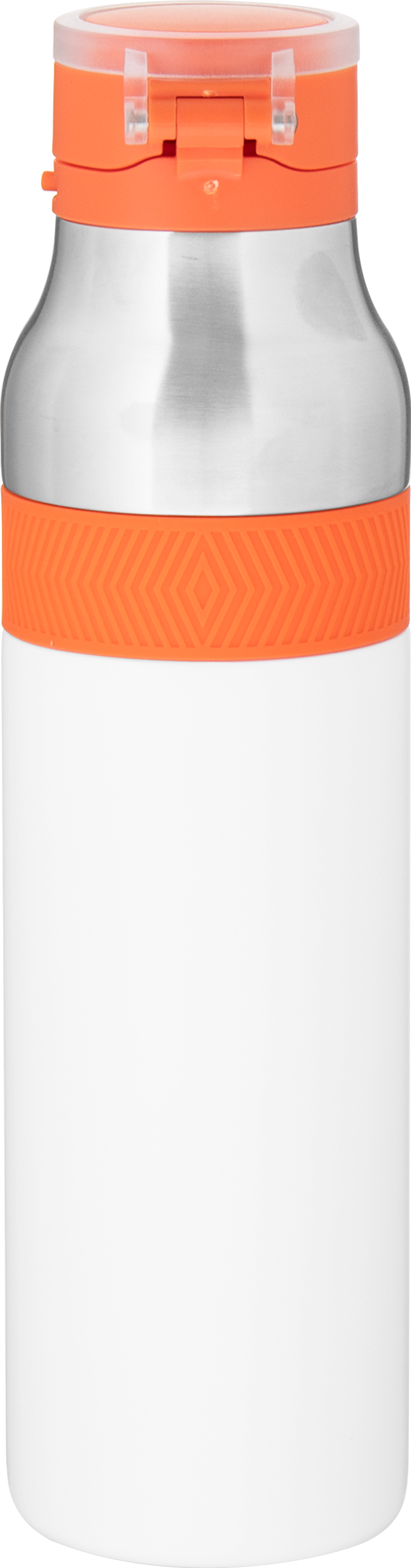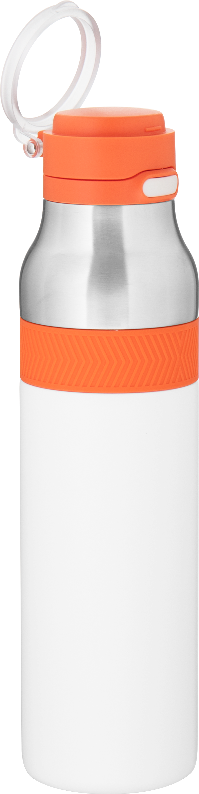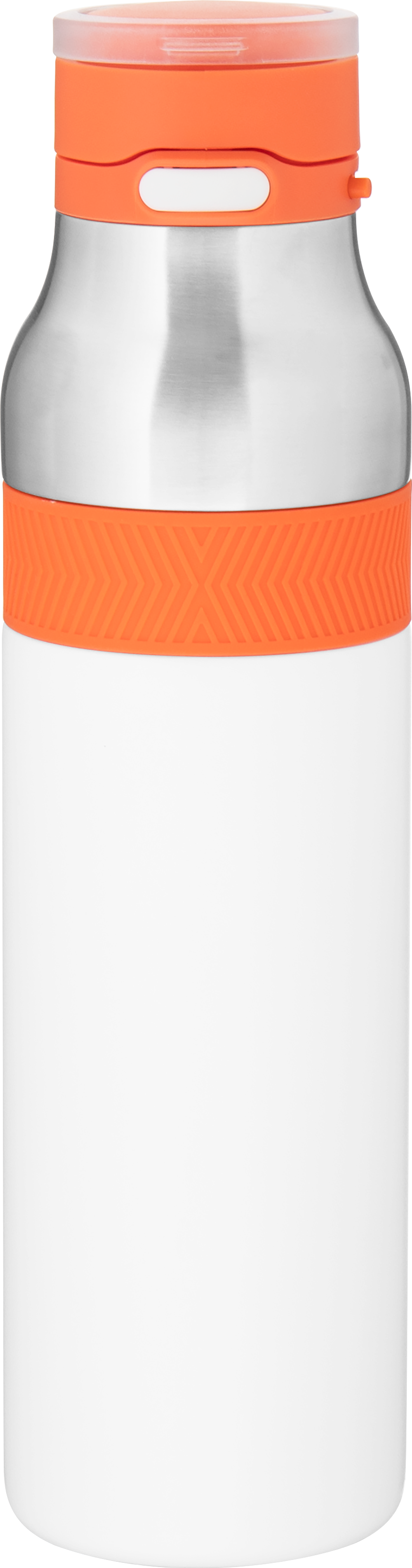 The h2go Jogger 20.9 oz thermal bottle is built for active lifestyles with secure insulation and a bold look. Made from double wall 18/8 stainless steel with copper vacuum insulation, it keeps beverages hot or cold for hours. It features a threaded lid with a push-button locking mechanism, an integrated carrying handle, and a pop of color accent for added style. Finished with a durable powder coated exterior for grip and durability.
