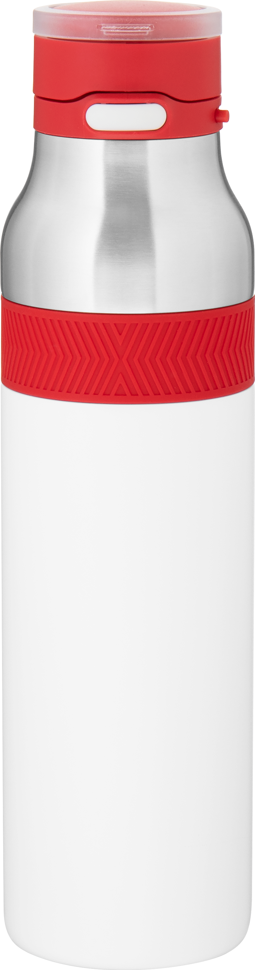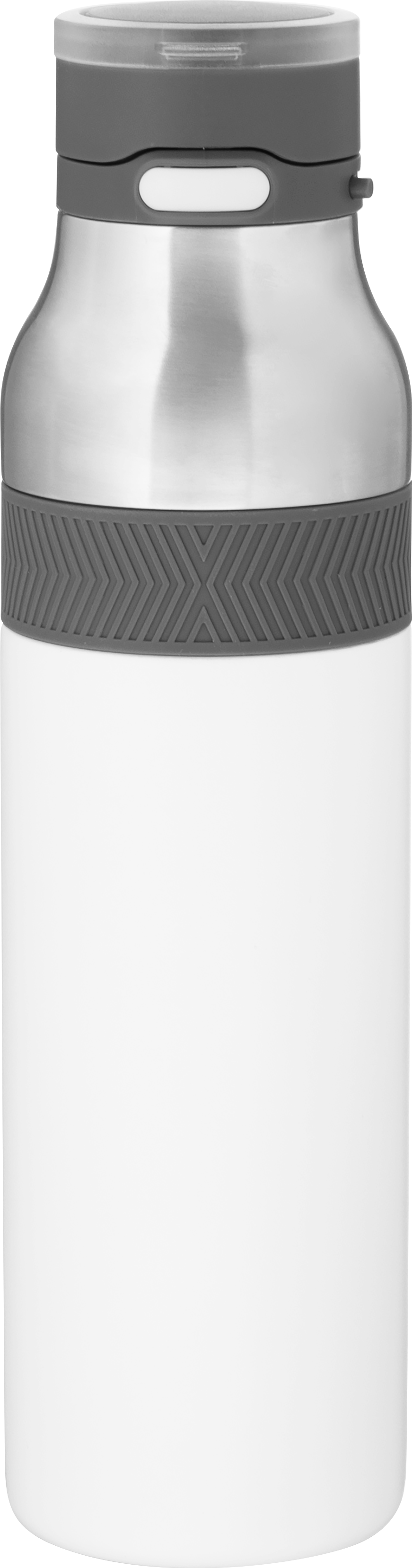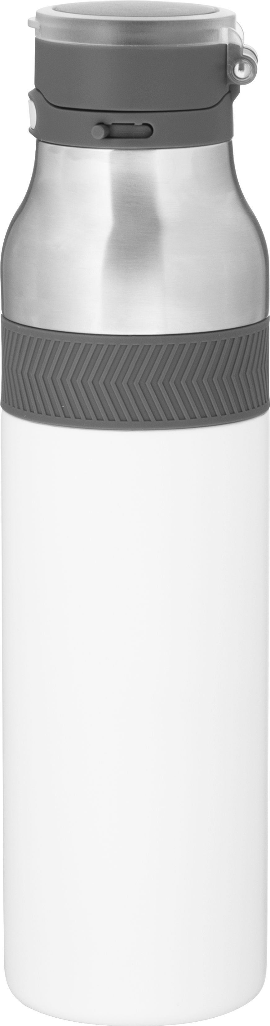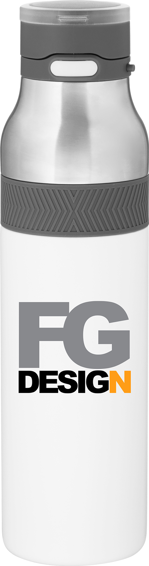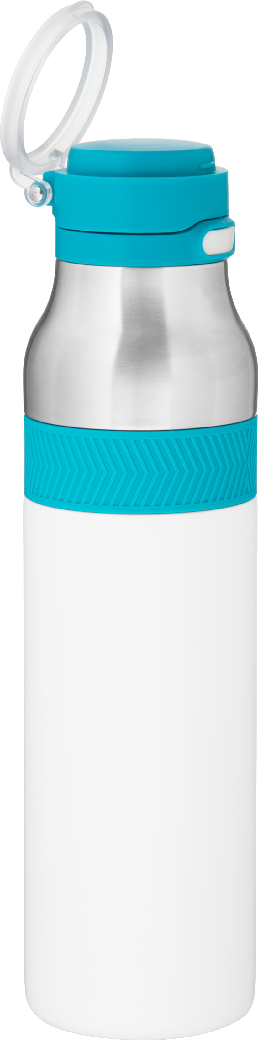 The h2go Jogger 20.9 oz thermal bottle is built for active lifestyles with secure insulation and a bold look. Made from double wall 18/8 stainless steel with copper vacuum insulation, it keeps beverages hot or cold for hours. It features a threaded lid with a push-button locking mechanism, an integrated carrying handle, and a pop of color accent for added style. Finished with a durable powder coated exterior for grip and durability.