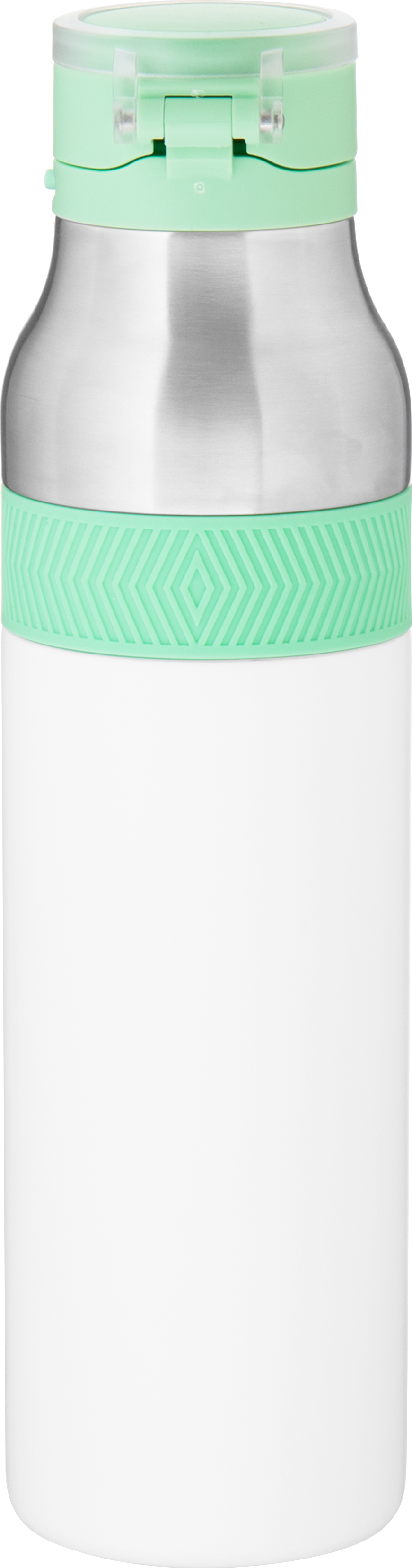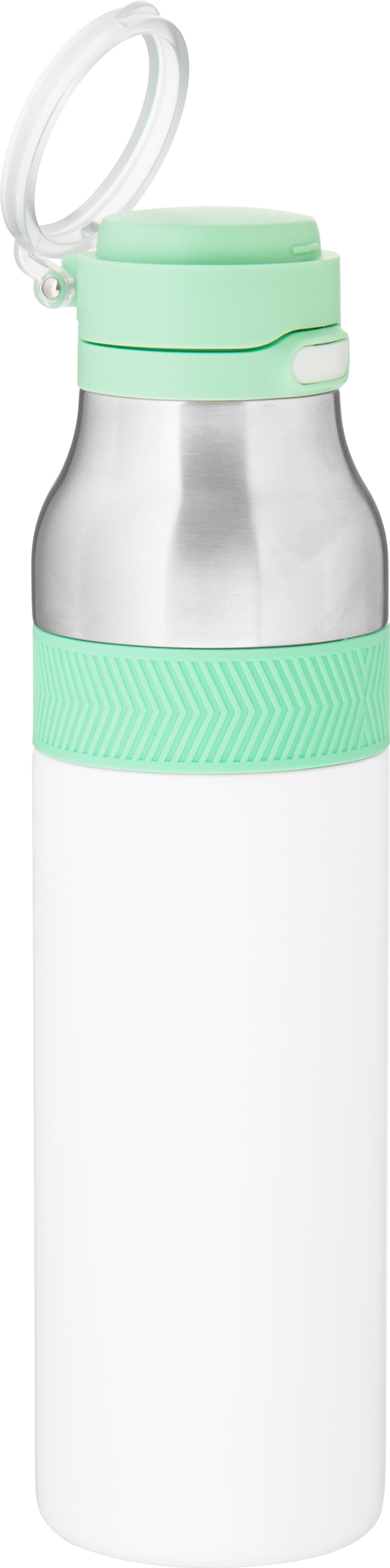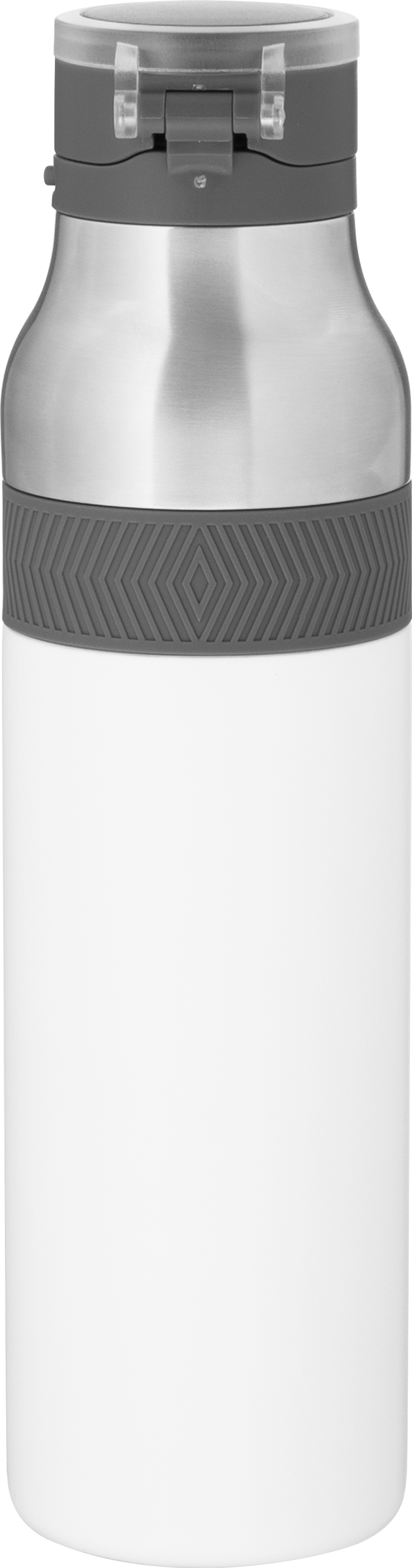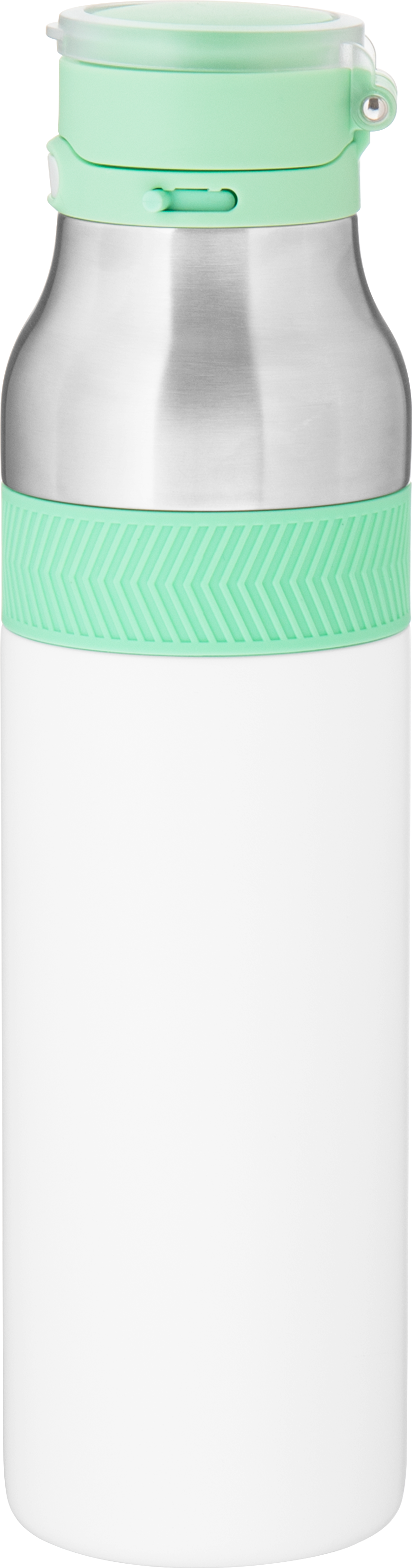 The h2go Jogger 20.9 oz thermal bottle is built for active lifestyles with secure insulation and a bold look. Made from double wall 18/8 stainless steel with copper vacuum insulation, it keeps beverages hot or cold for hours. It features a threaded lid with a push-button locking mechanism, an integrated carrying handle, and a pop of color accent for added style. Finished with a durable powder coated exterior for grip and durability.