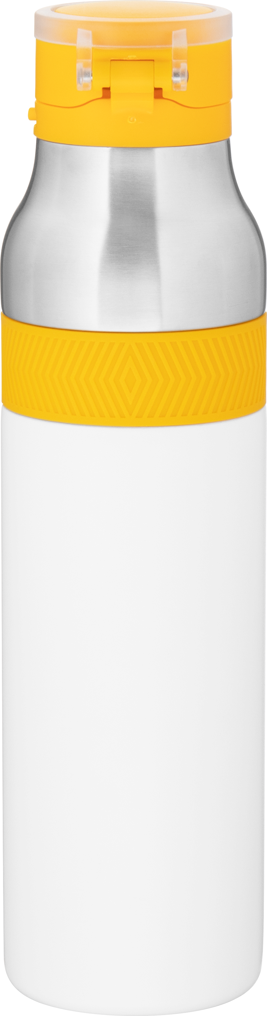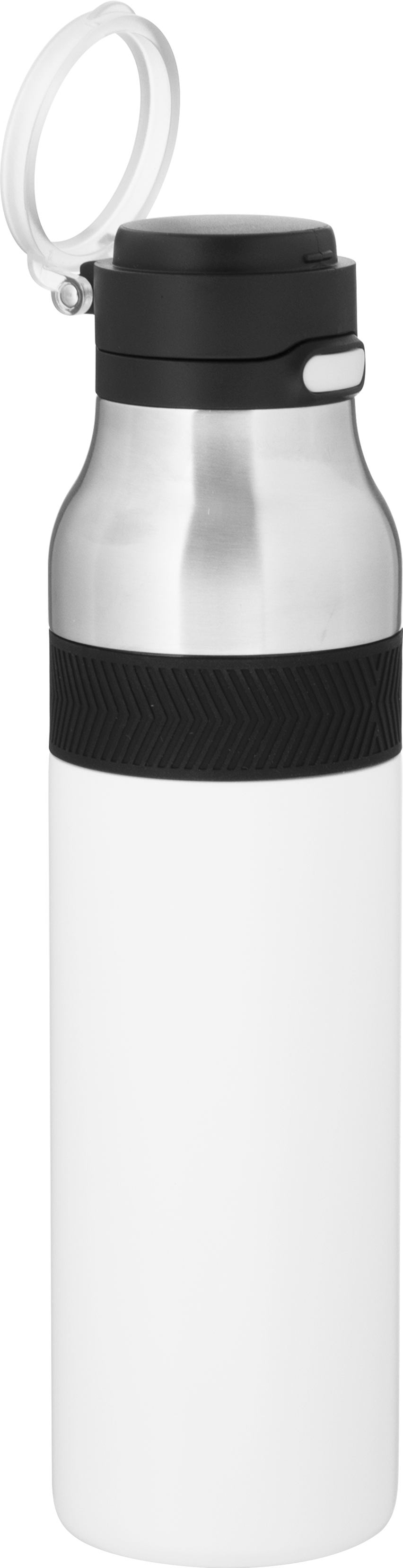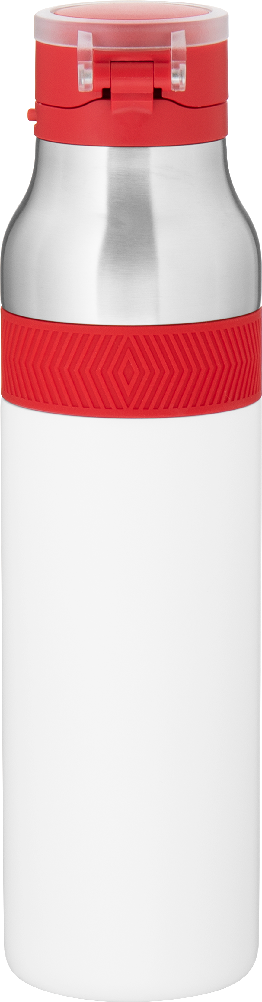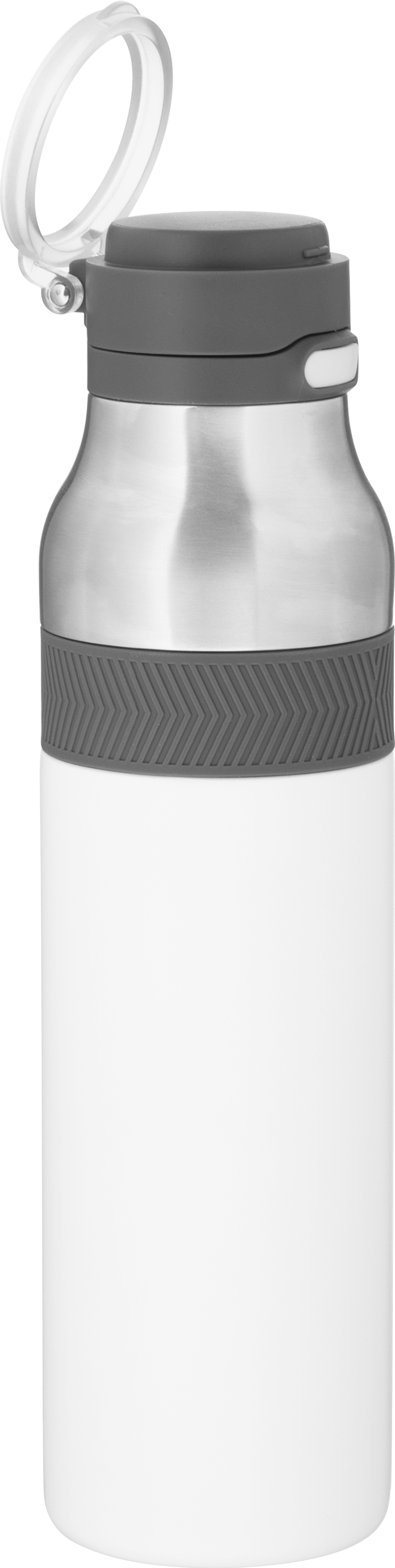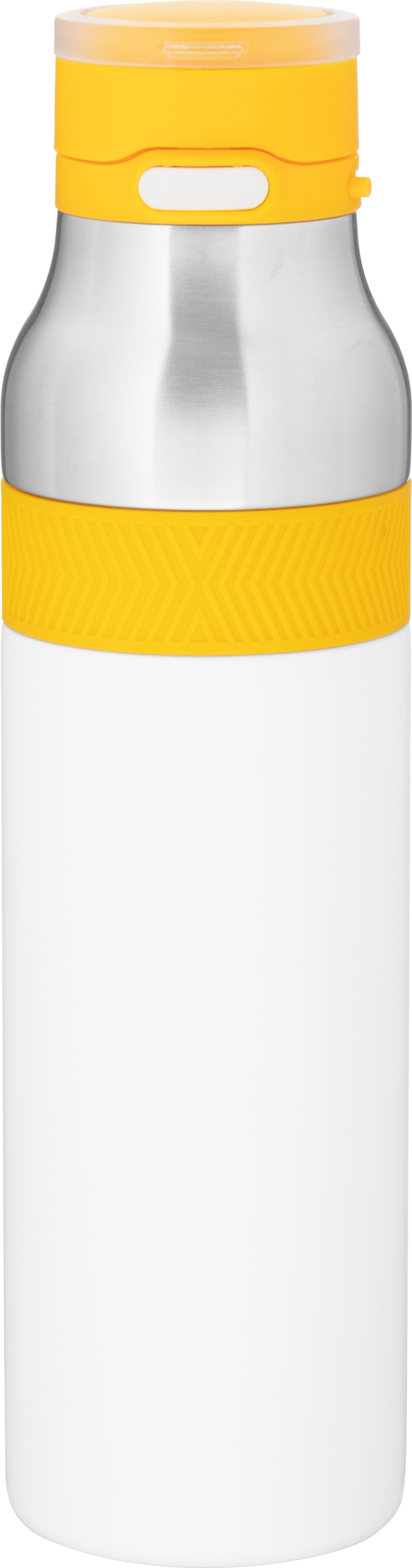 The h2go Jogger 20.9 oz thermal bottle is built for active lifestyles with secure insulation and a bold look. Made from double wall 18/8 stainless steel with copper vacuum insulation, it keeps beverages hot or cold for hours. It features a threaded lid with a push-button locking mechanism, an integrated carrying handle, and a pop of color accent for added style. Finished with a durable powder coated exterior for grip and durability.