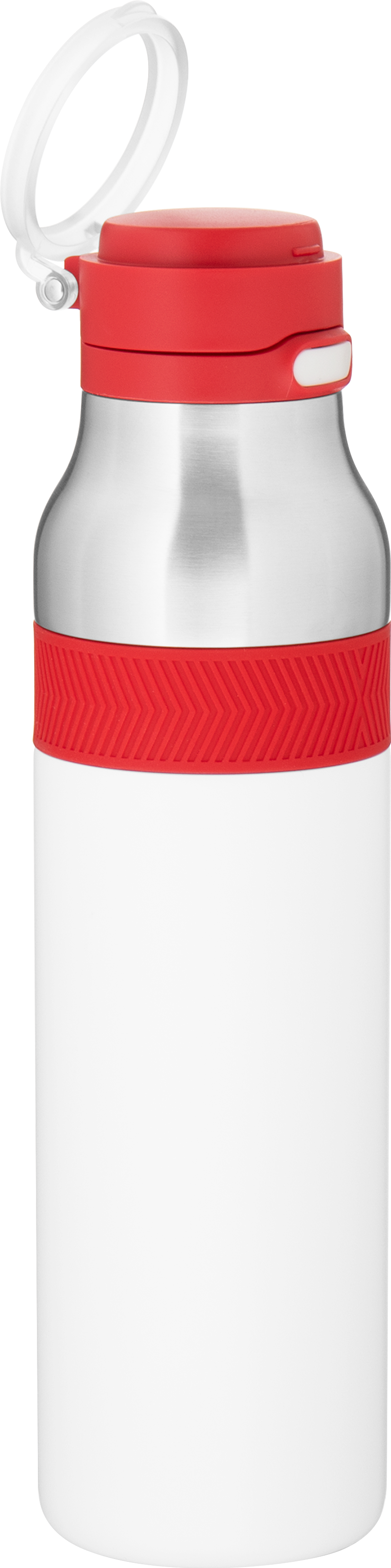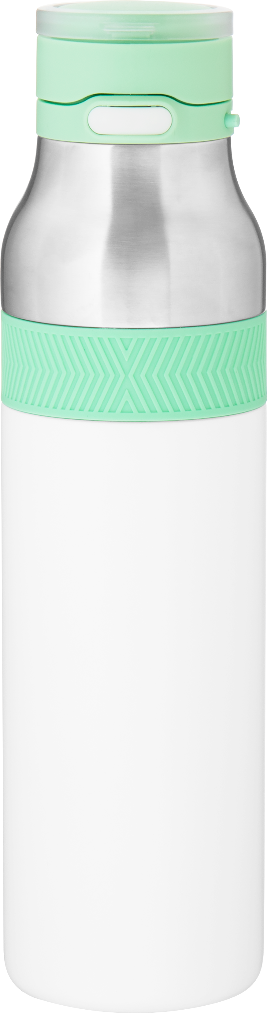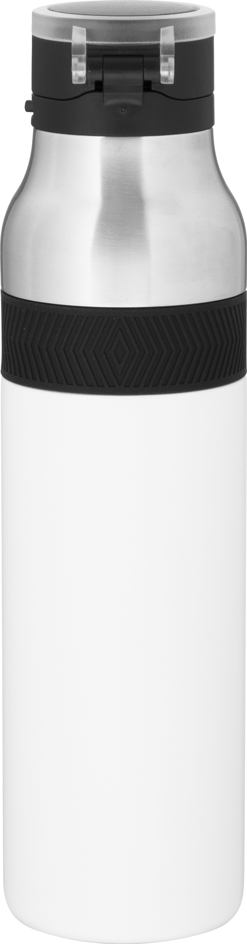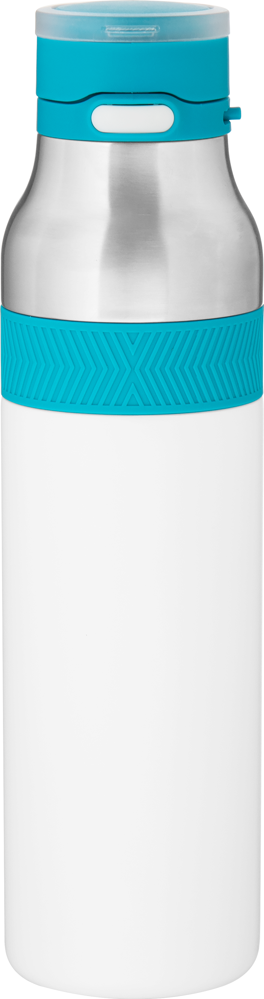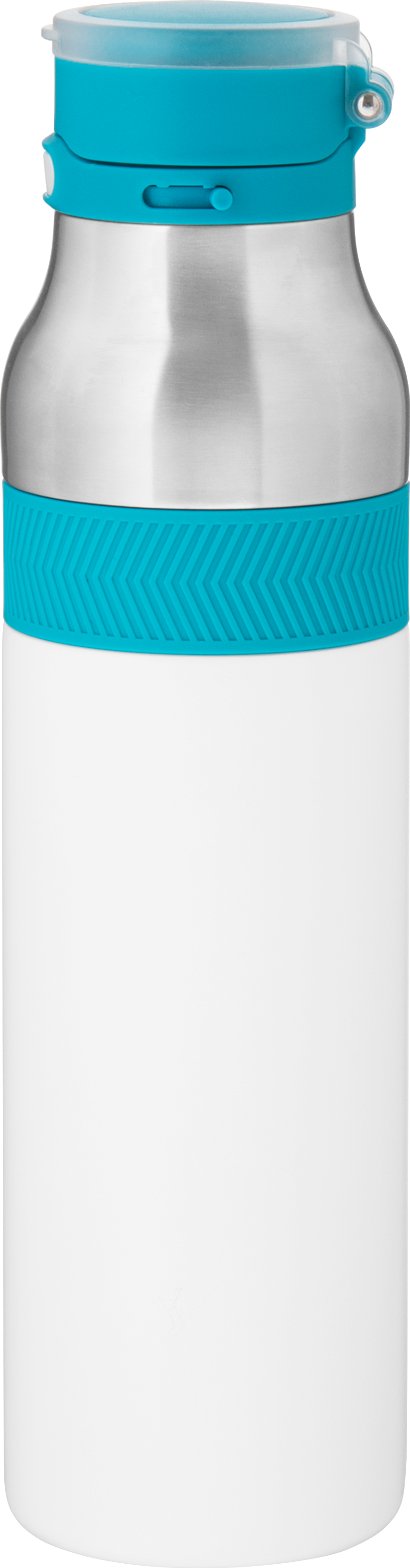 The h2go Jogger 20.9 oz thermal bottle is built for active lifestyles with secure insulation and a bold look. Made from double wall 18/8 stainless steel with copper vacuum insulation, it keeps beverages hot or cold for hours. It features a threaded lid with a push-button locking mechanism, an integrated carrying handle, and a pop of color accent for added style. Finished with a durable powder coated exterior for grip and durability.