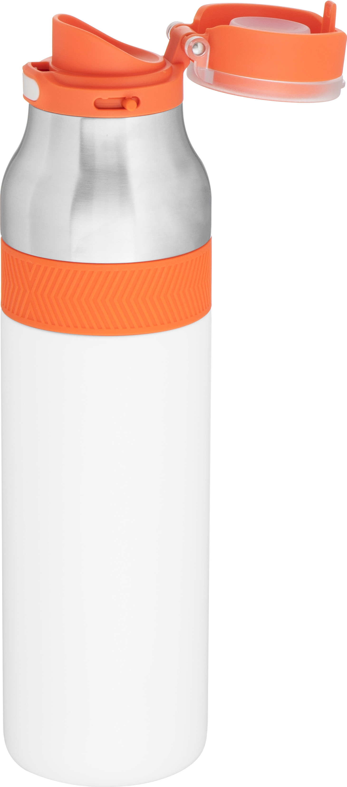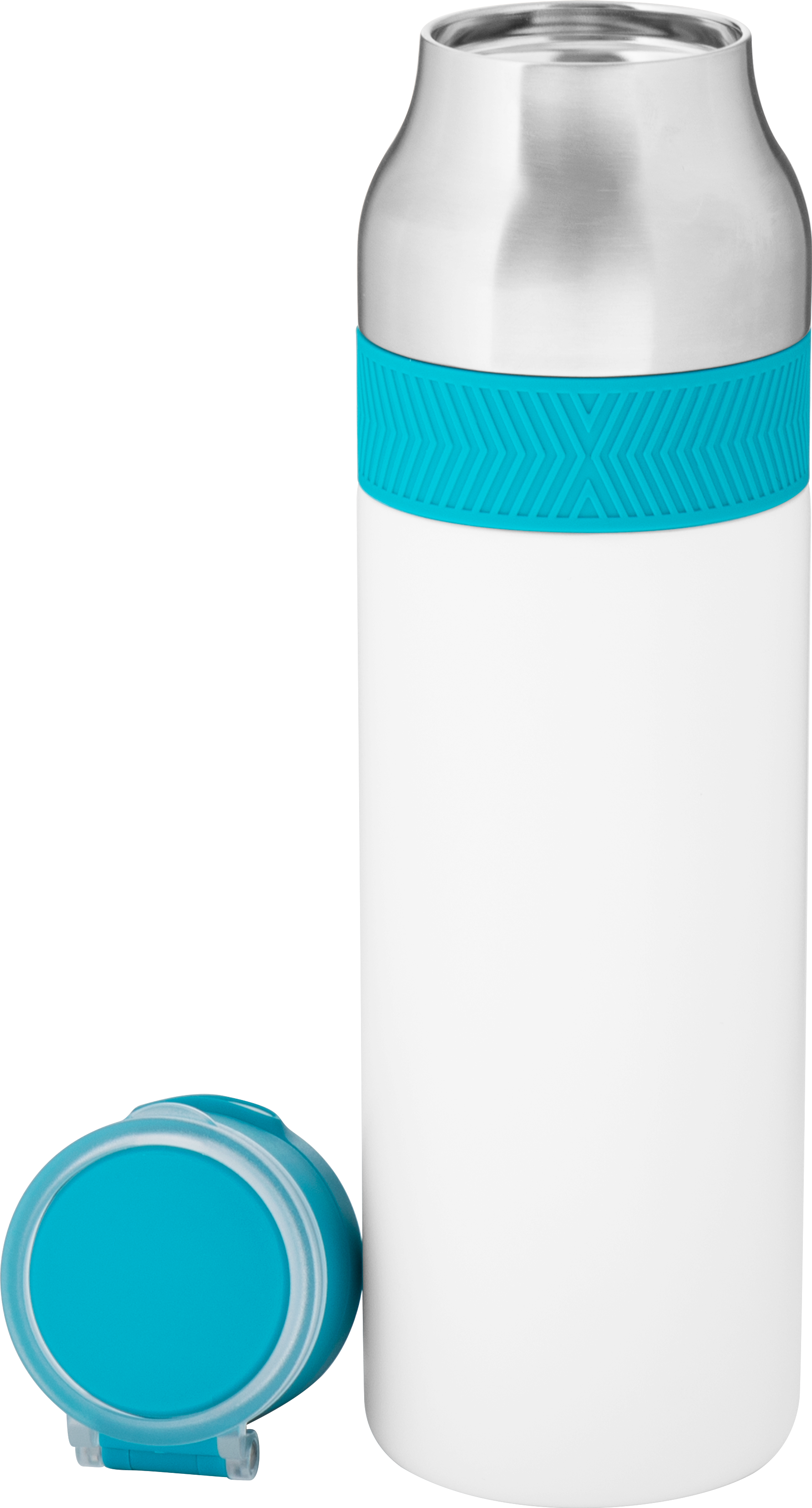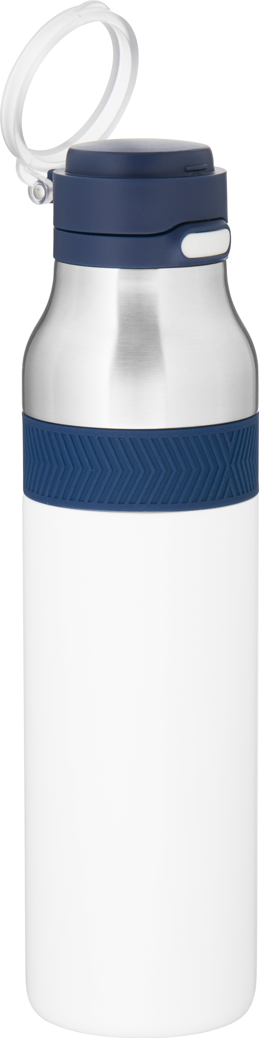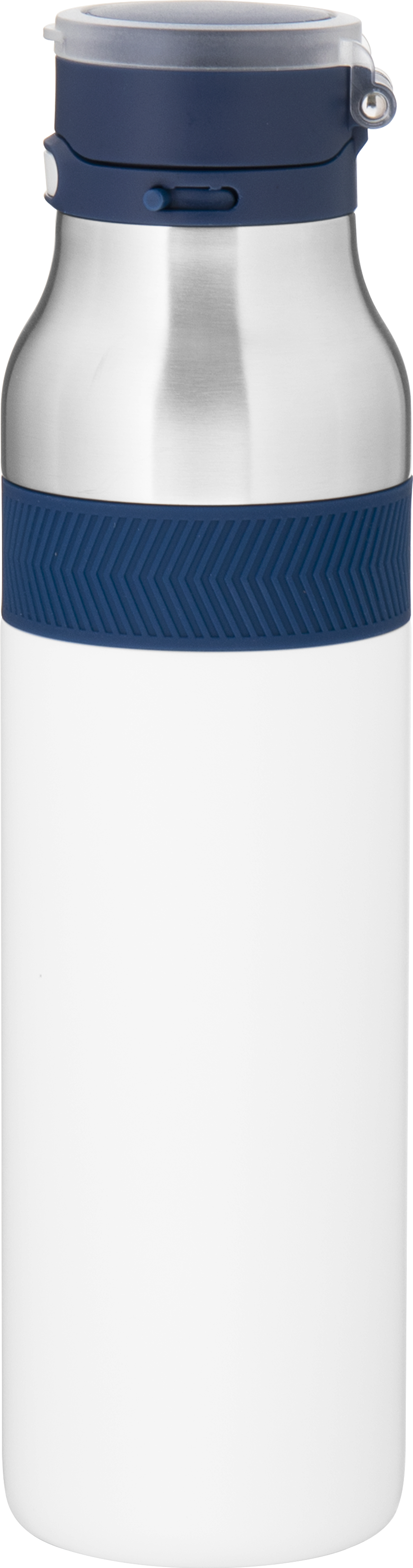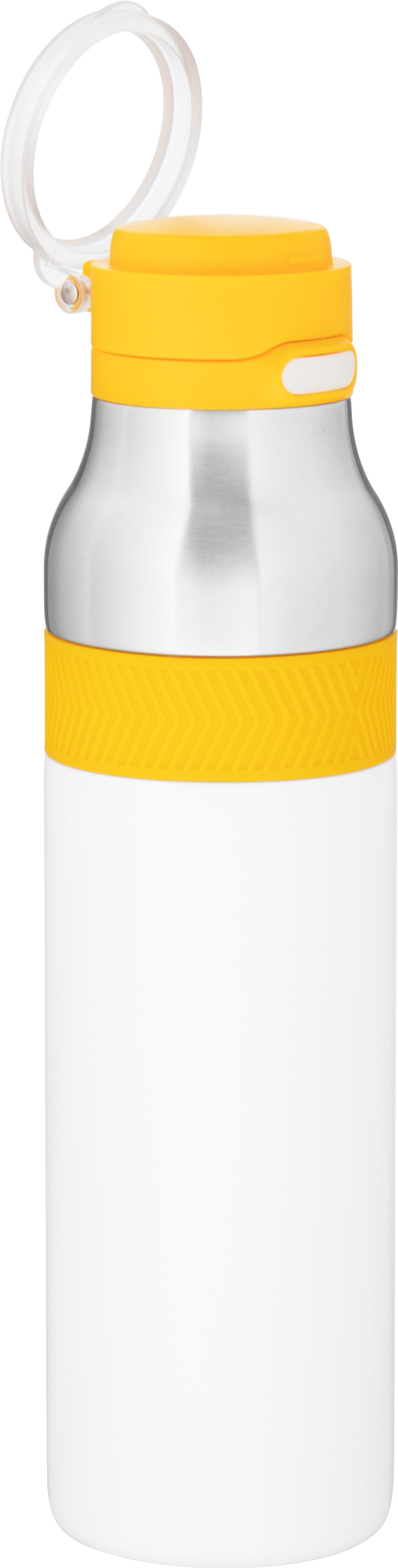 The h2go Jogger 20.9 oz thermal bottle is built for active lifestyles with secure insulation and a bold look. Made from double wall 18/8 stainless steel with copper vacuum insulation, it keeps beverages hot or cold for hours. It features a threaded lid with a push-button locking mechanism, an integrated carrying handle, and a pop of color accent for added style. Finished with a durable powder coated exterior for grip and durability.