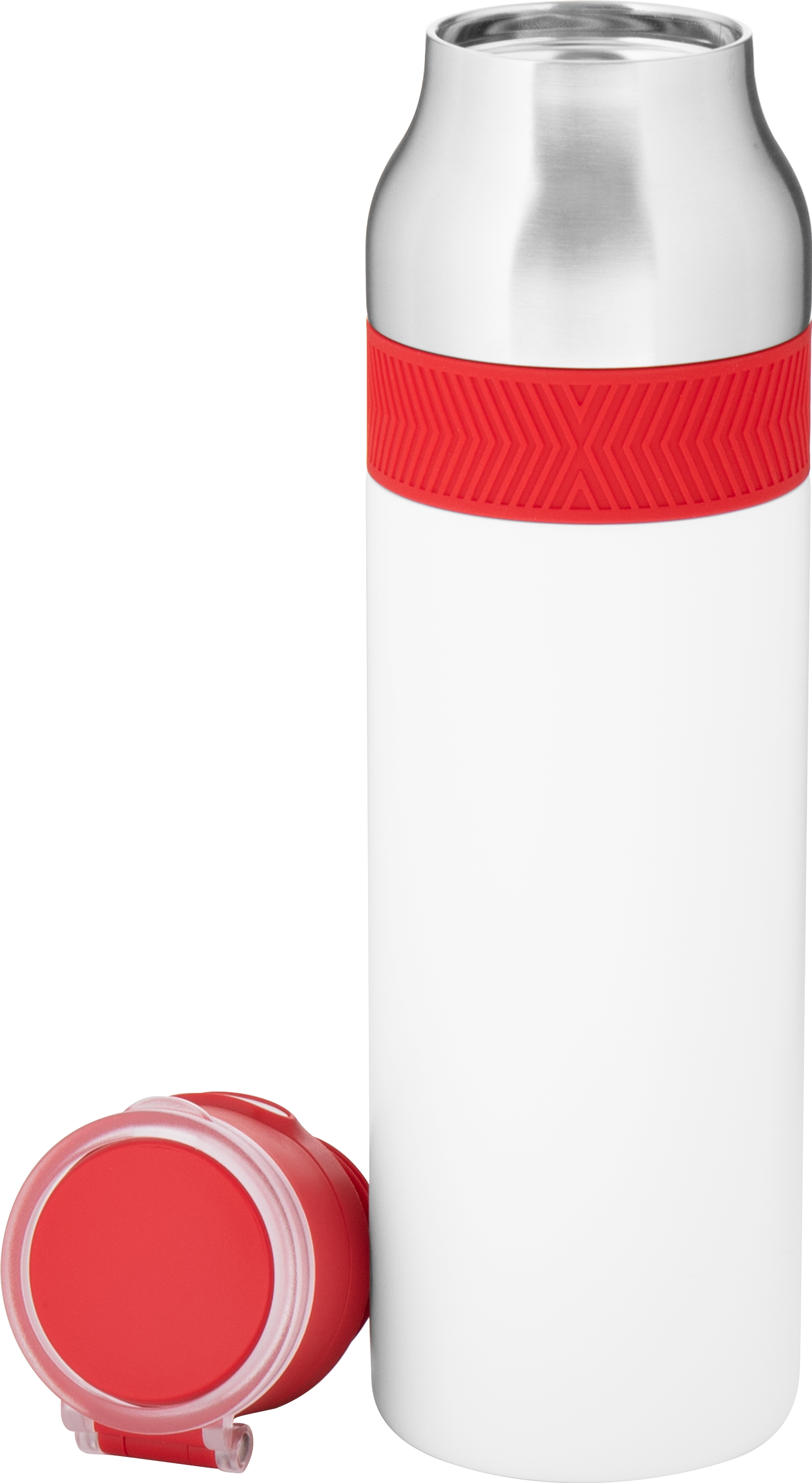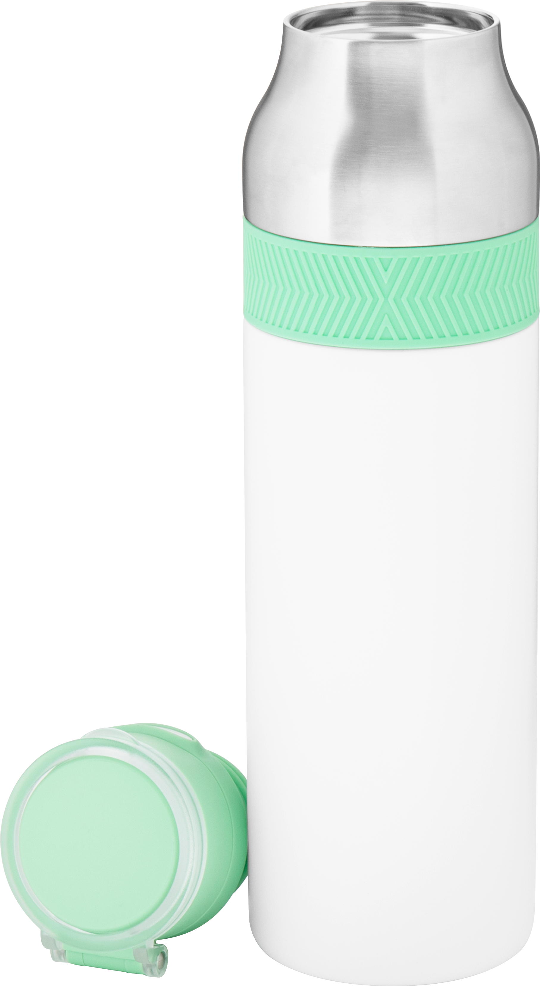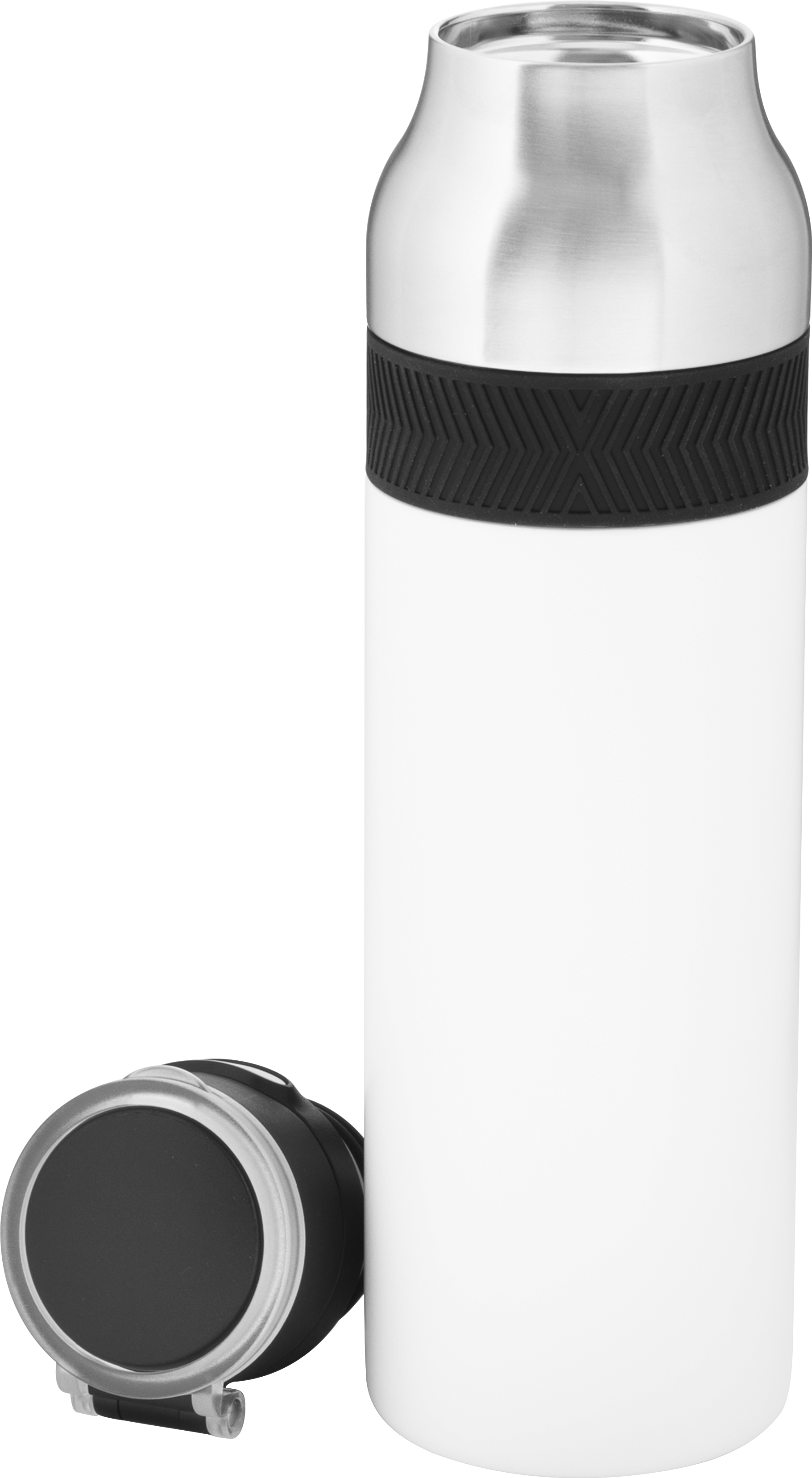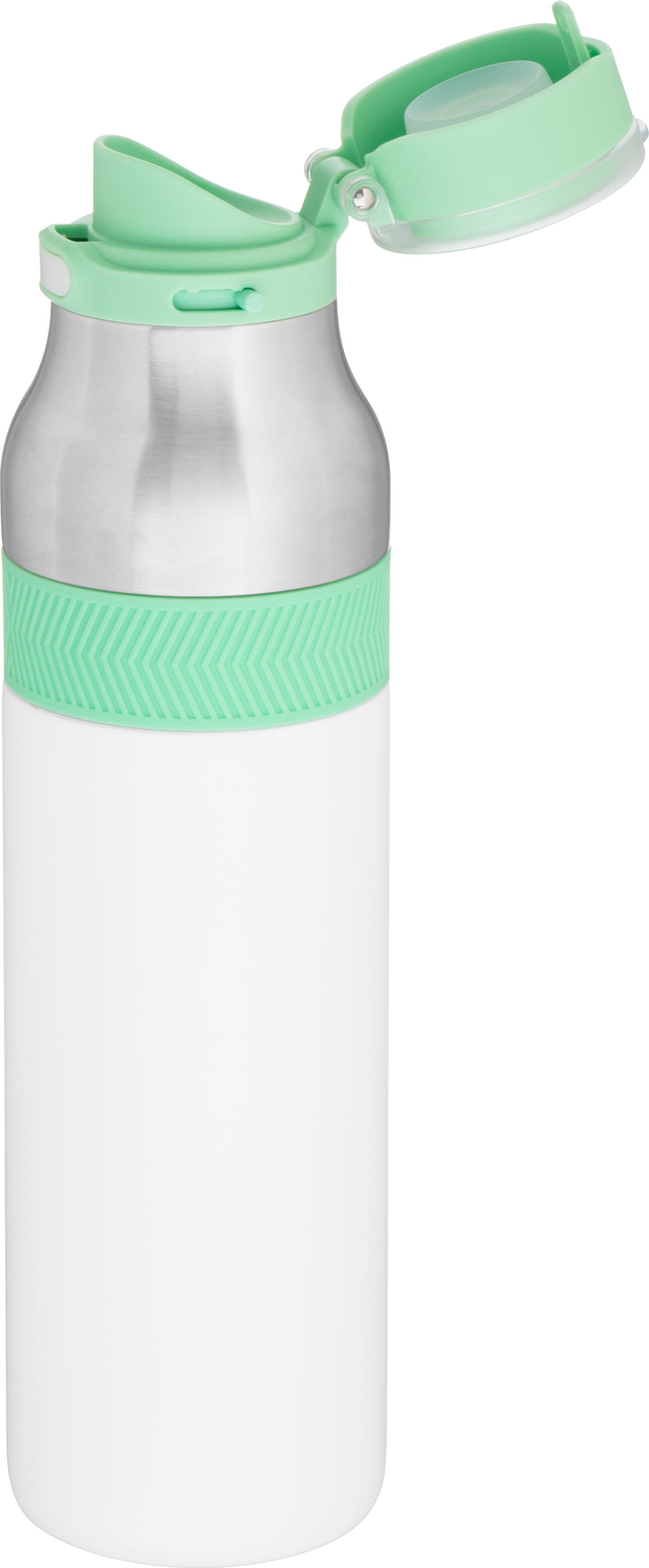 The h2go Jogger 20.9 oz thermal bottle is built for active lifestyles with secure insulation and a bold look. Made from double wall 18/8 stainless steel with copper vacuum insulation, it keeps beverages hot or cold for hours. It features a threaded lid with a push-button locking mechanism, an integrated carrying handle, and a pop of color accent for added style. Finished with a durable powder coated exterior for grip and durability.