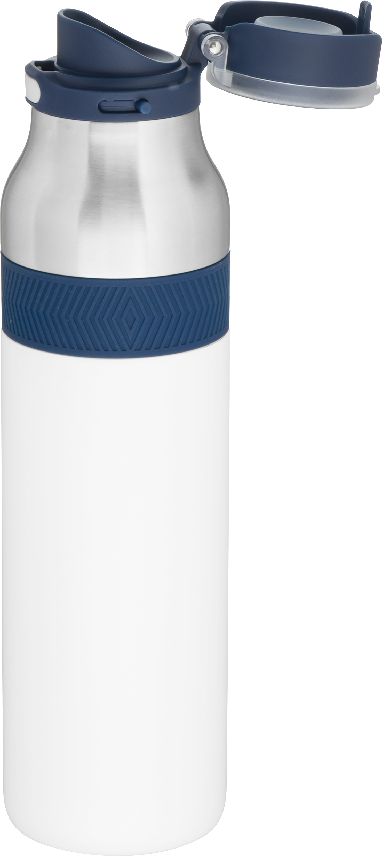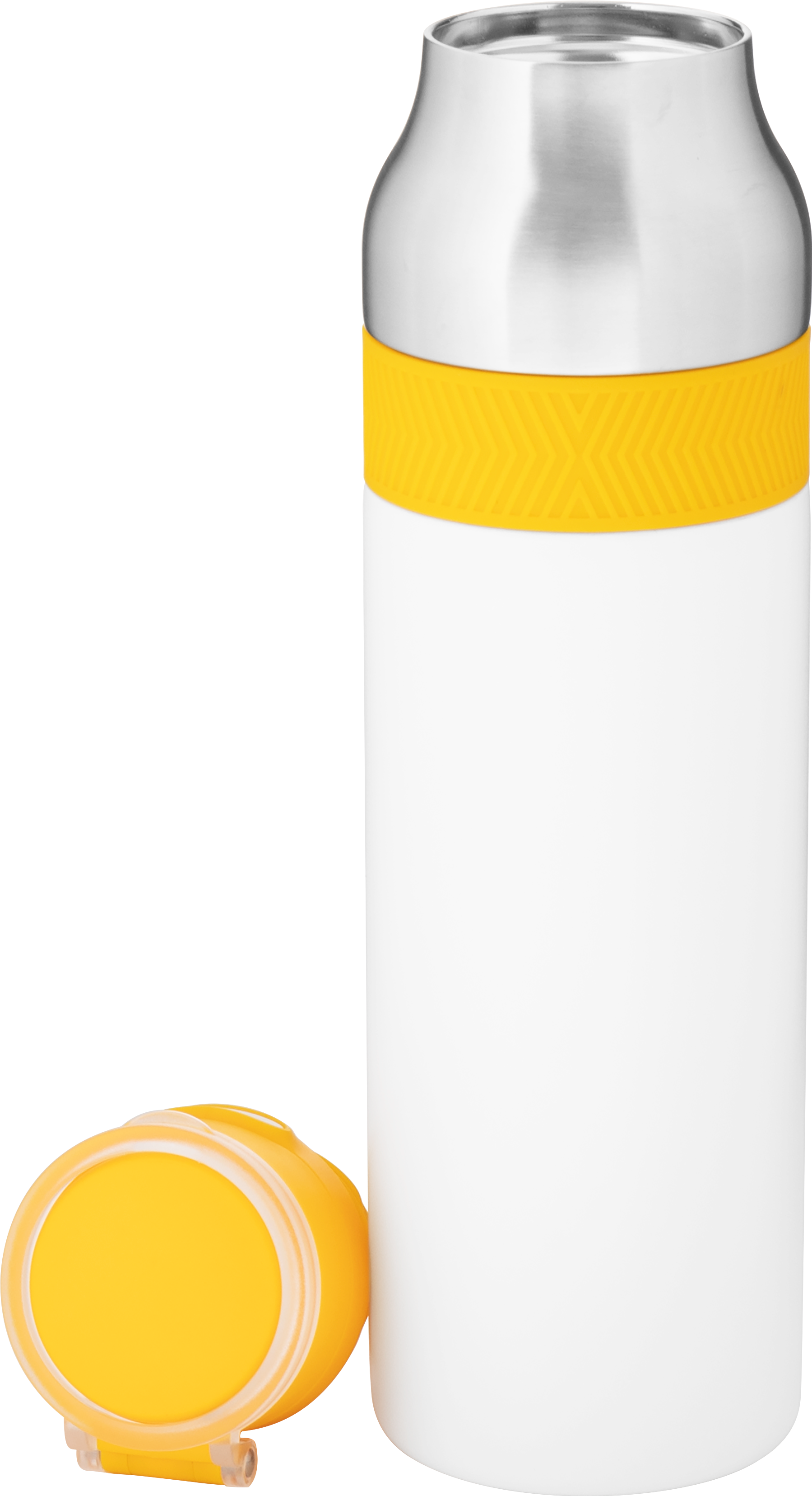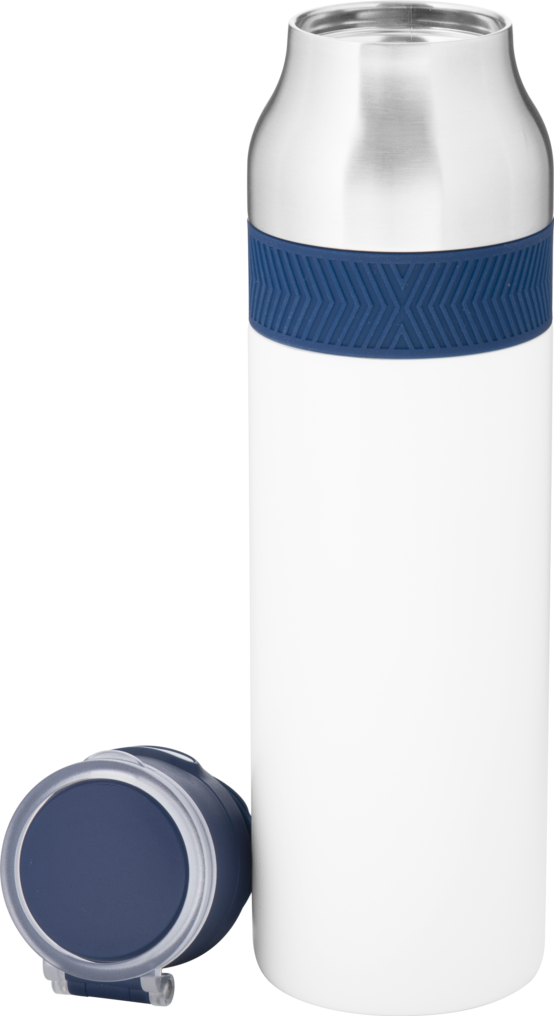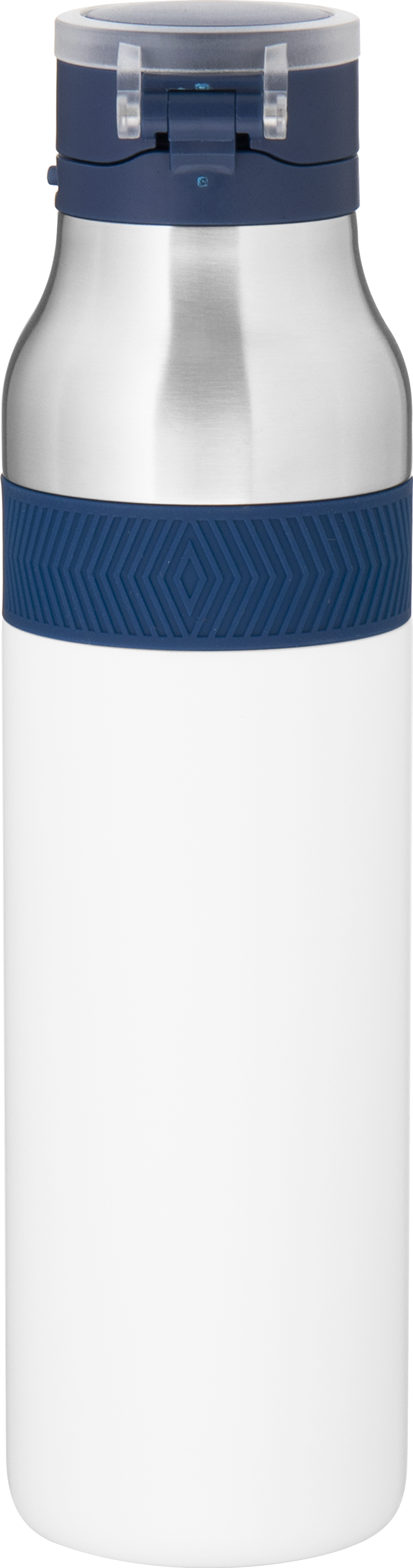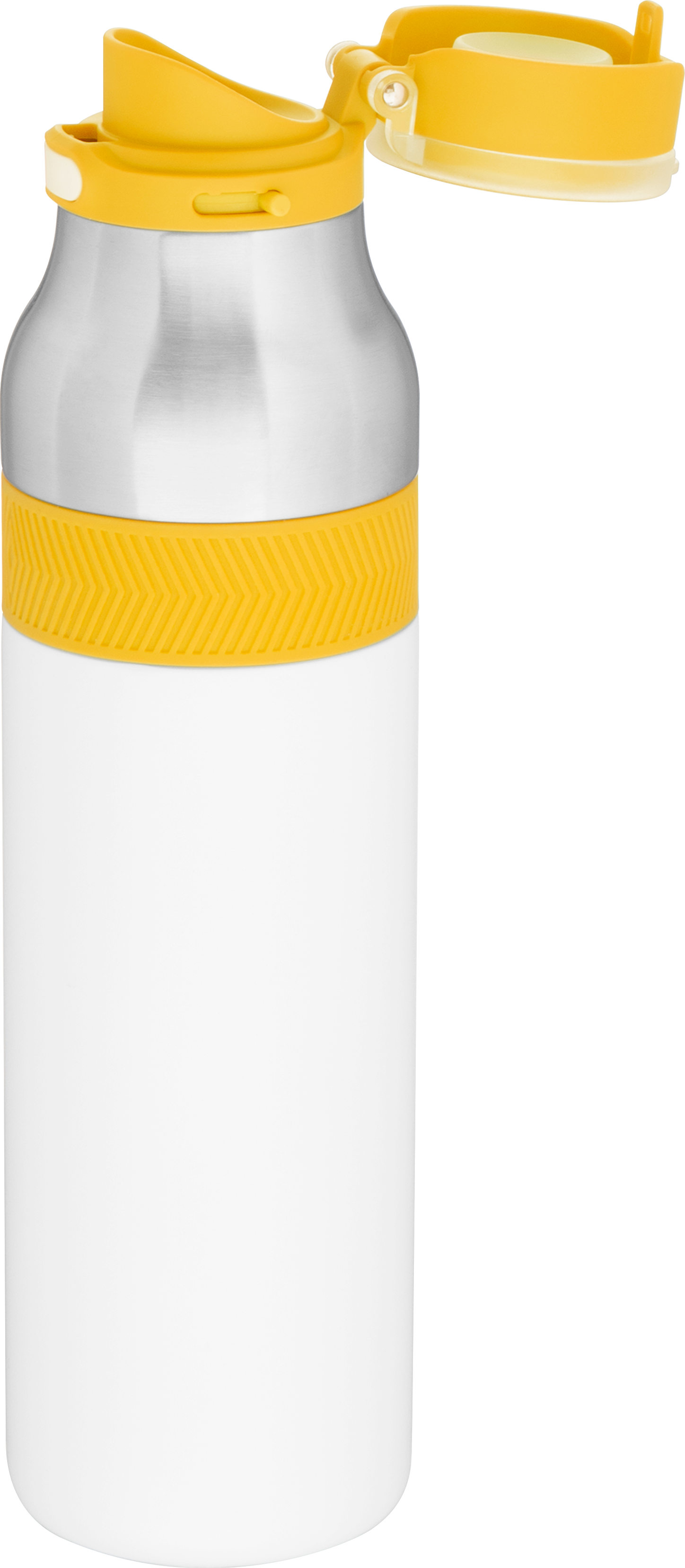 The h2go Jogger 20.9 oz thermal bottle is built for active lifestyles with secure insulation and a bold look. Made from double wall 18/8 stainless steel with copper vacuum insulation, it keeps beverages hot or cold for hours. It features a threaded lid with a push-button locking mechanism, an integrated carrying handle, and a pop of color accent for added style. Finished with a durable powder coated exterior for grip and durability.