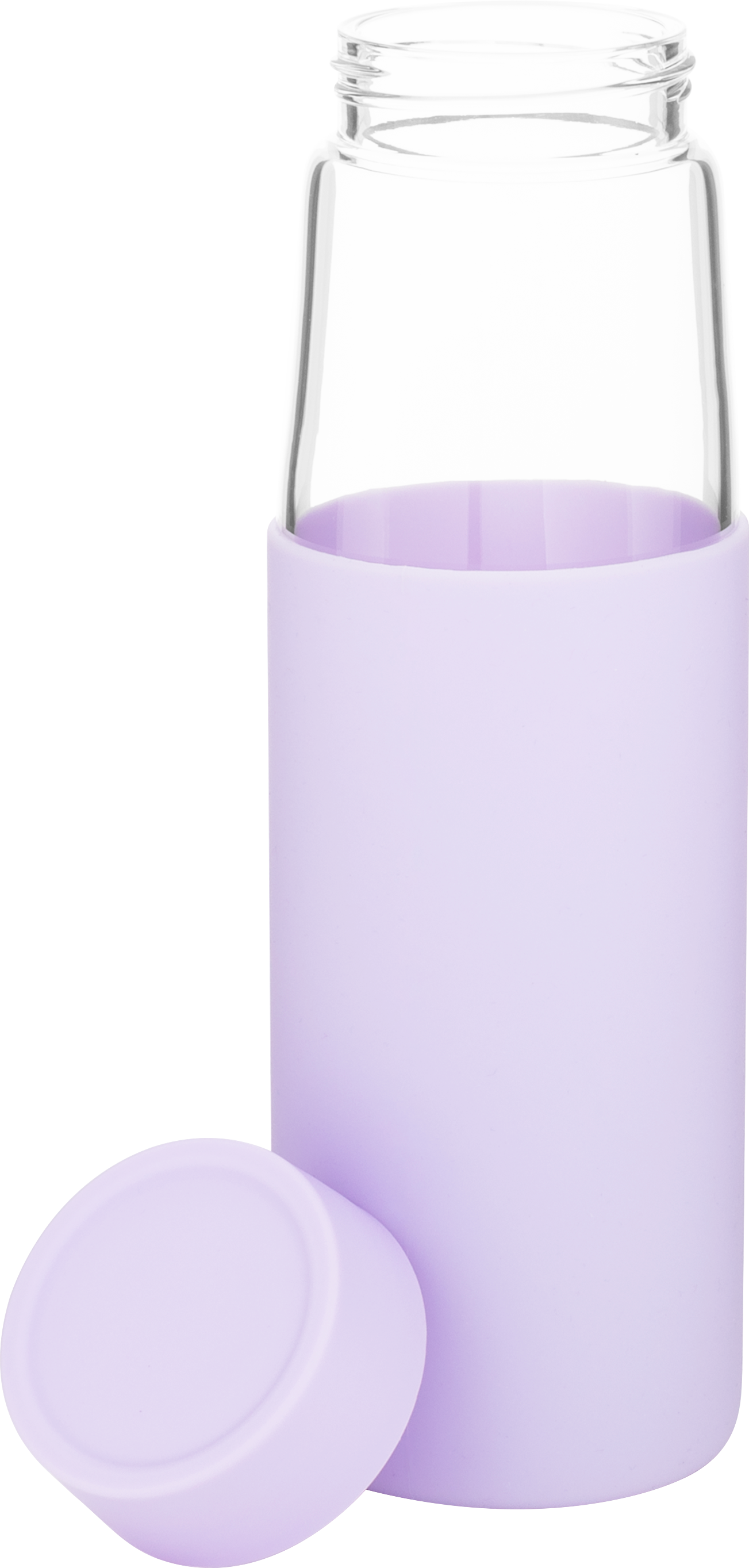 The h2go Sloan 20 oz glass bottle delivers clean, modern hydration with a stylish touch. Made from single wall borosilicate glass, it features a threaded lid for secure closure and a matching protective silicone sleeve for grip and impact resistance. Ideal for cold beverages at home, work, or on the go.