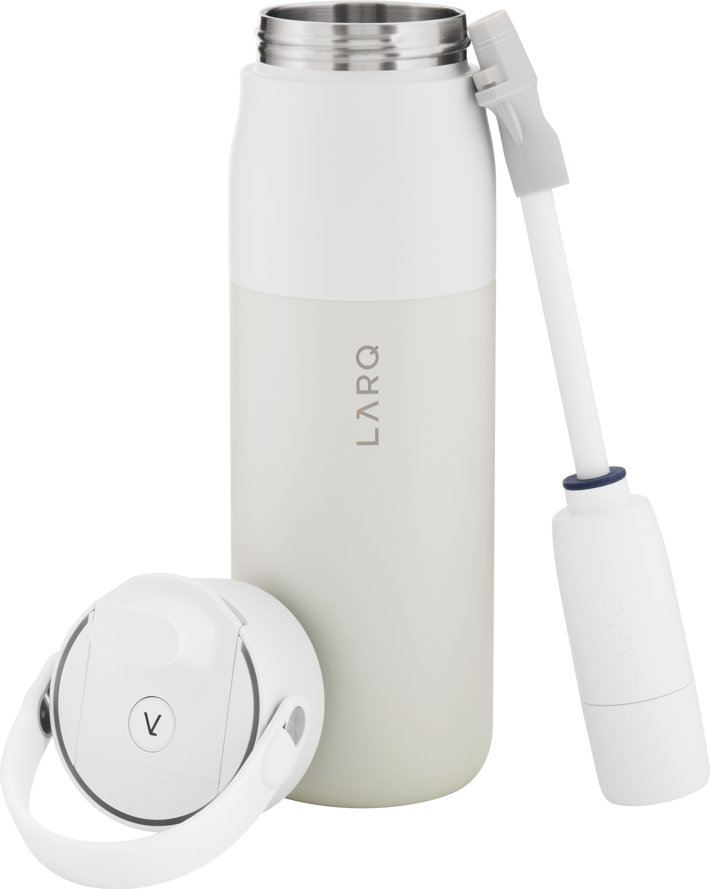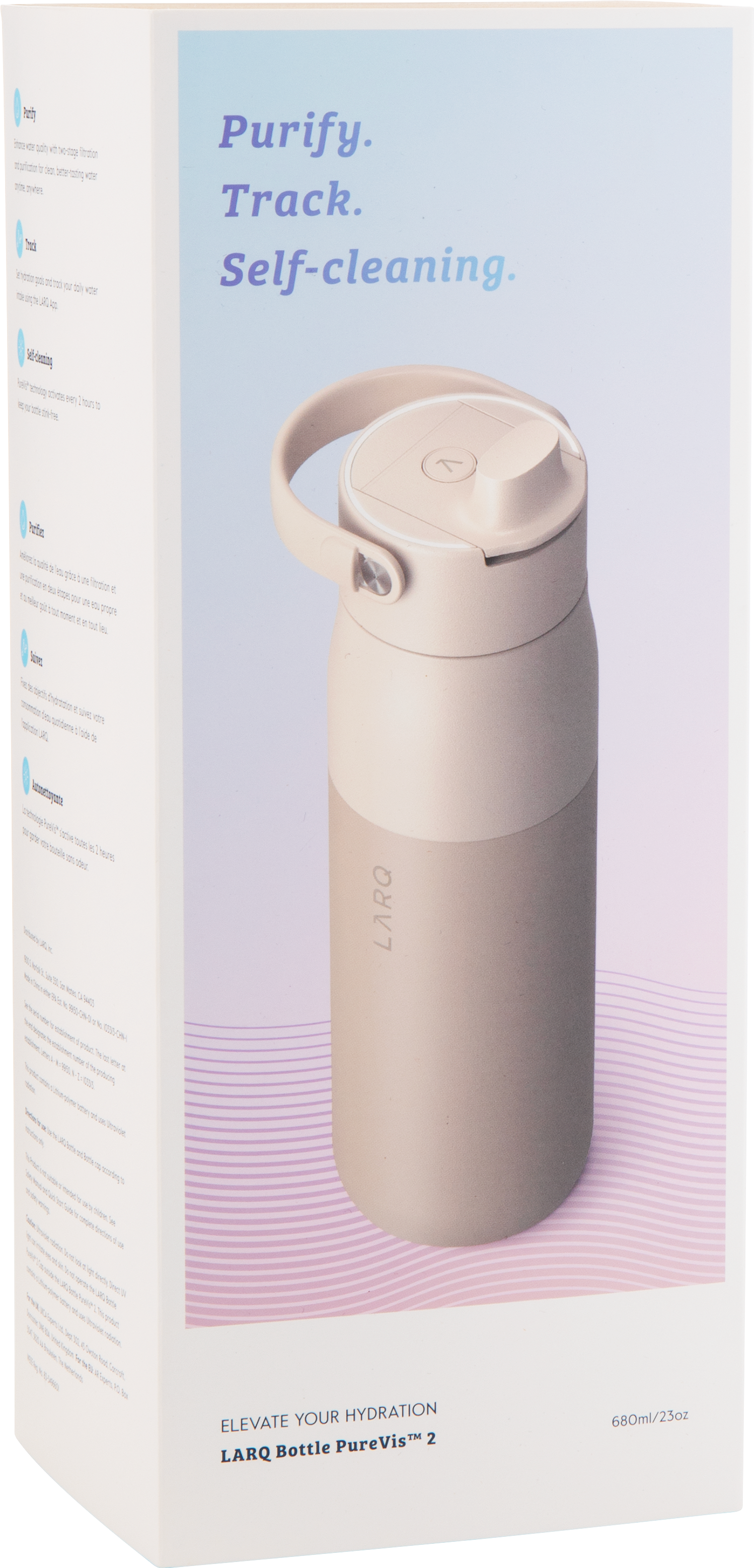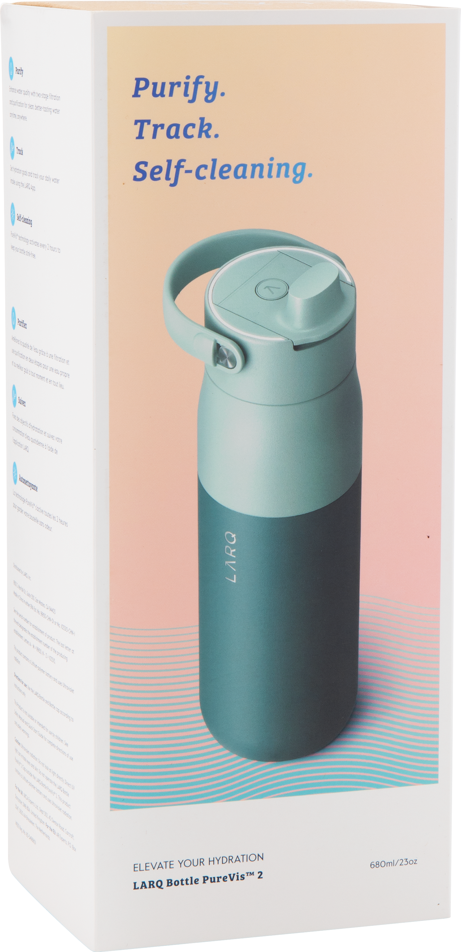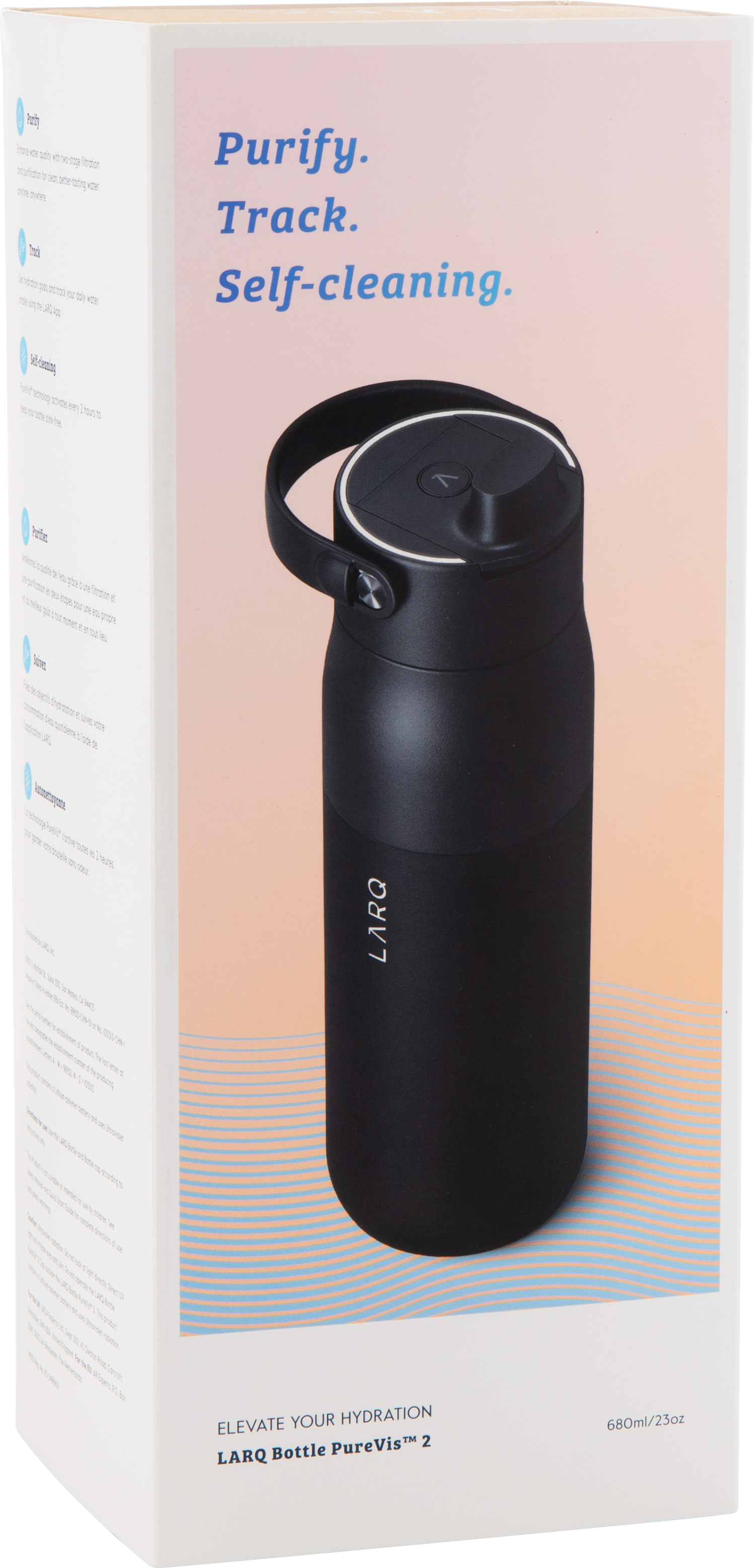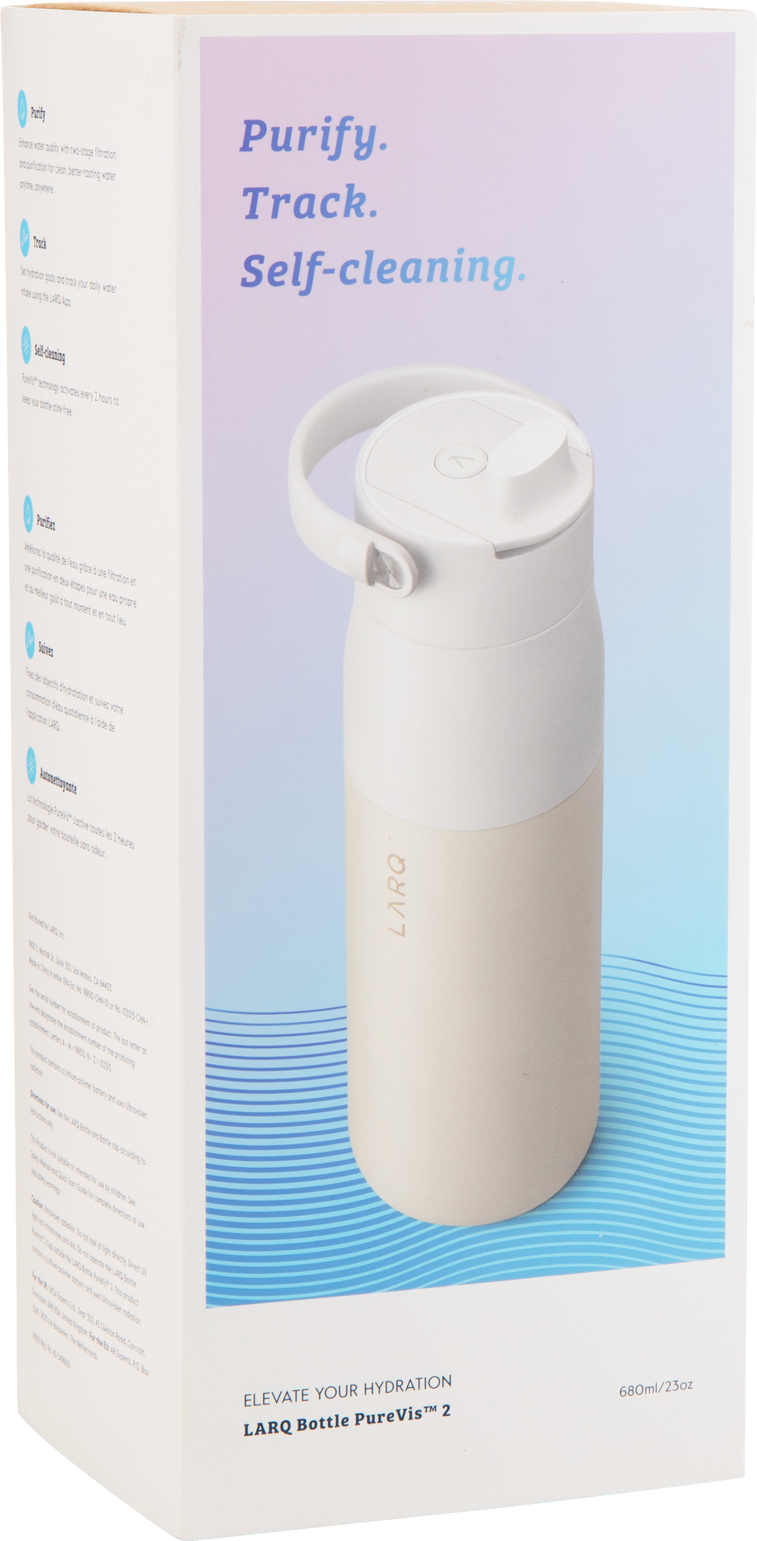 The LARQ PureVis 2 23 oz bottle redefines clean drinking on the go. Crafted from premium electropolished 18/8 stainless steel with double wall construction and vacuum insulation, it keeps beverages cold for hours. It features a threaded lid with a swig top cap, an inner straw with a silicone holder, and a soft removable carrying handle for easy transport. Powered by 280nm PureVis™ UV-C LED technology and a Nano Zero filtration system, it neutralizes bacteria and improves taste with every sip. Finished with a durable powder coated exterior, this smart bottle combines innovation, function, and style.