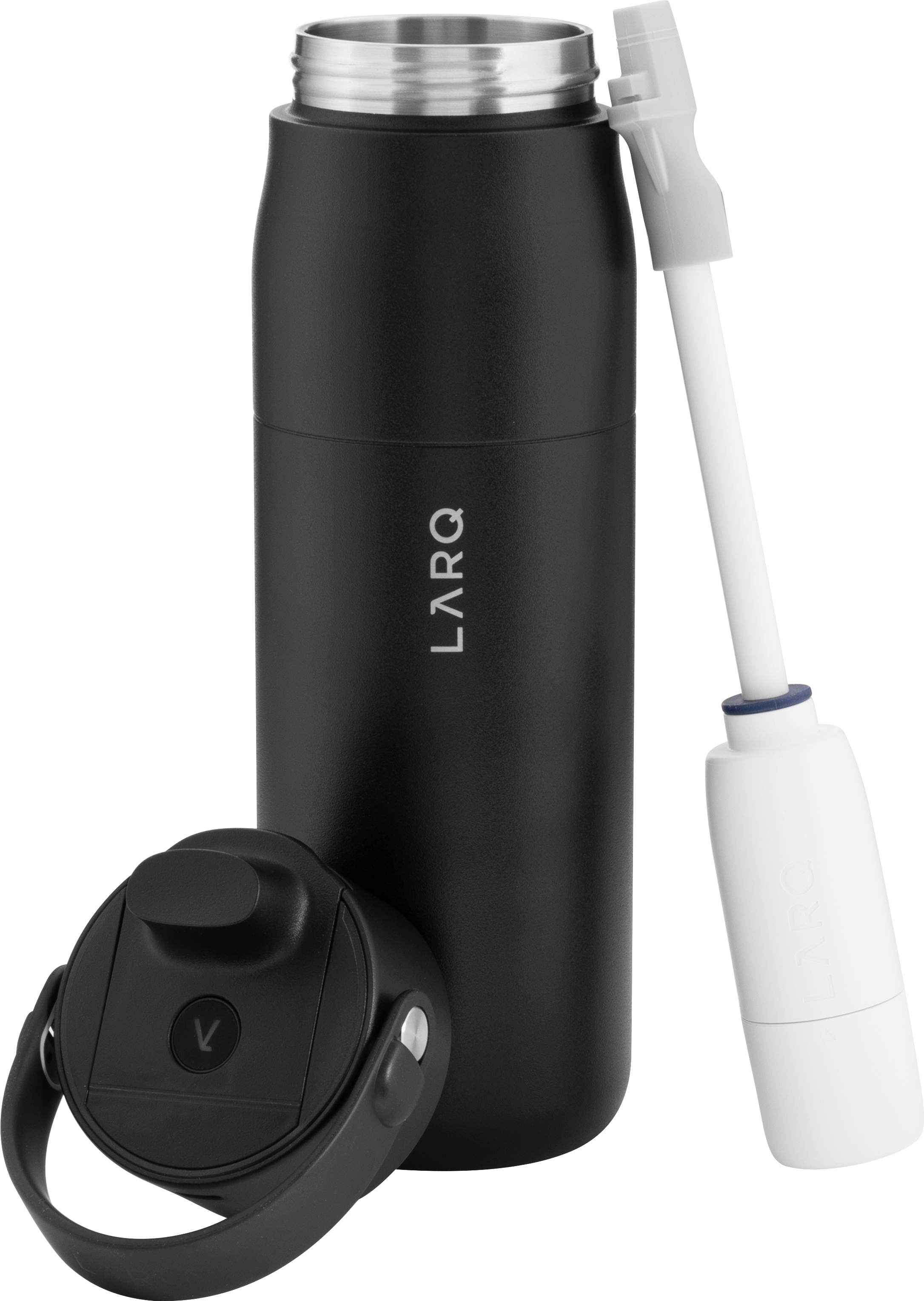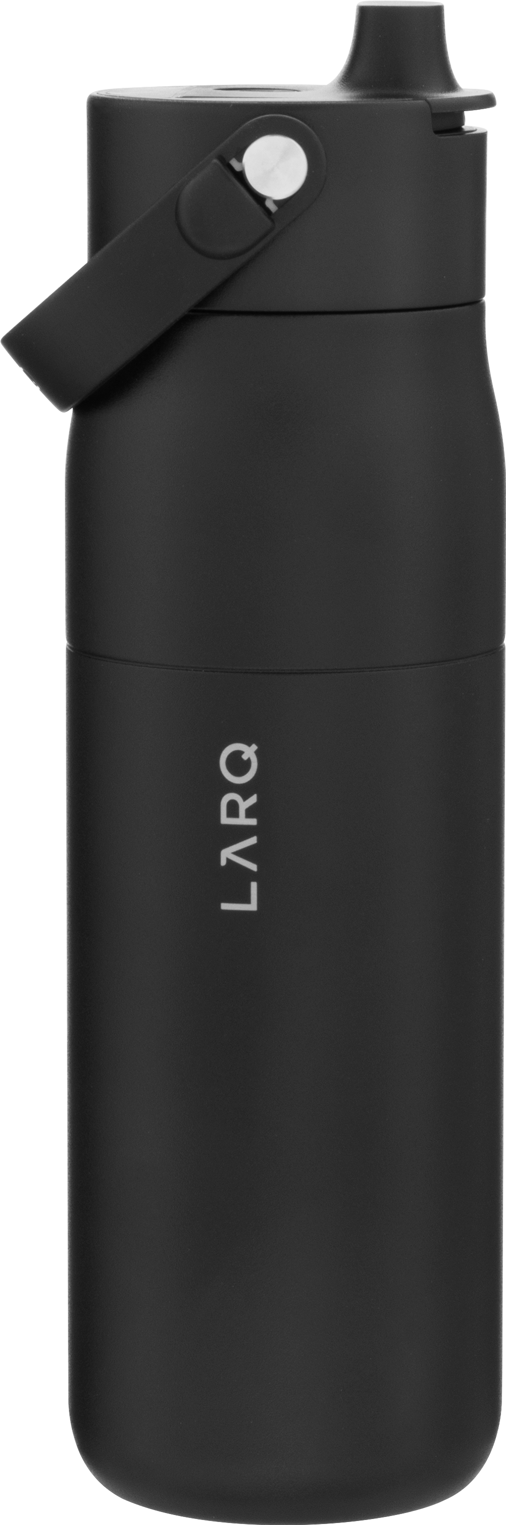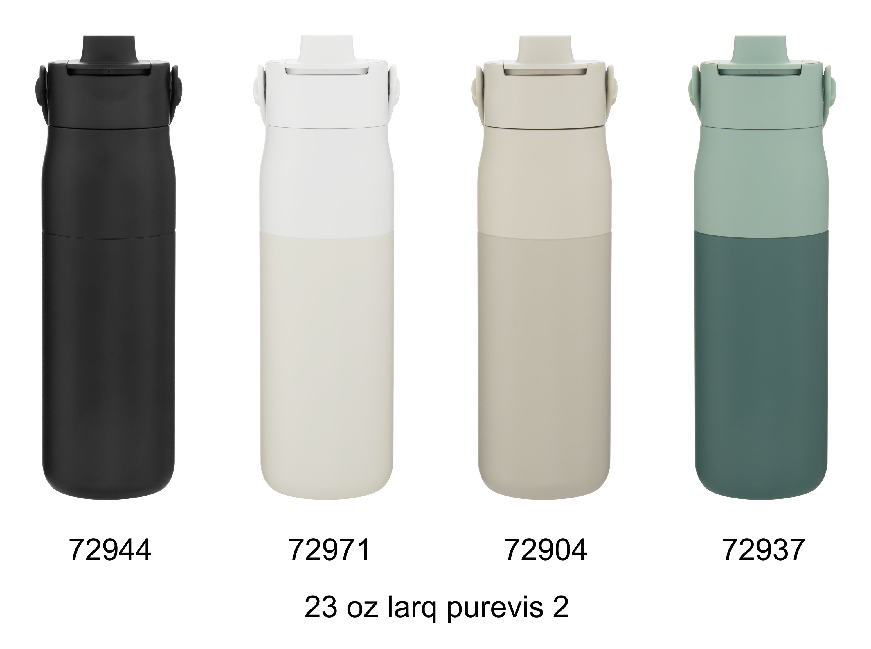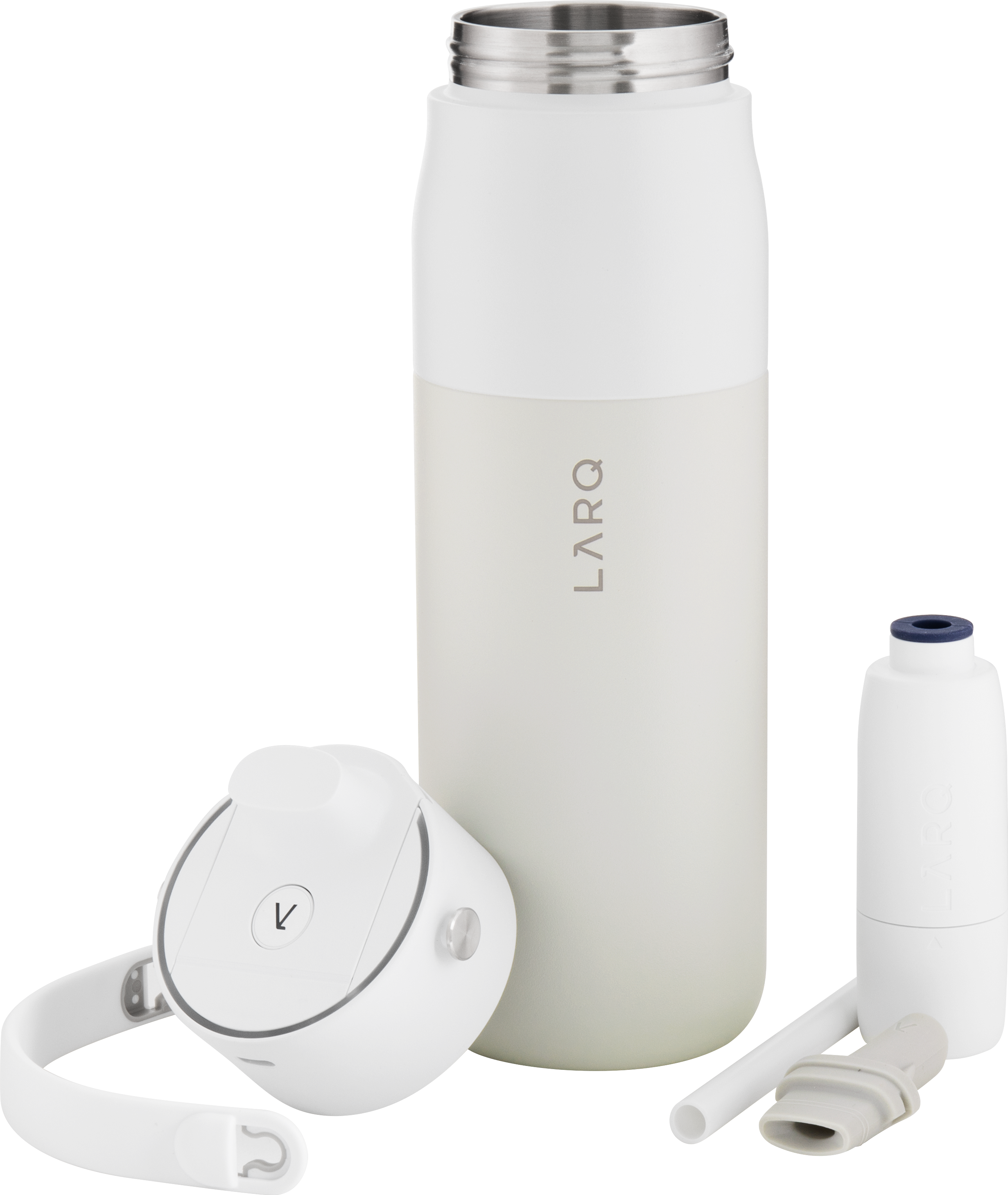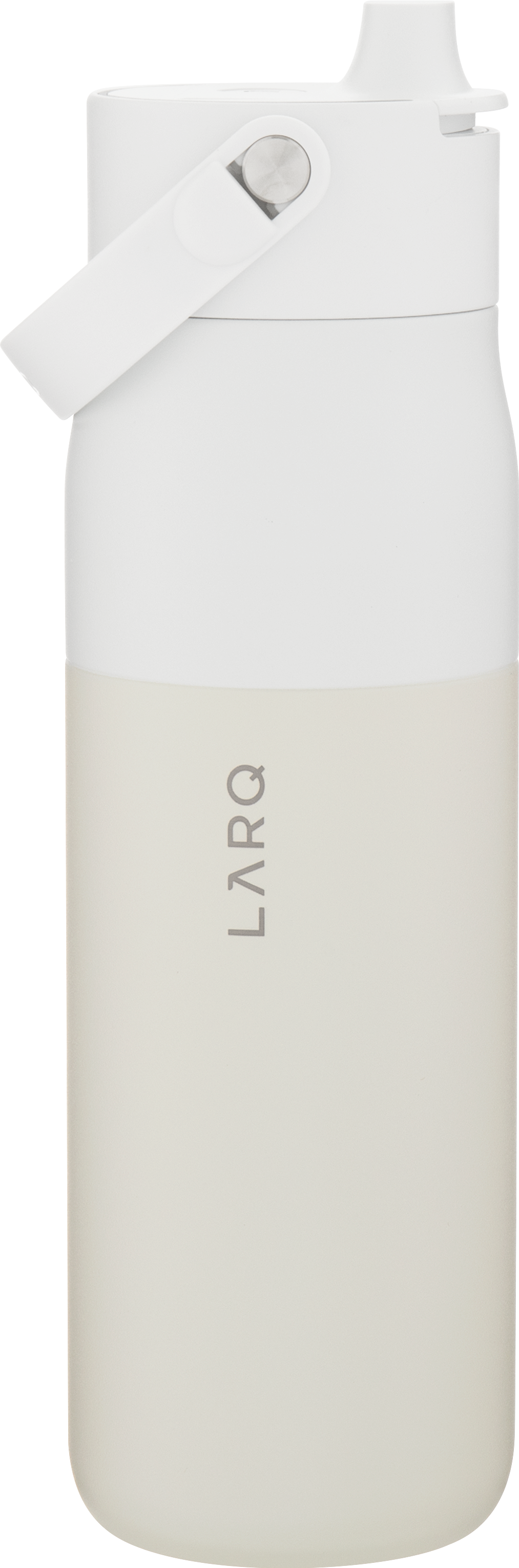The LARQ PureVis 2 23 oz bottle redefines clean drinking on the go. Crafted from premium electropolished 18/8 stainless steel with double wall construction and vacuum insulation, it keeps beverages cold for hours. It features a threaded lid with a swig top cap, an inner straw with a silicone holder, and a soft removable carrying handle for easy transport. Powered by 280nm PureVis™ UV-C LED technology and a Nano Zero filtration system, it neutralizes bacteria and improves taste with every sip. Finished with a durable powder coated exterior, this smart bottle combines innovation, function, and style.