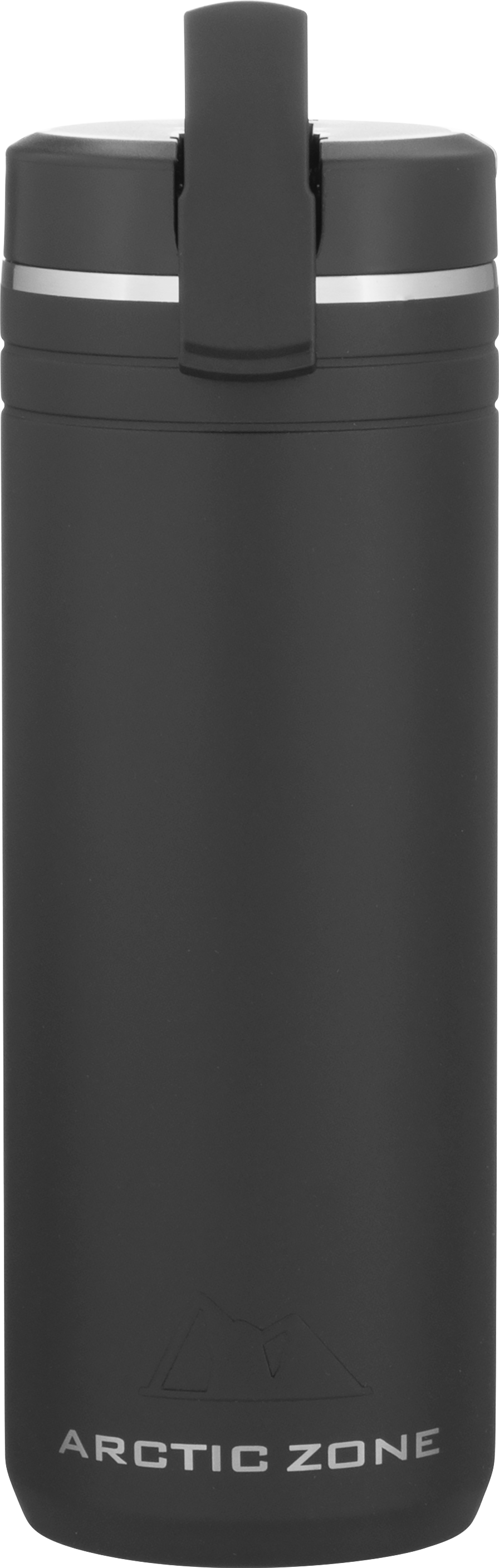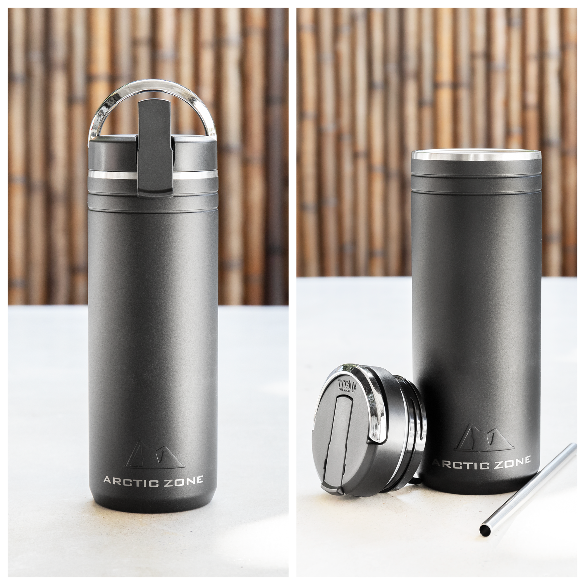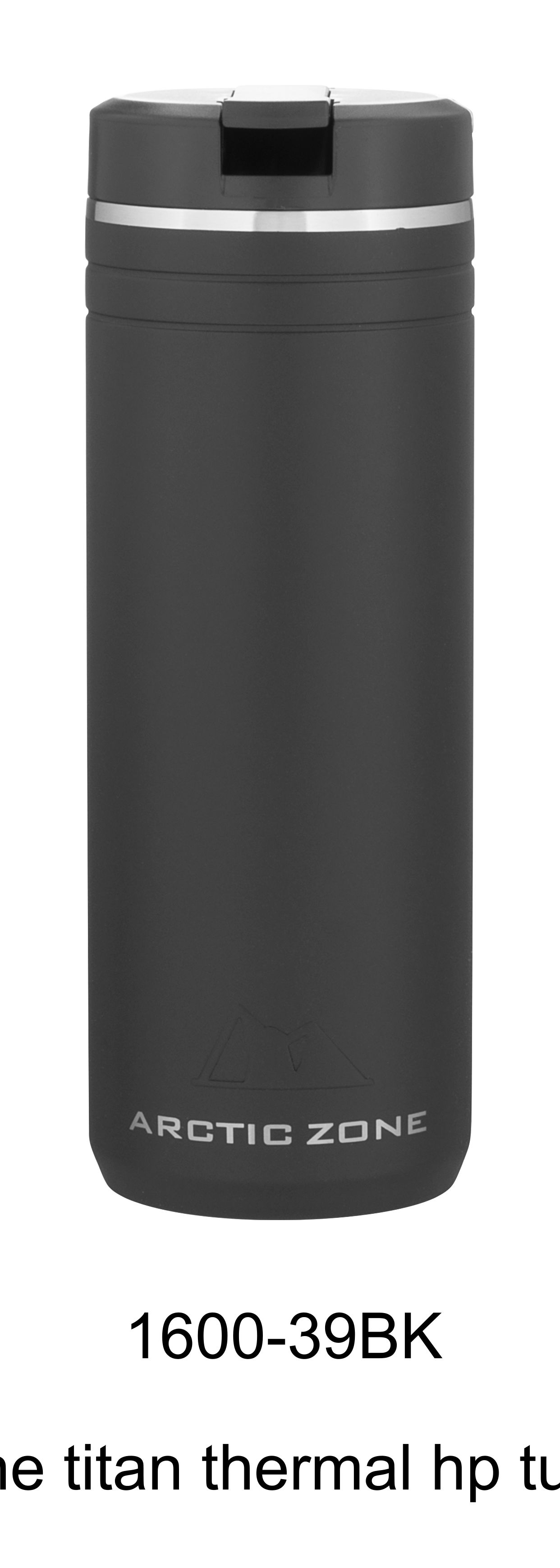 The Arctic Zone® Titan Thermal HP 24 oz tumbler is built for performance and convenience. Constructed from durable 18/8 stainless steel with double wall construction and copper vacuum insulation, it keeps beverages hot or cold for hours. It features a threaded lid with a flip-up spout, a built-in carrying handle, and a stainless steel rim for added durability. Finished with a powder coated exterior, this tumbler is ready for everyday hydration, workouts, or travel.