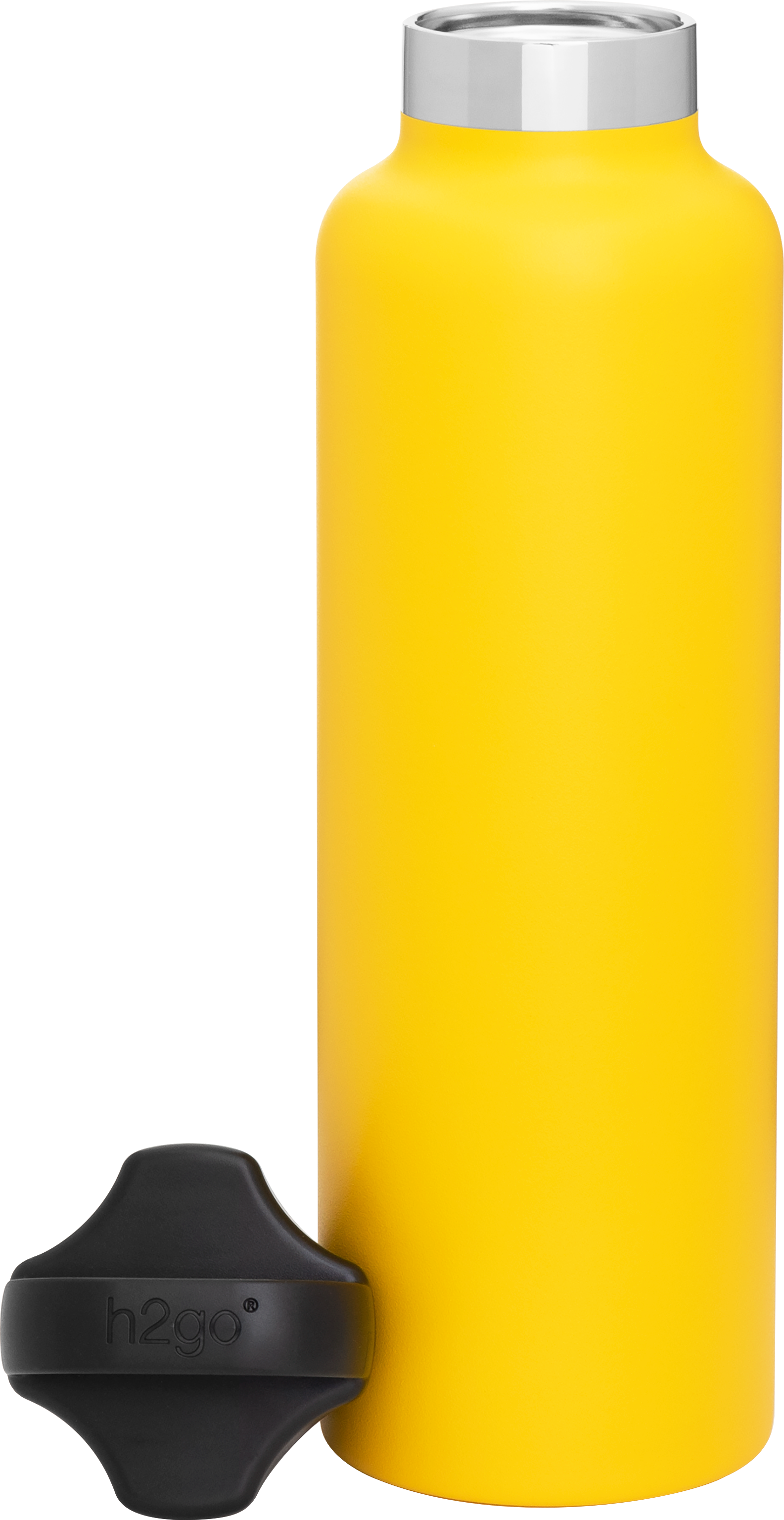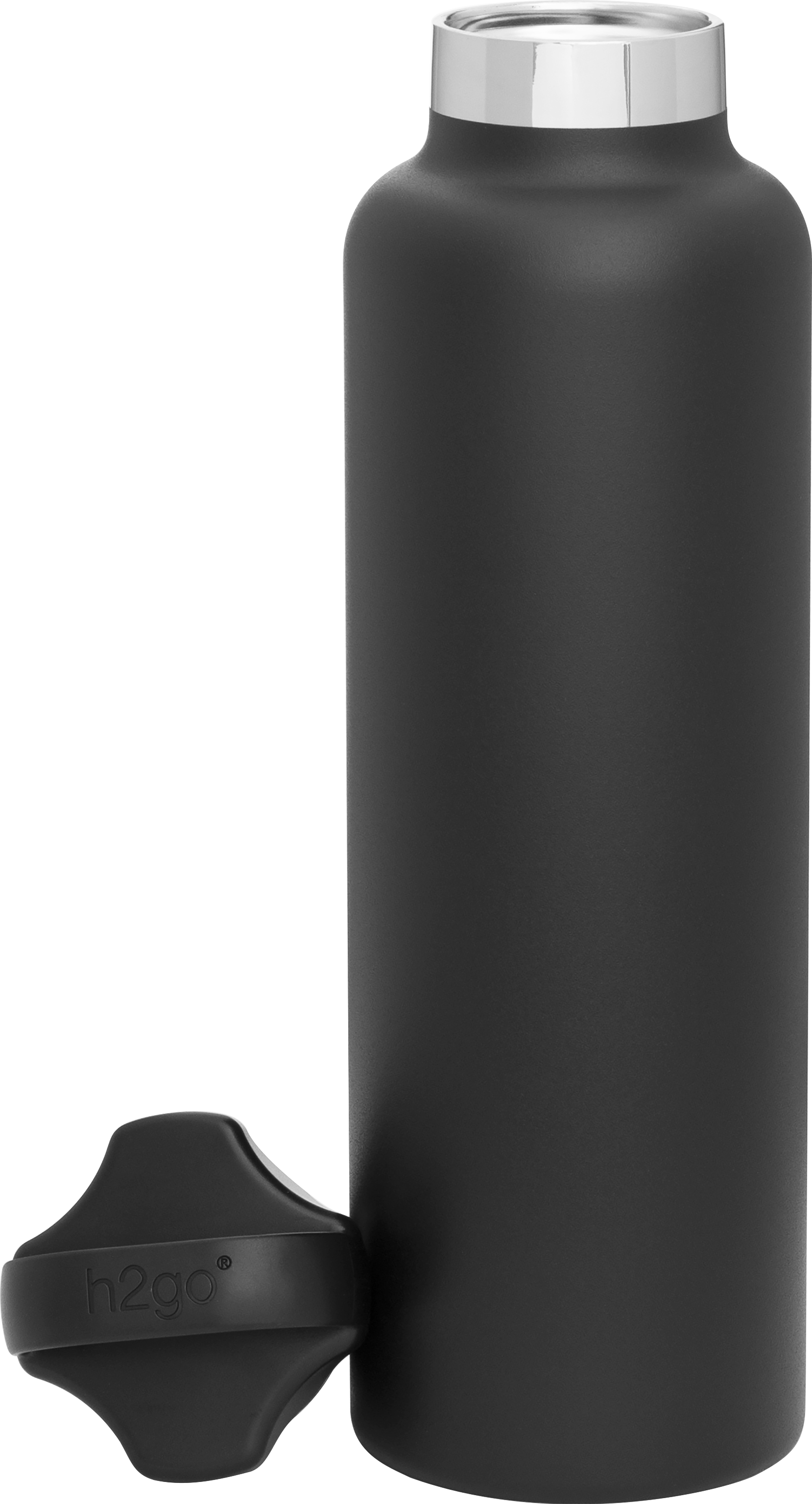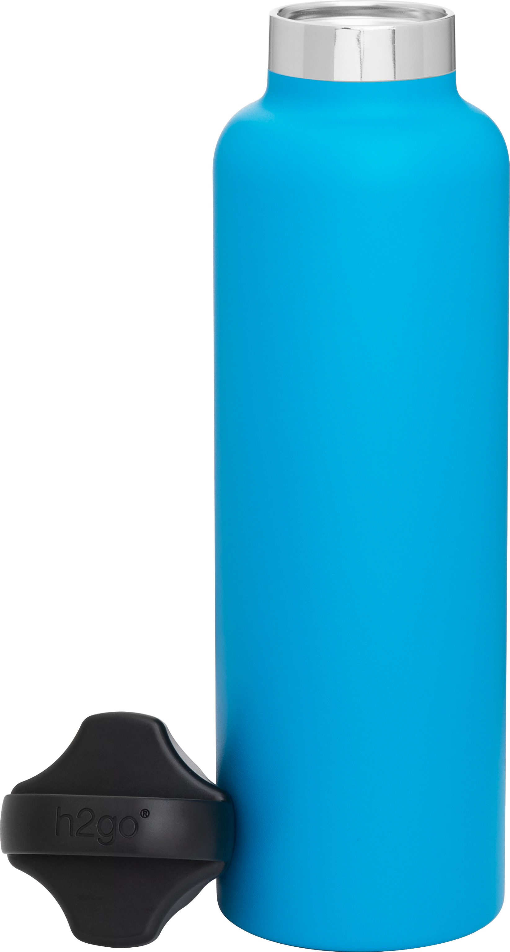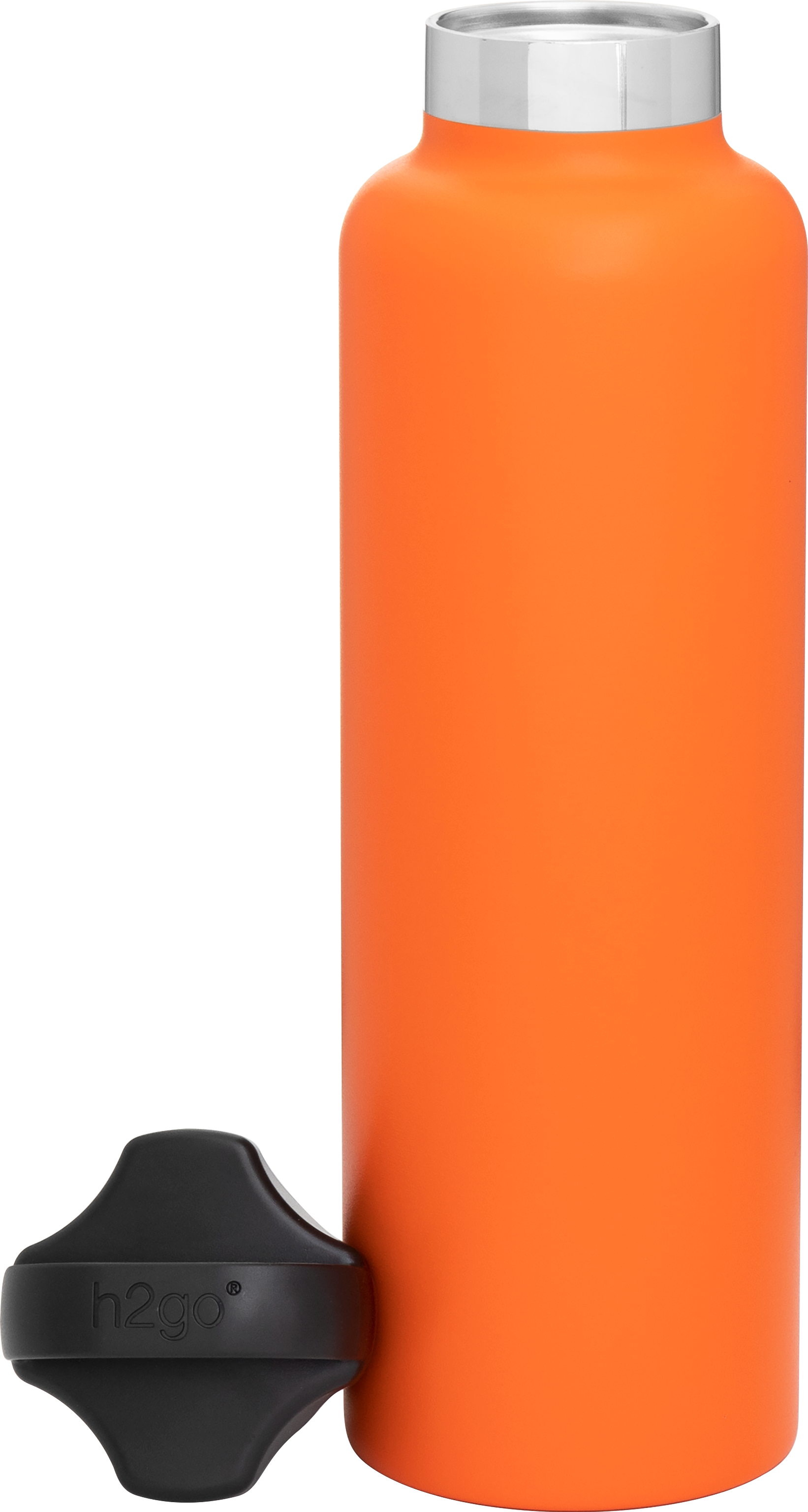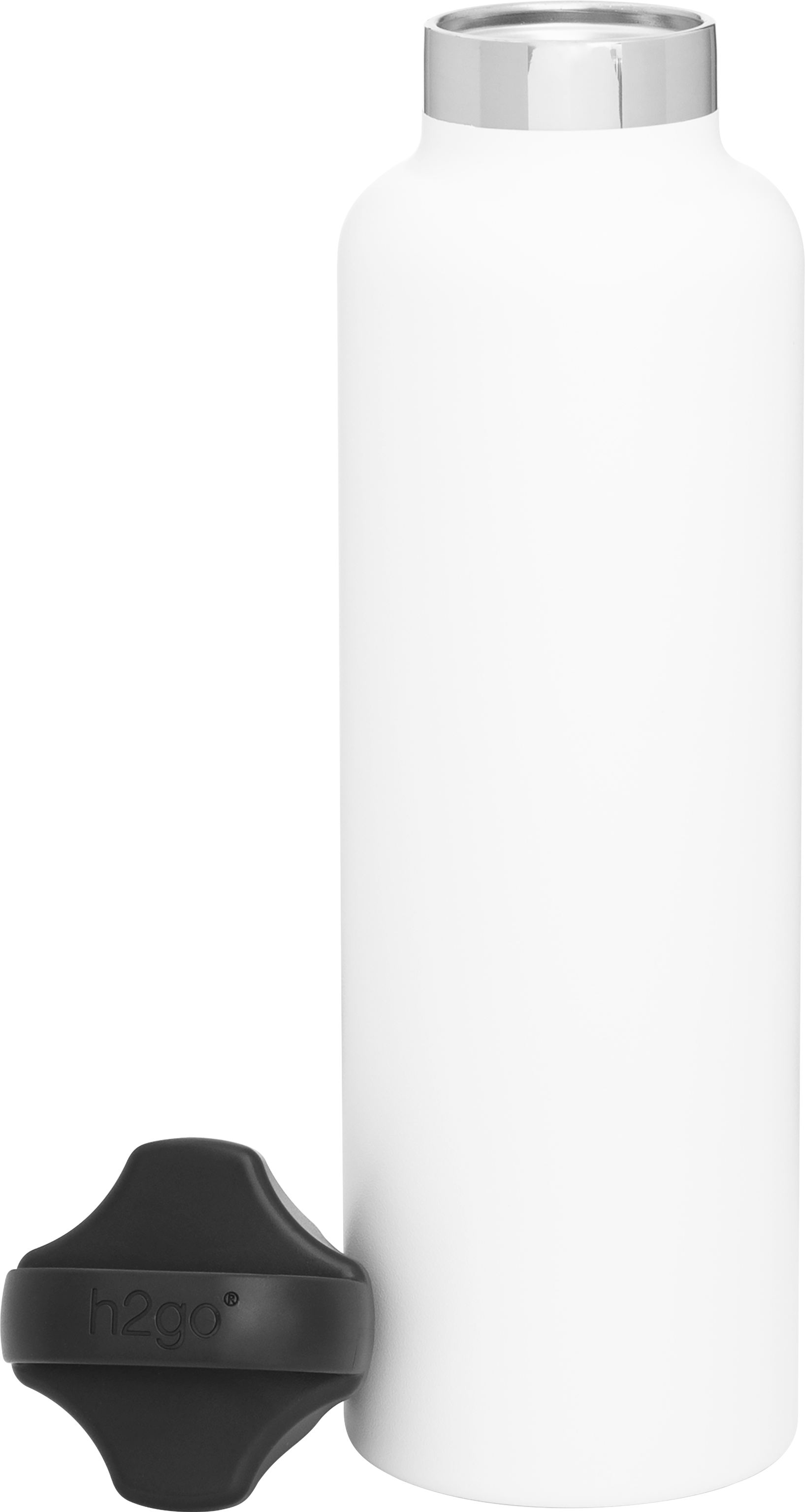 The h2go Ascent 24 oz thermal bottle combines rugged performance with sleek design details. Made from double wall 18/8 stainless steel with copper vacuum insulation, it keeps beverages hot or cold for hours. It features a threaded, gear-shaped insulated lid with an integrated carrying handle, a high polish rim for a refined touch, and a durable powder coated finish for grip and style.