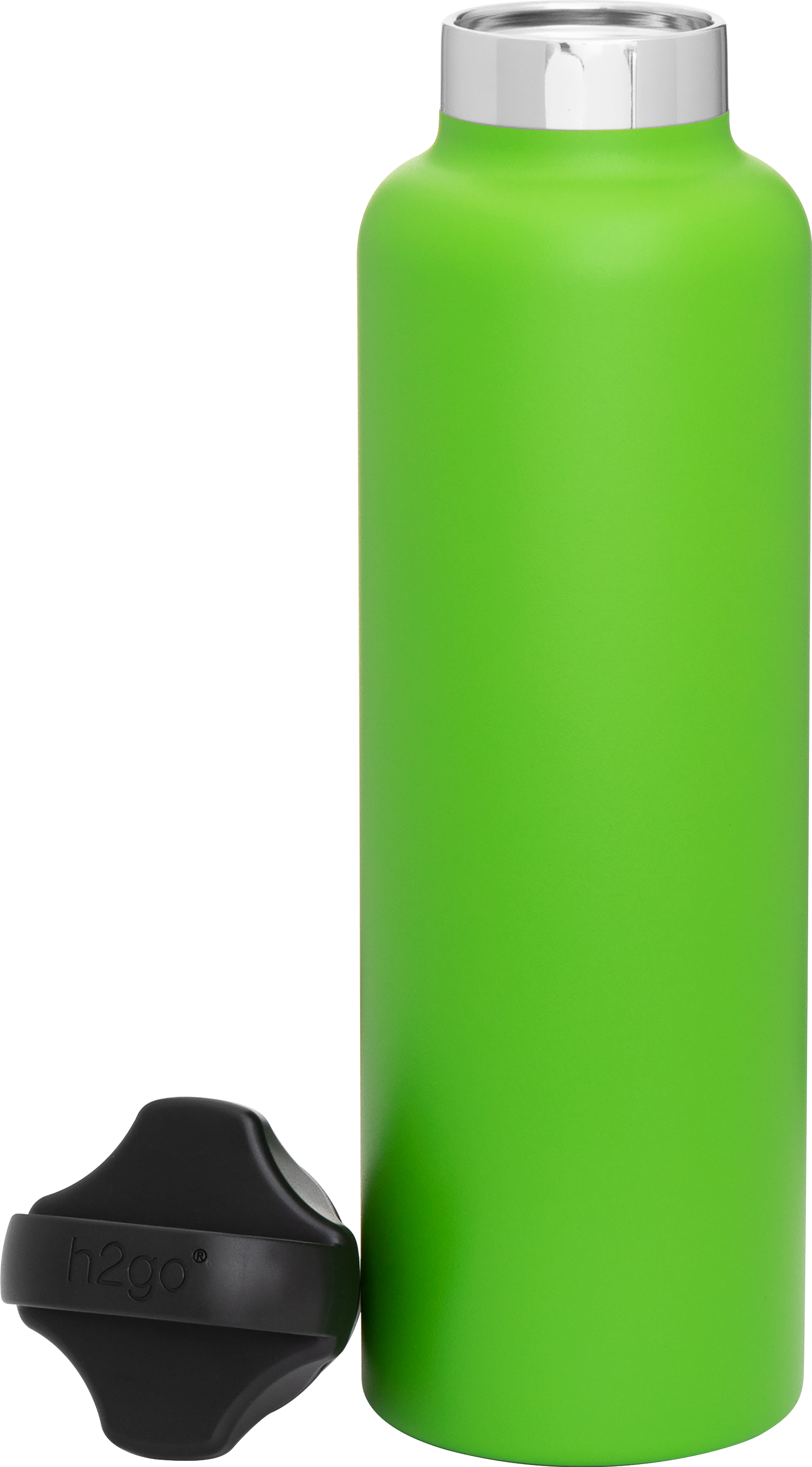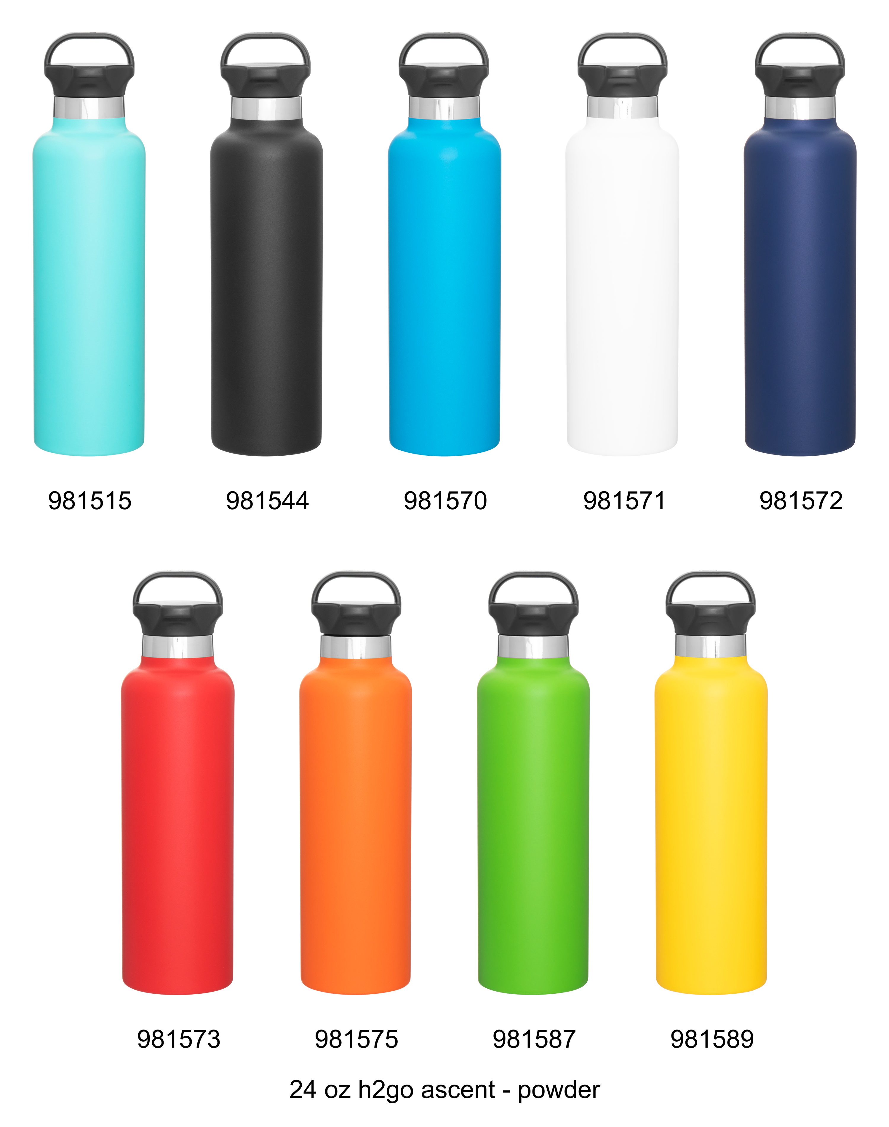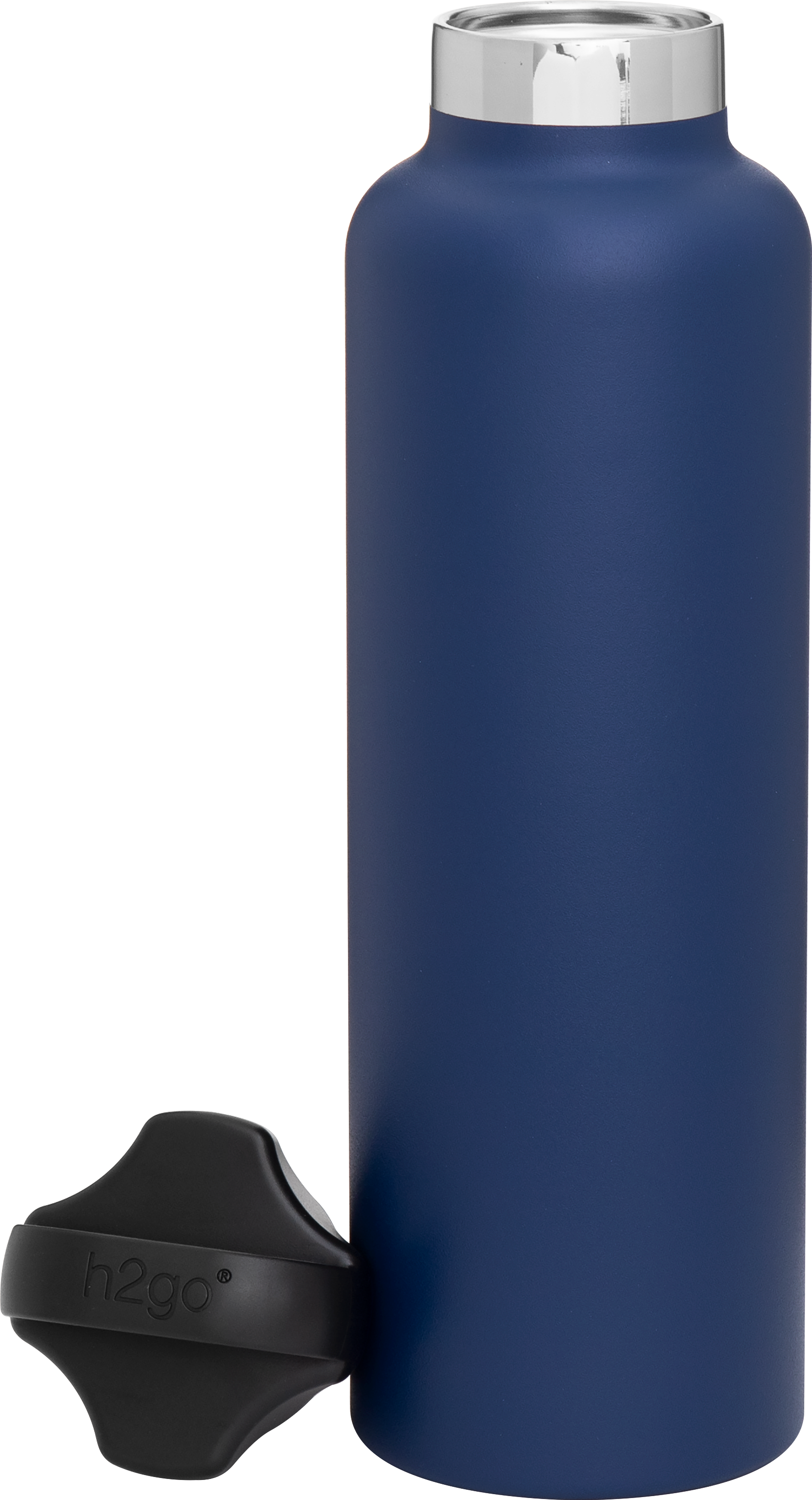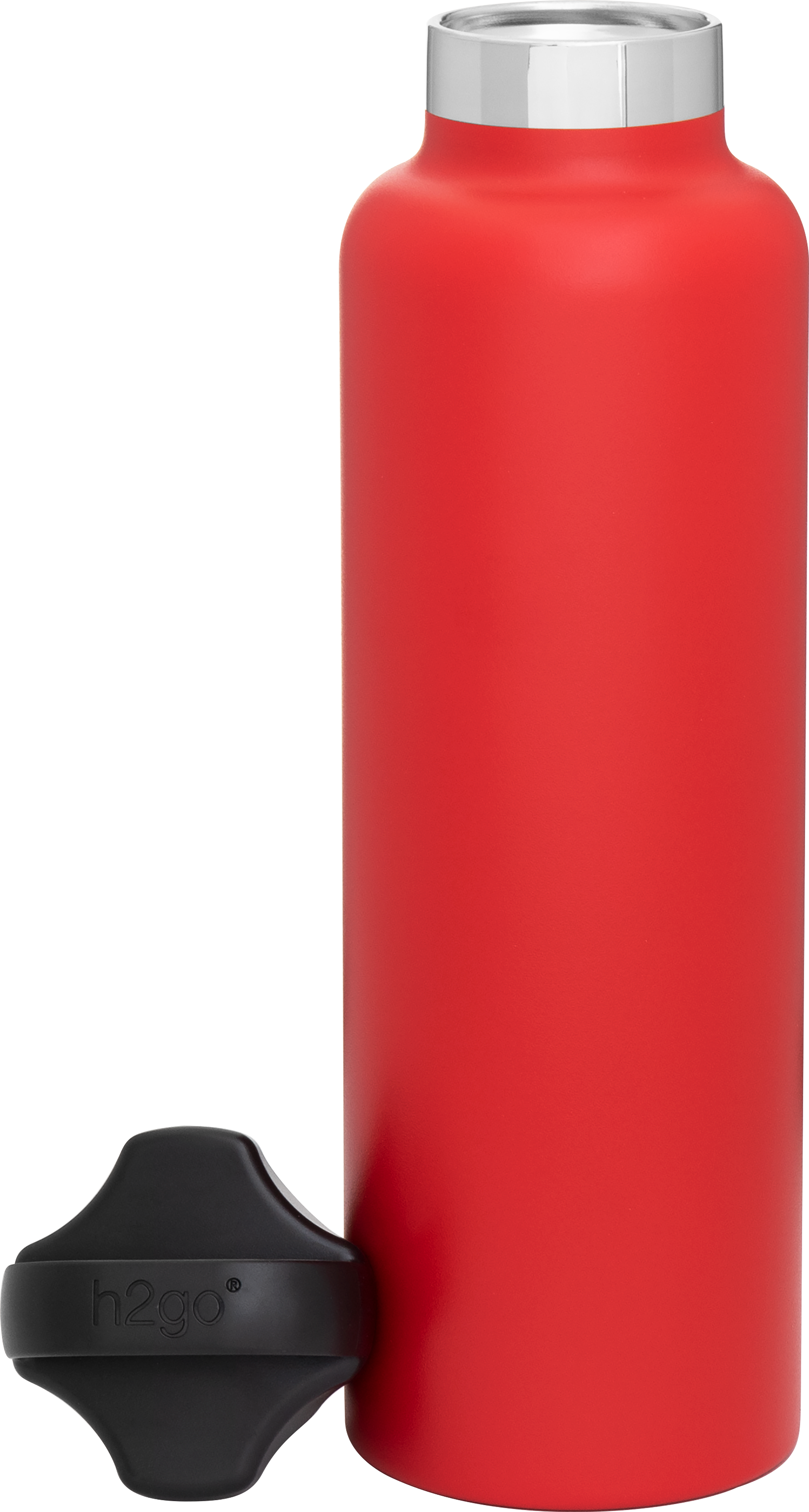 The h2go Ascent 24 oz thermal bottle combines rugged performance with sleek design details. Made from double wall 18/8 stainless steel with copper vacuum insulation, it keeps beverages hot or cold for hours. It features a threaded, gear-shaped insulated lid with an integrated carrying handle, a high polish rim for a refined touch, and a durable powder coated finish for grip and style.