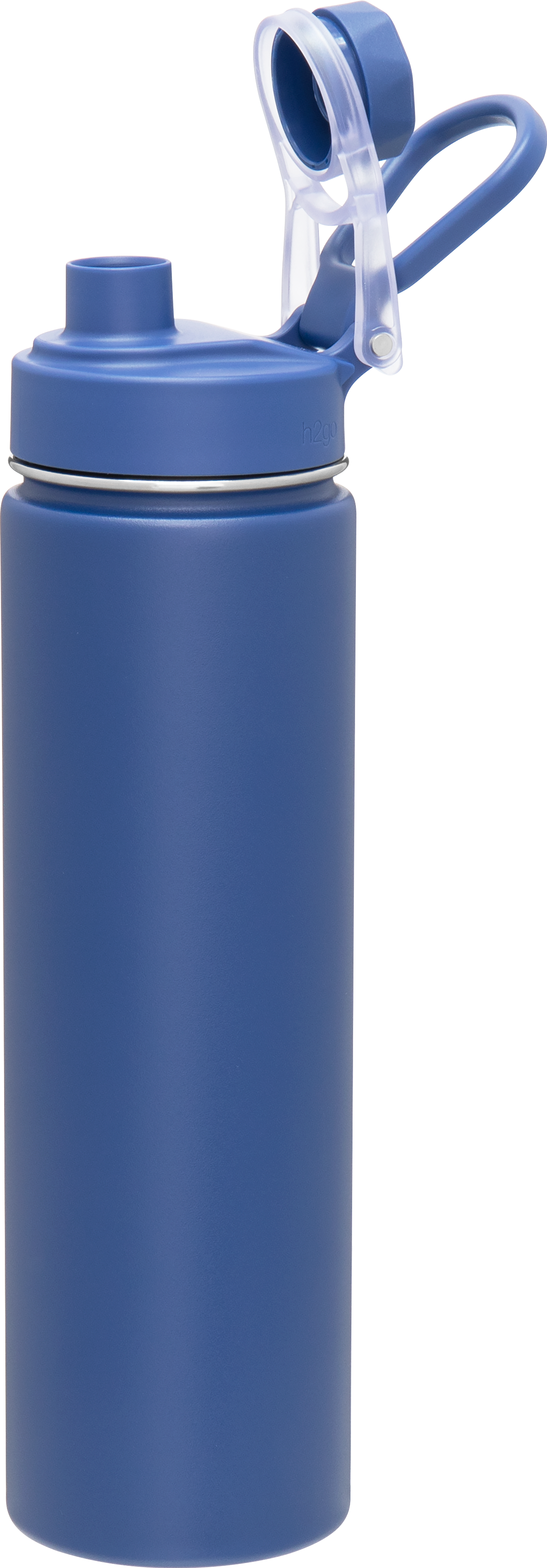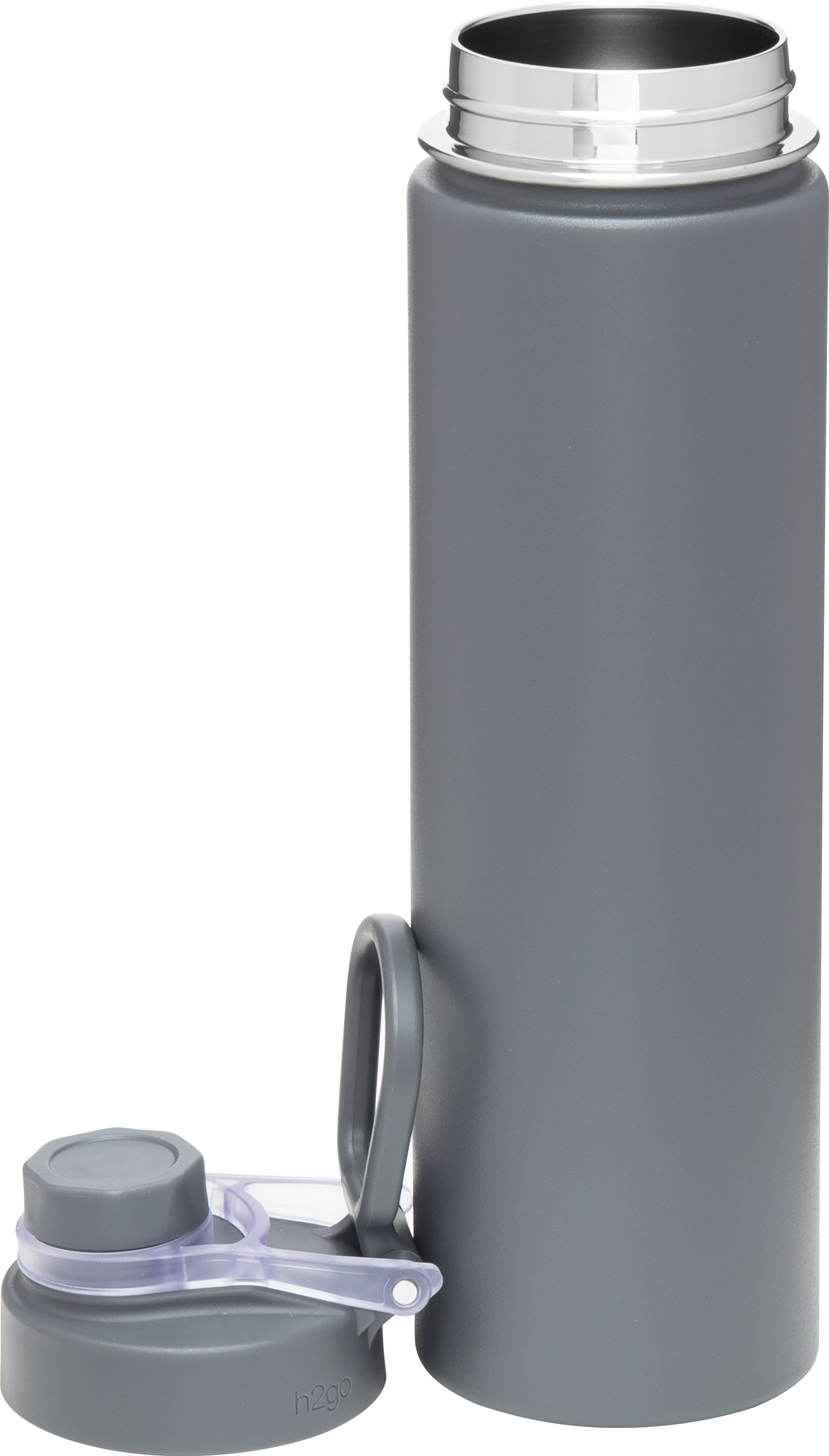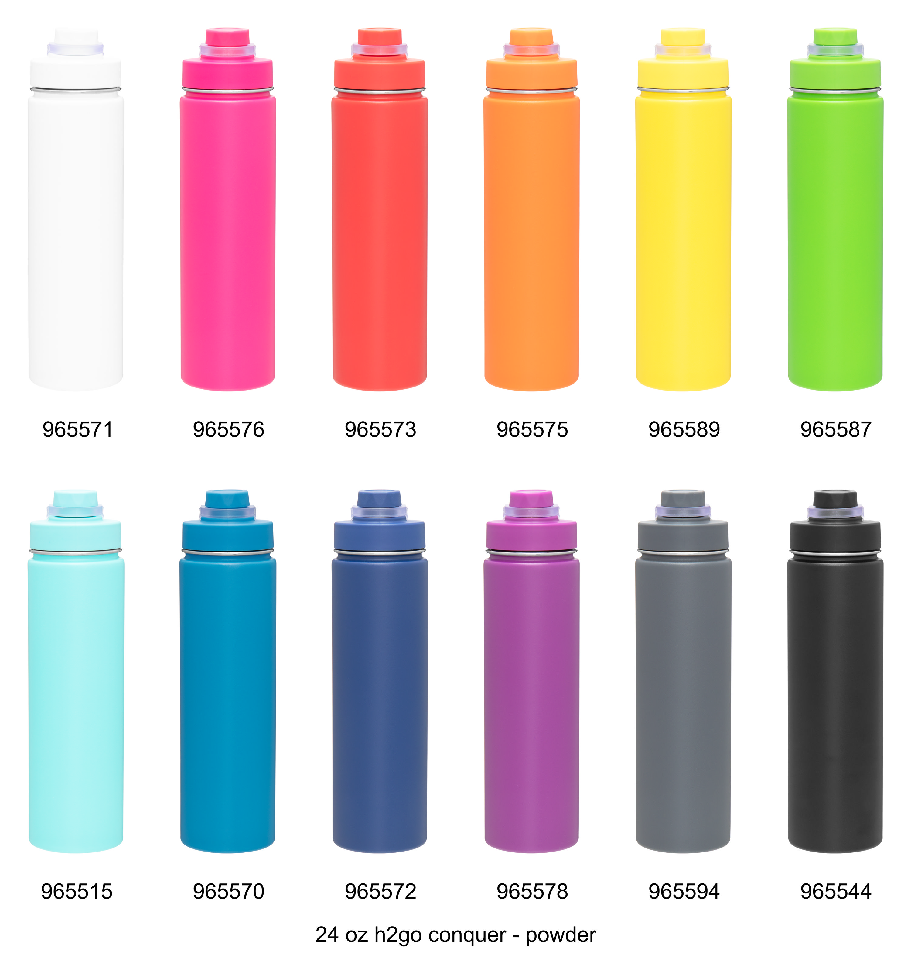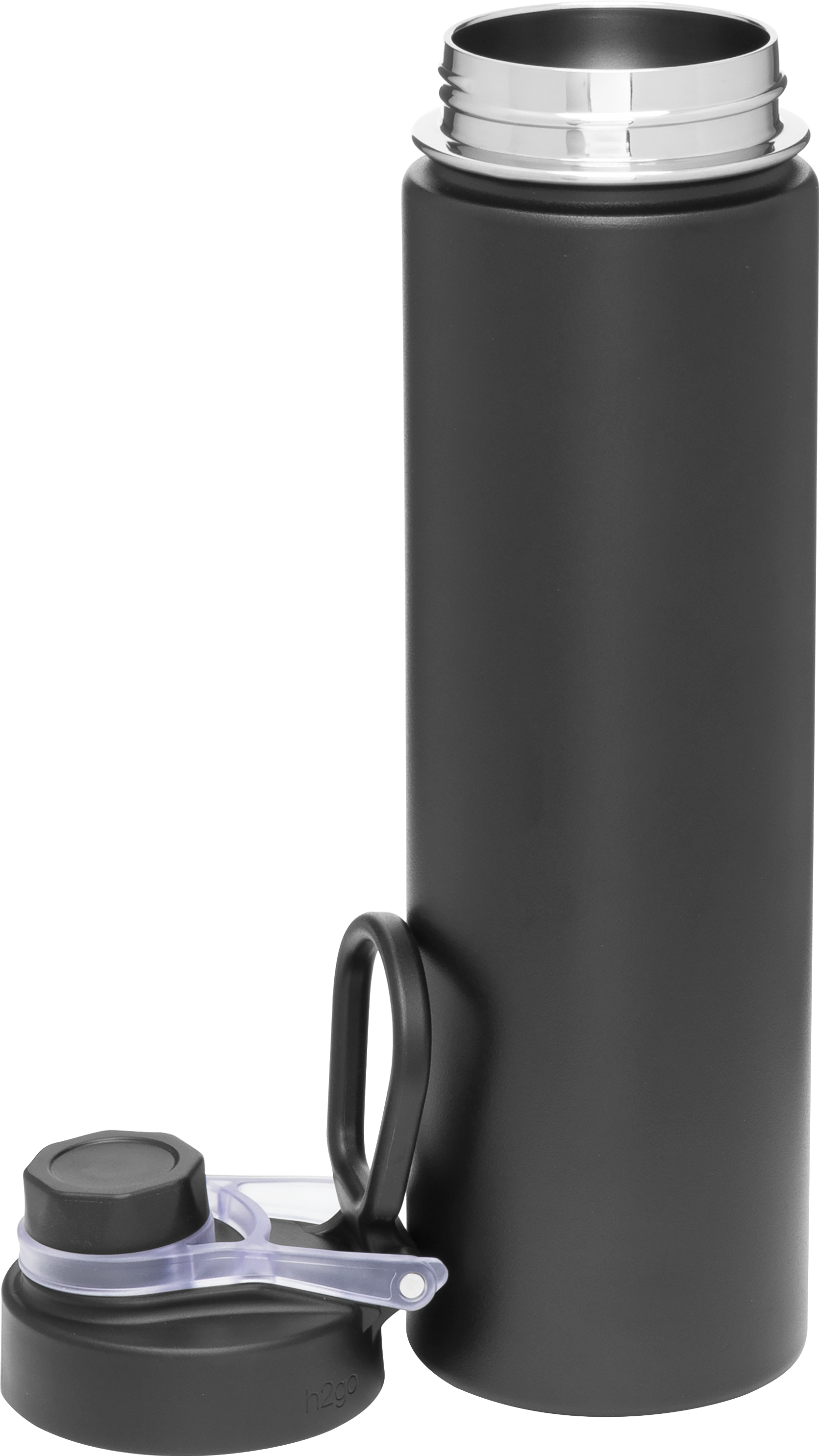 The h2go Conquer 24 oz thermal bottle is made to go the distance. Constructed from double-wall 18/8 stainless steel with copper vacuum insulation, it keeps drinks hot or cold for hours. It features a matching threaded lid with a built-in drinking spout and hinged cap for easy access, plus a sturdy carrying handle for convenience on the move. Finished with a durable powder coated exterior, Conquer is ready for wherever the day leads.