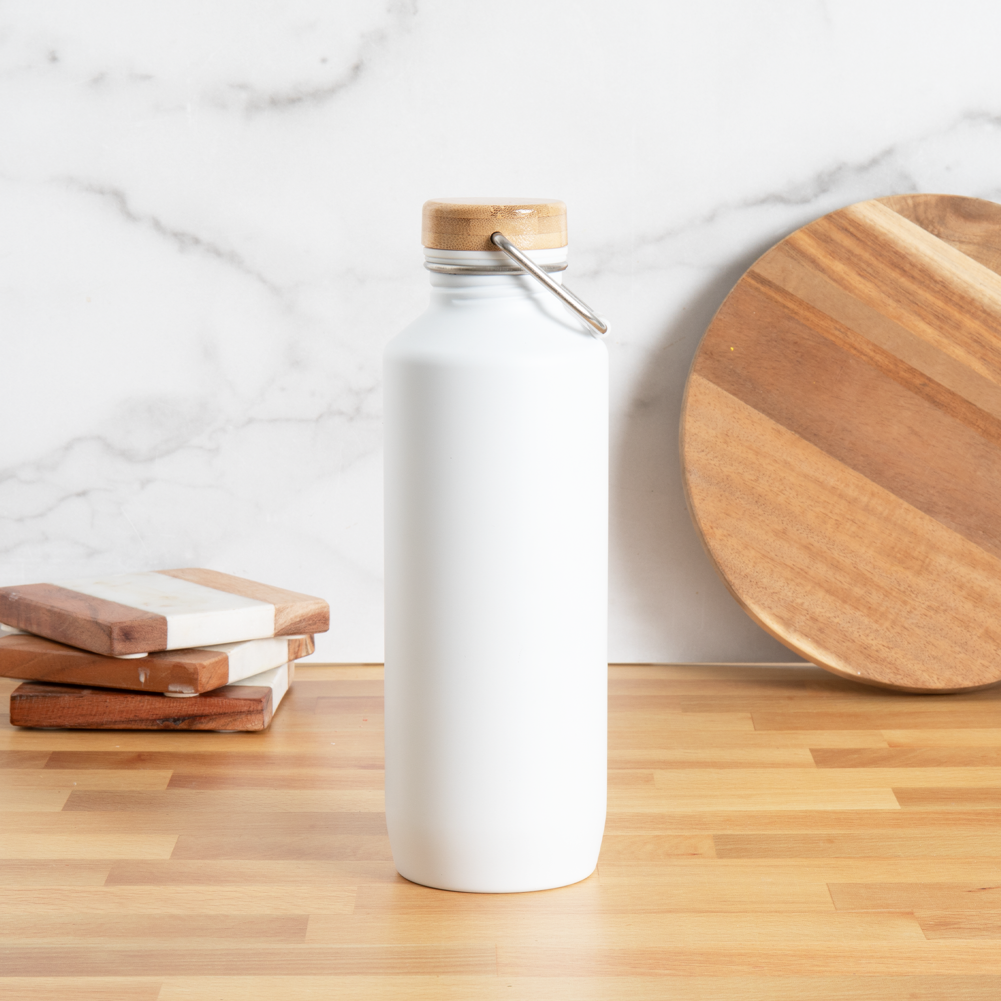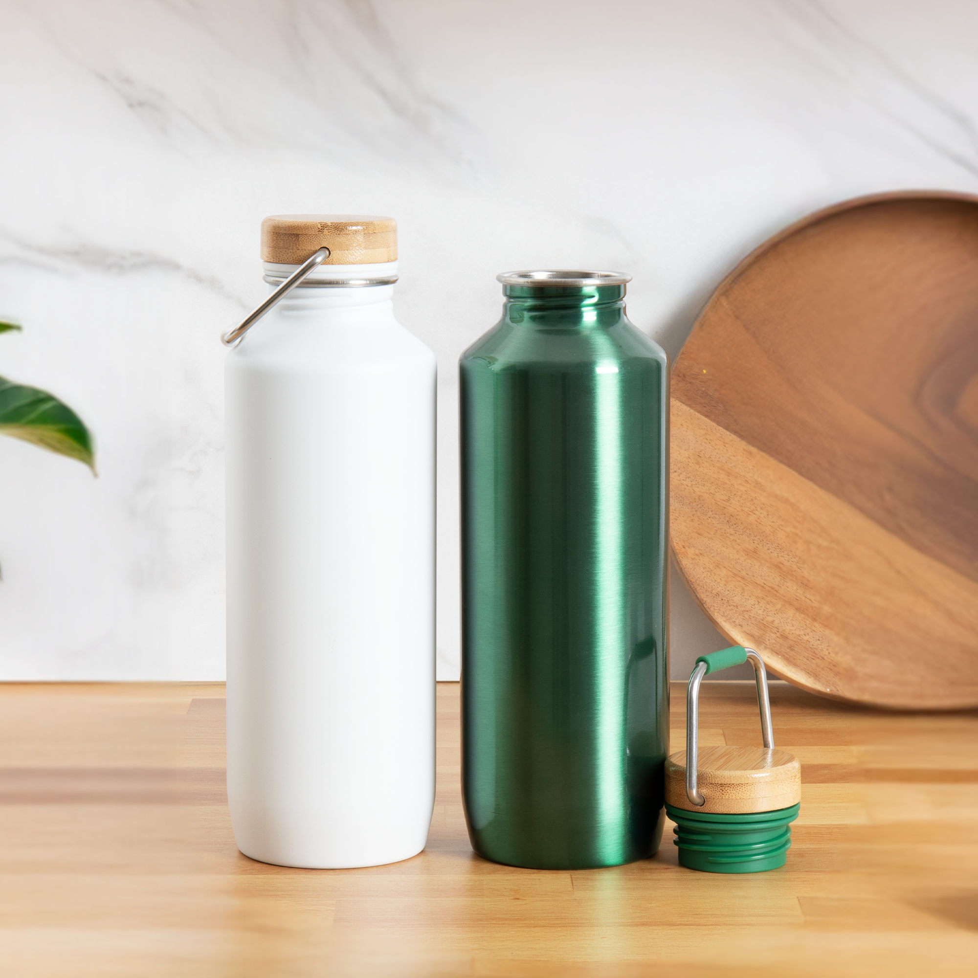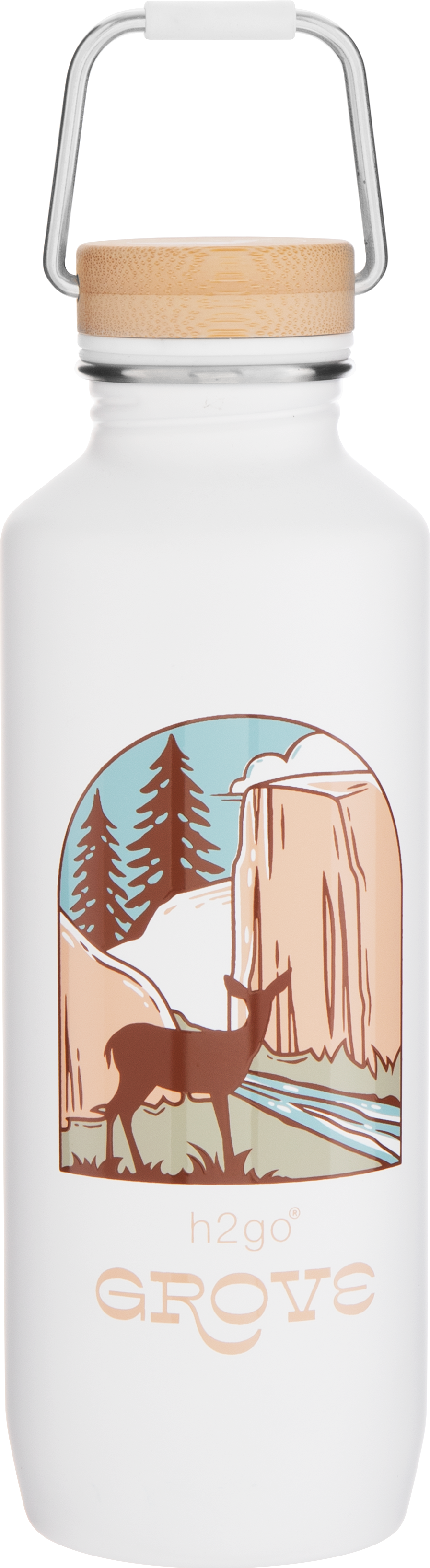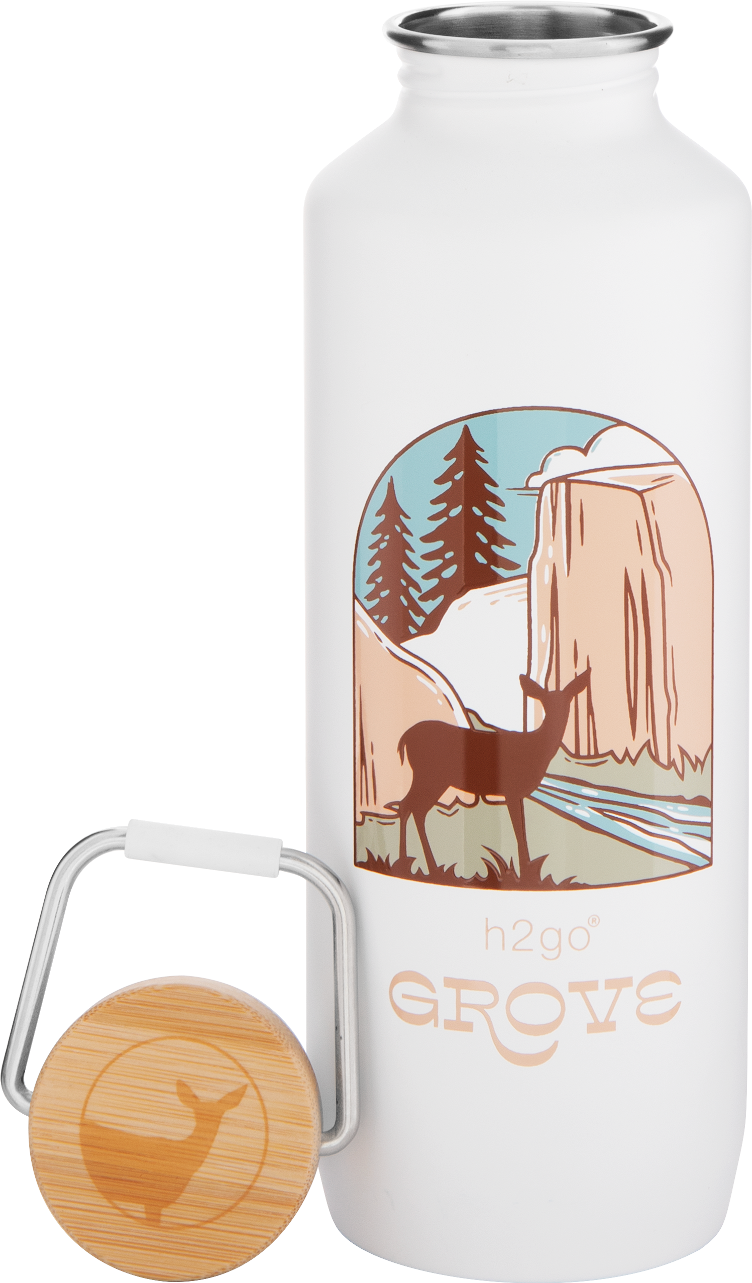 The h2go Grove 25 oz bottle blends sustainability with sleek design. Made from 90% post-consumer recycled stainless steel, it features a lightweight single-wall build, a threaded bamboo lid, and a swing handle with a color accent. Finished with a modern matte look, it's a smart choice for eco-conscious, on-the-go hydration with cold beverages.