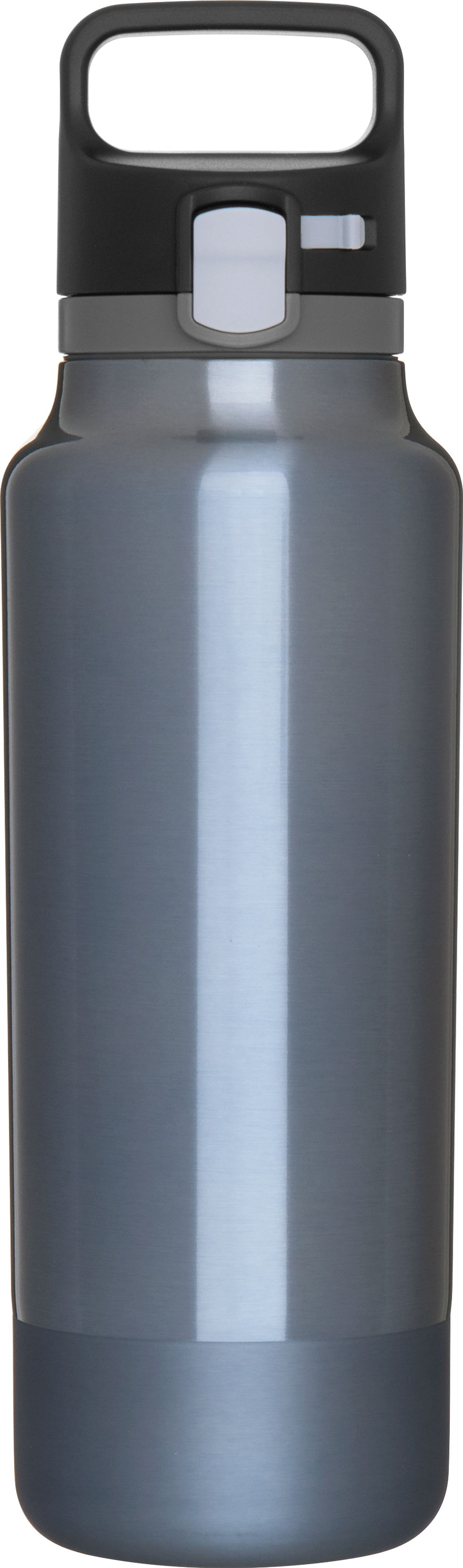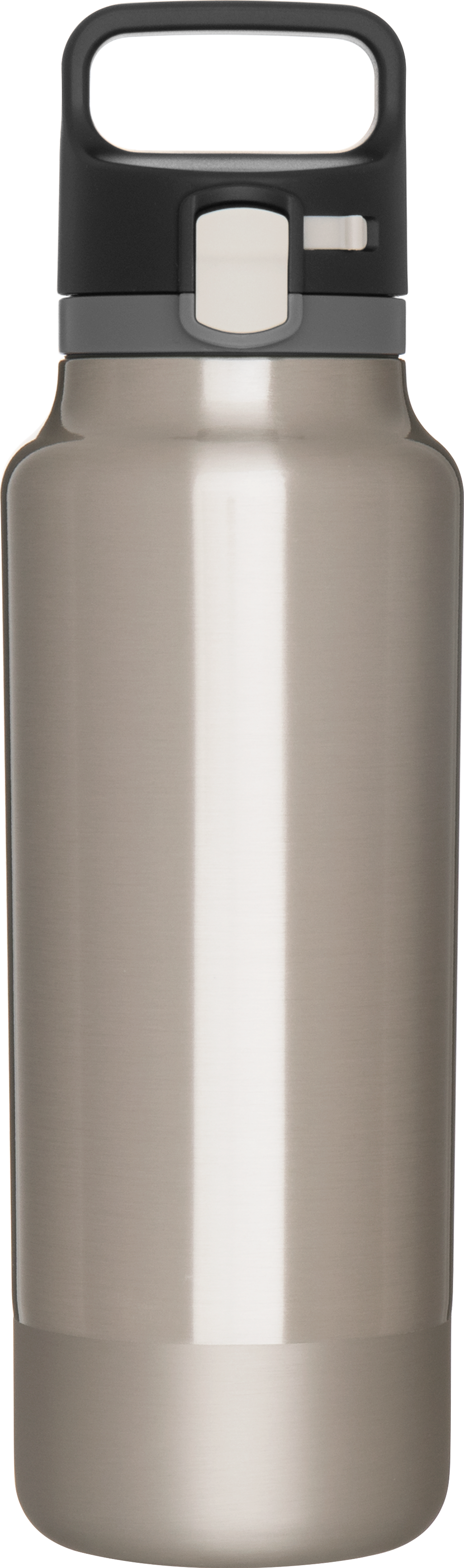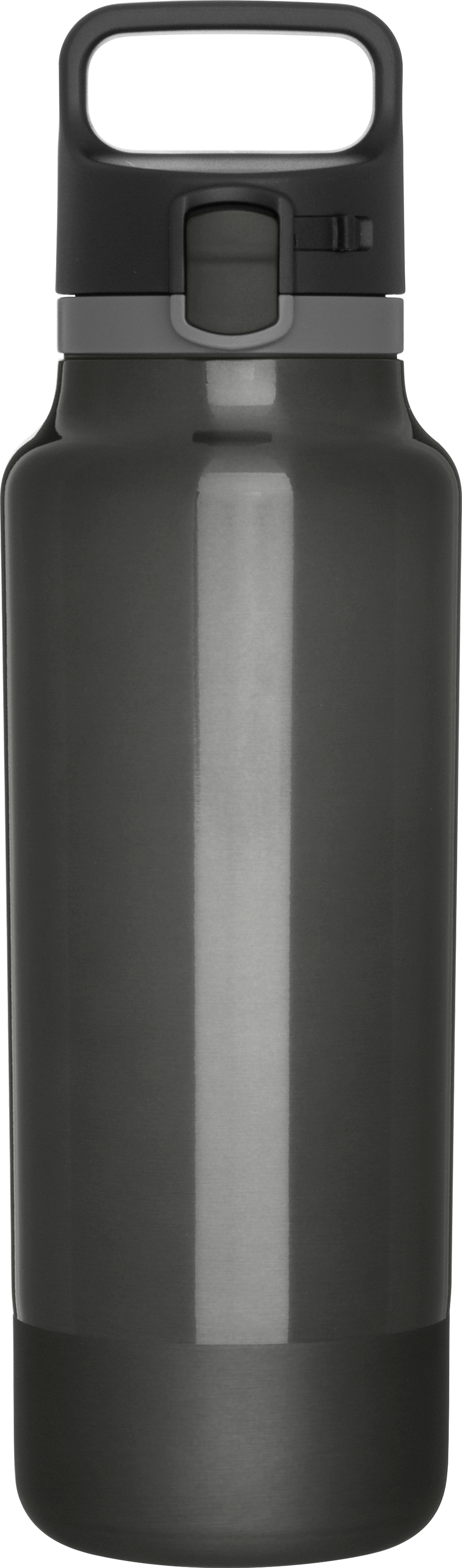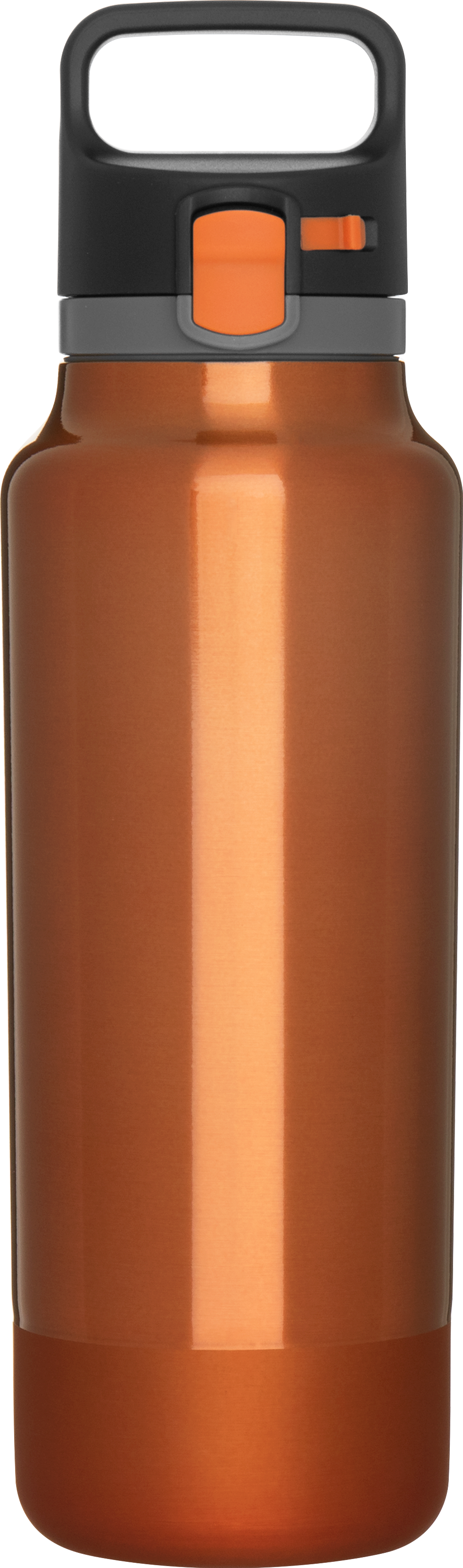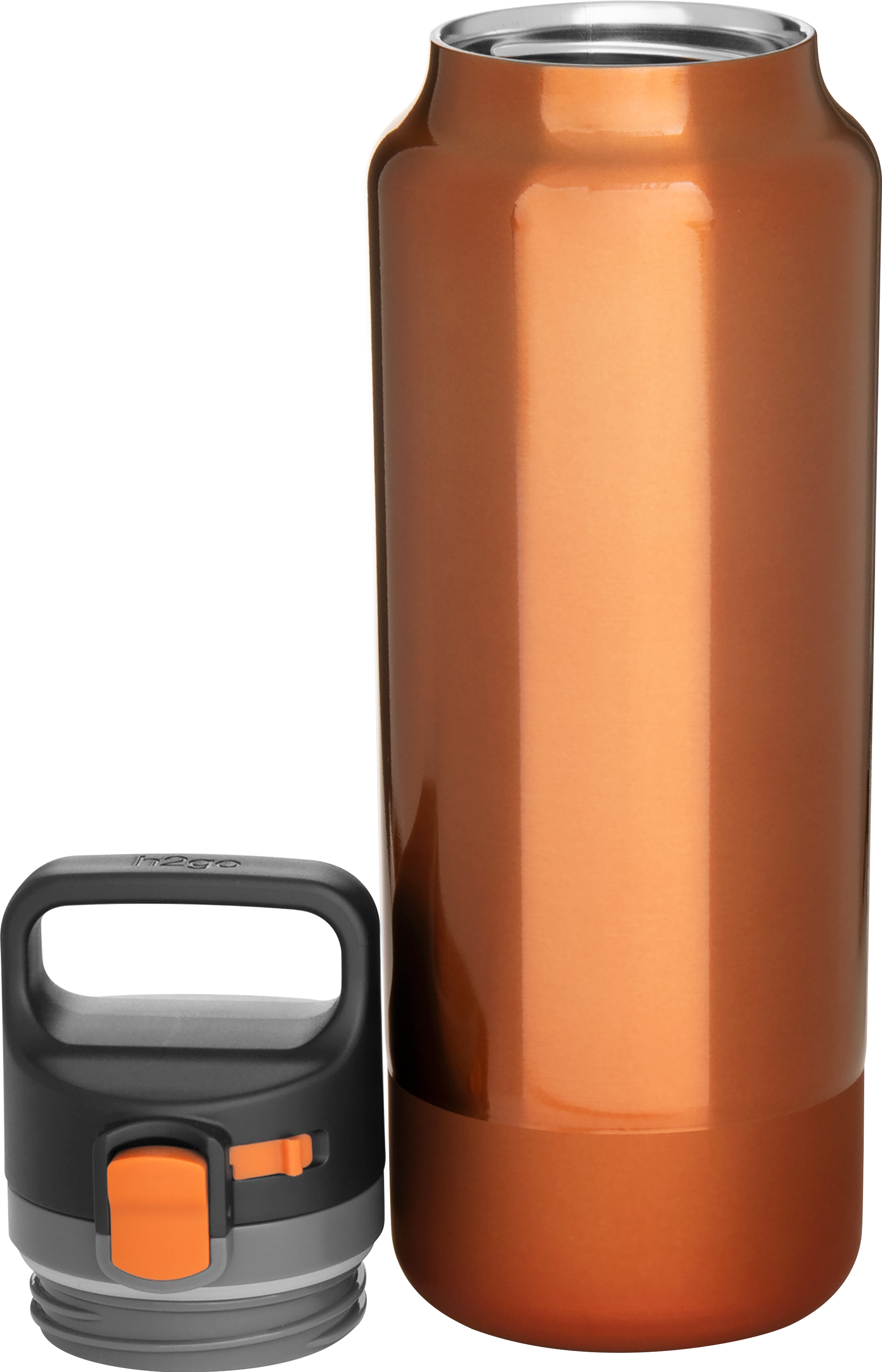 The h2go Ranger 25 oz thermal bottle is designed for durability and ease of use, whether you're on the trail or in the office. Made from double wall 18/8 stainless steel with copper vacuum insulation, it keeps beverages hot or cold for hours. The threaded lid features a push-button locking mechanism and sip opening for secure, one-handed use. A built-in carrying handle adds convenience, while the tinted finish and rubberized base provide style and stability.