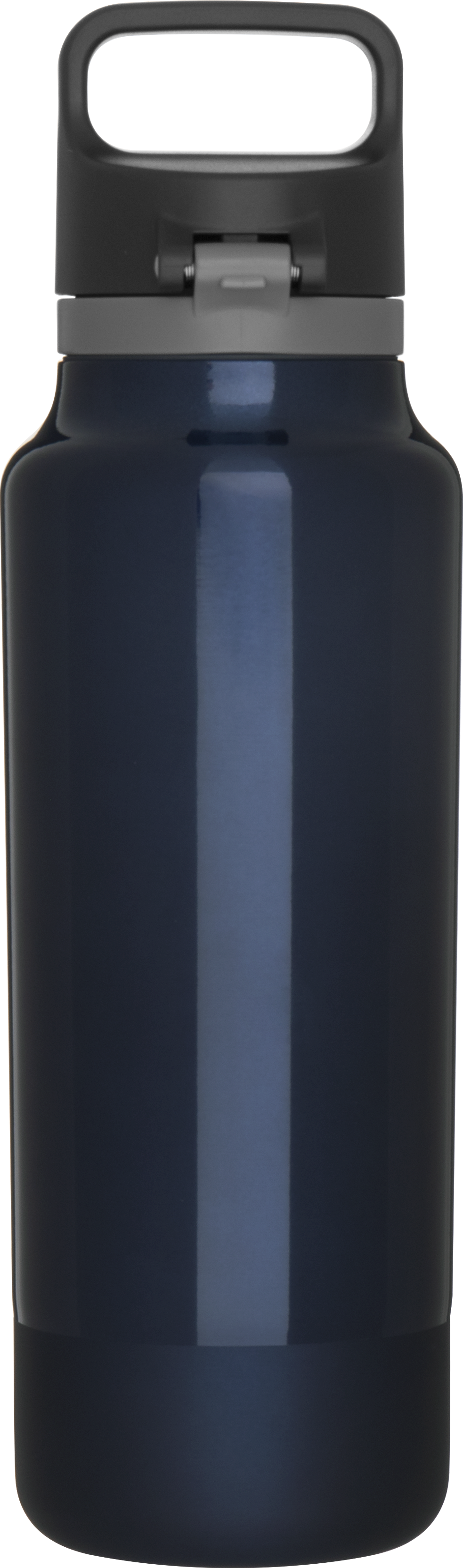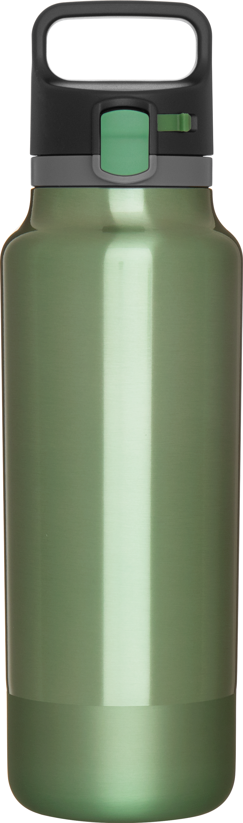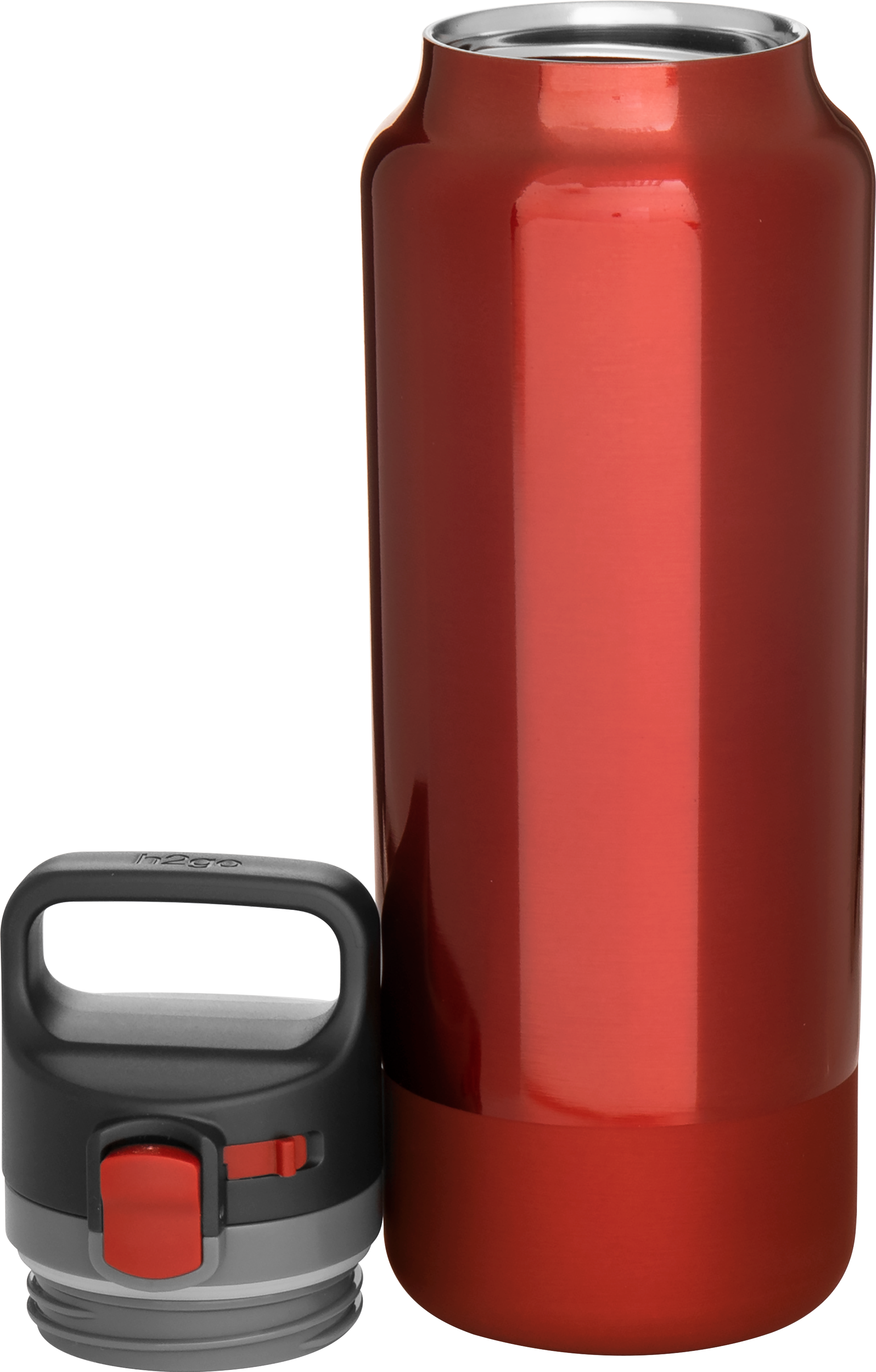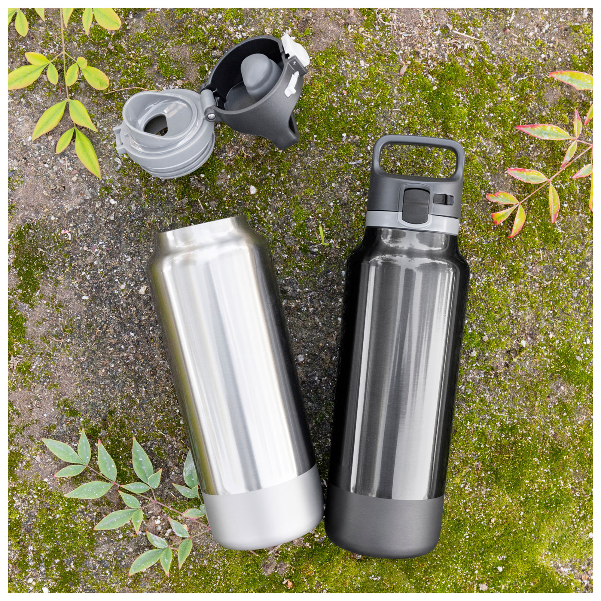 The h2go Ranger 25 oz thermal bottle is designed for durability and ease of use, whether you're on the trail or in the office. Made from double wall 18/8 stainless steel with copper vacuum insulation, it keeps beverages hot or cold for hours. The threaded lid features a push-button locking mechanism and sip opening for secure, one-handed use. A built-in carrying handle adds convenience, while the tinted finish and rubberized base provide style and stability.