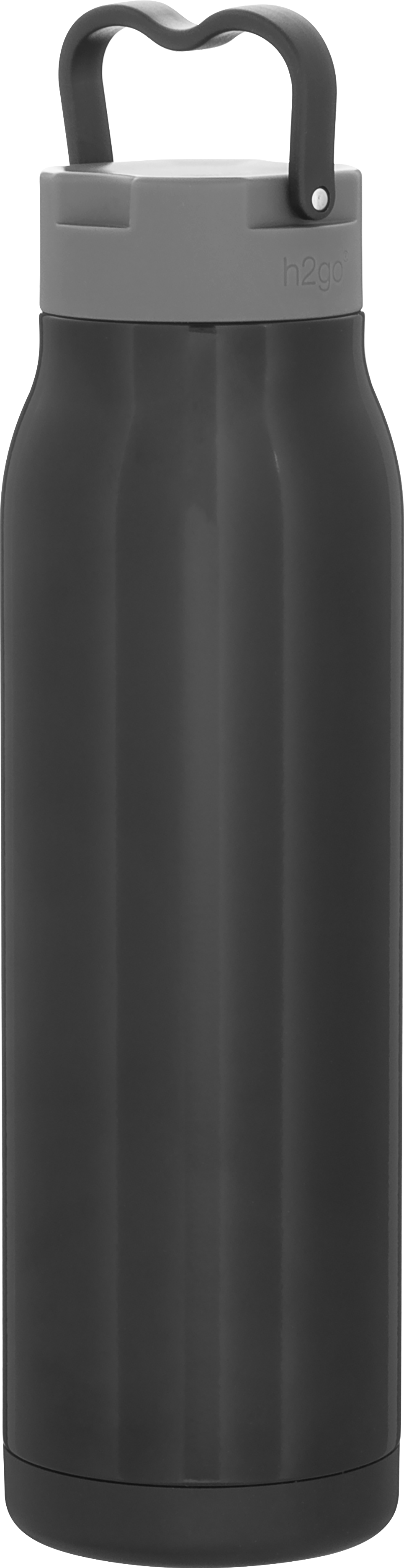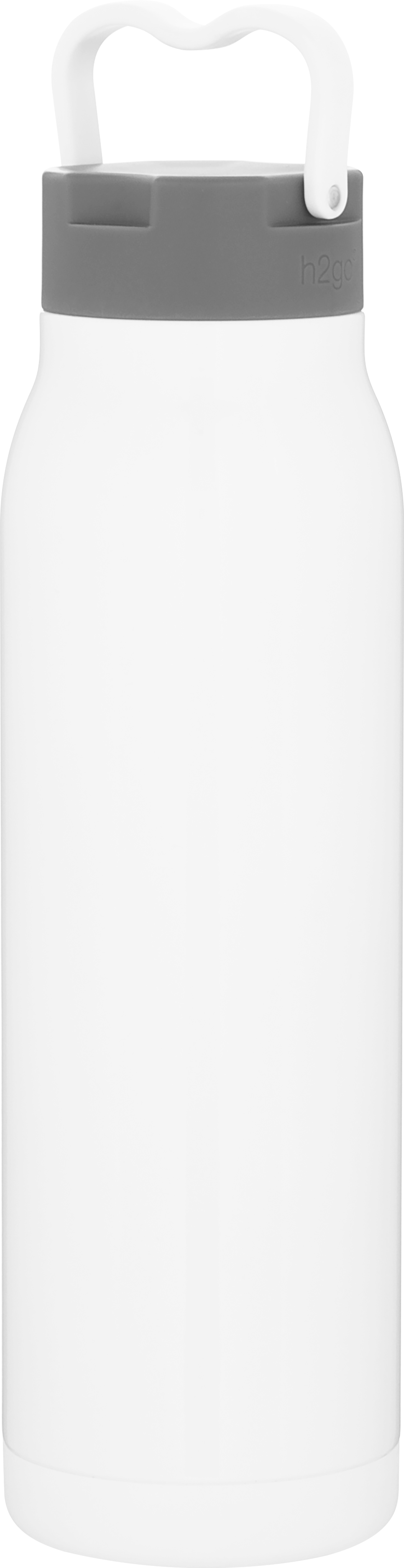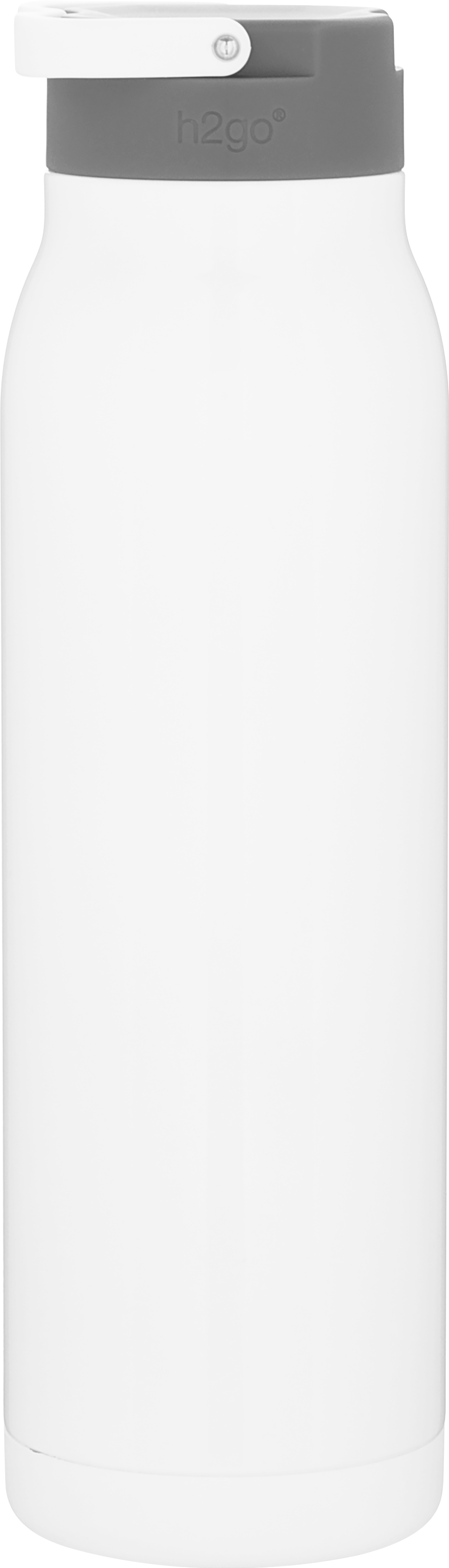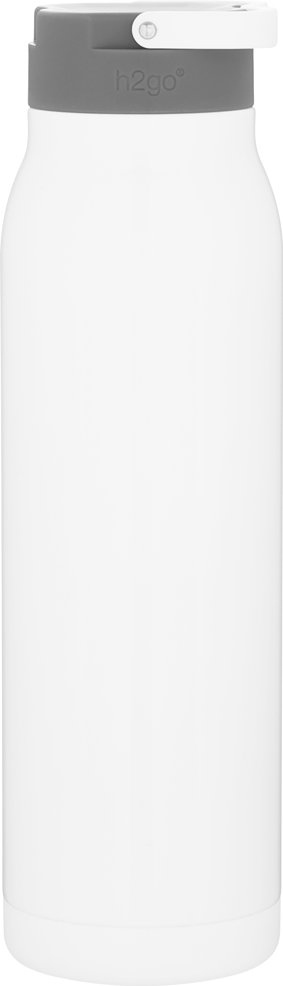 The h2go Flex 32 oz thermal bottle offers high-capacity hydration with a sleek, dual-texture finish. Made from durable double wall 18/8 stainless steel with copper vacuum insulation, it keeps beverages hot or cold for hours. It features a threaded insulated lid with a matching carrying handle for easy transport. A glossy powder coated body and matte powder coated base provide style, grip, and stability for life on the go.