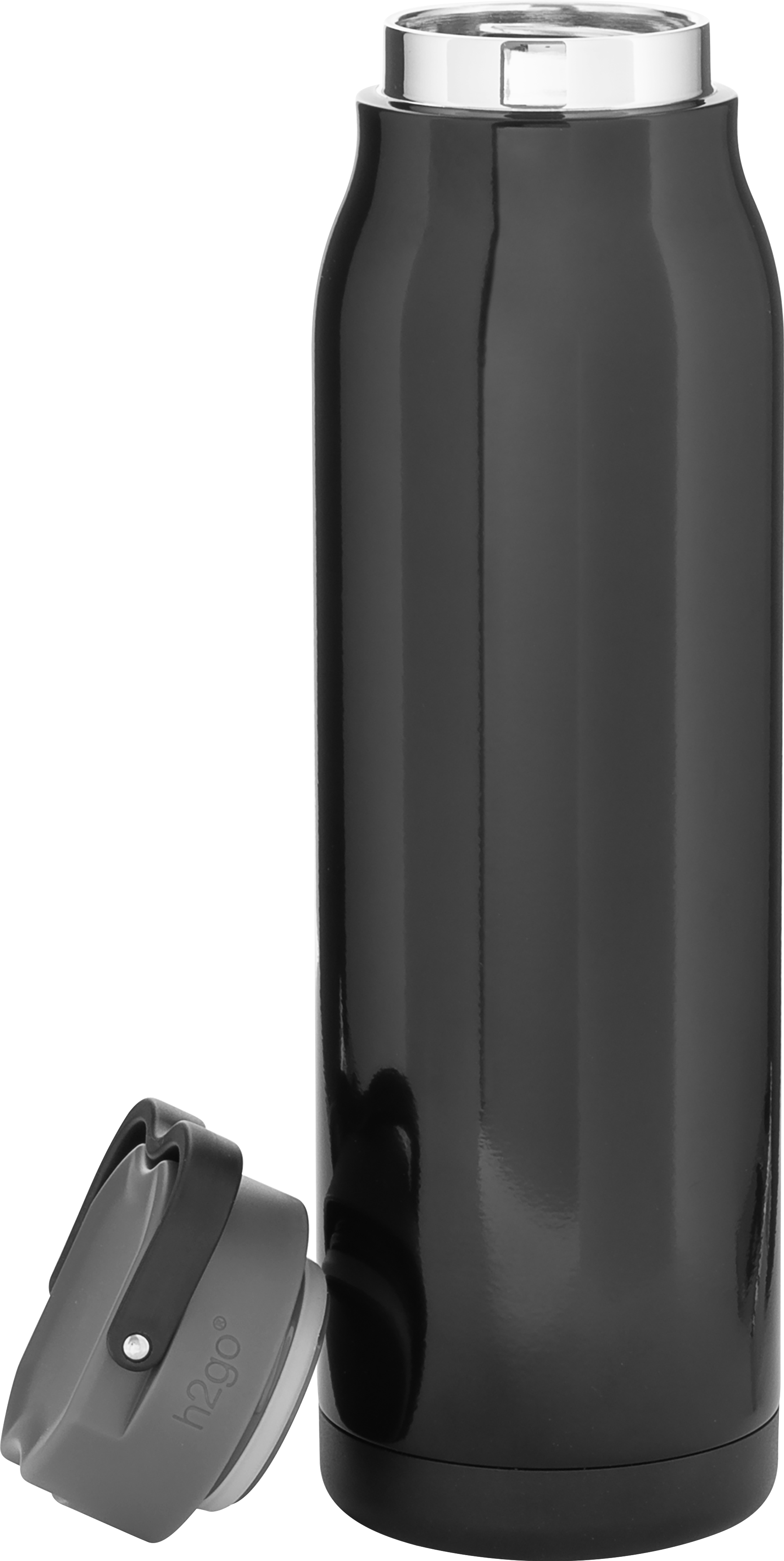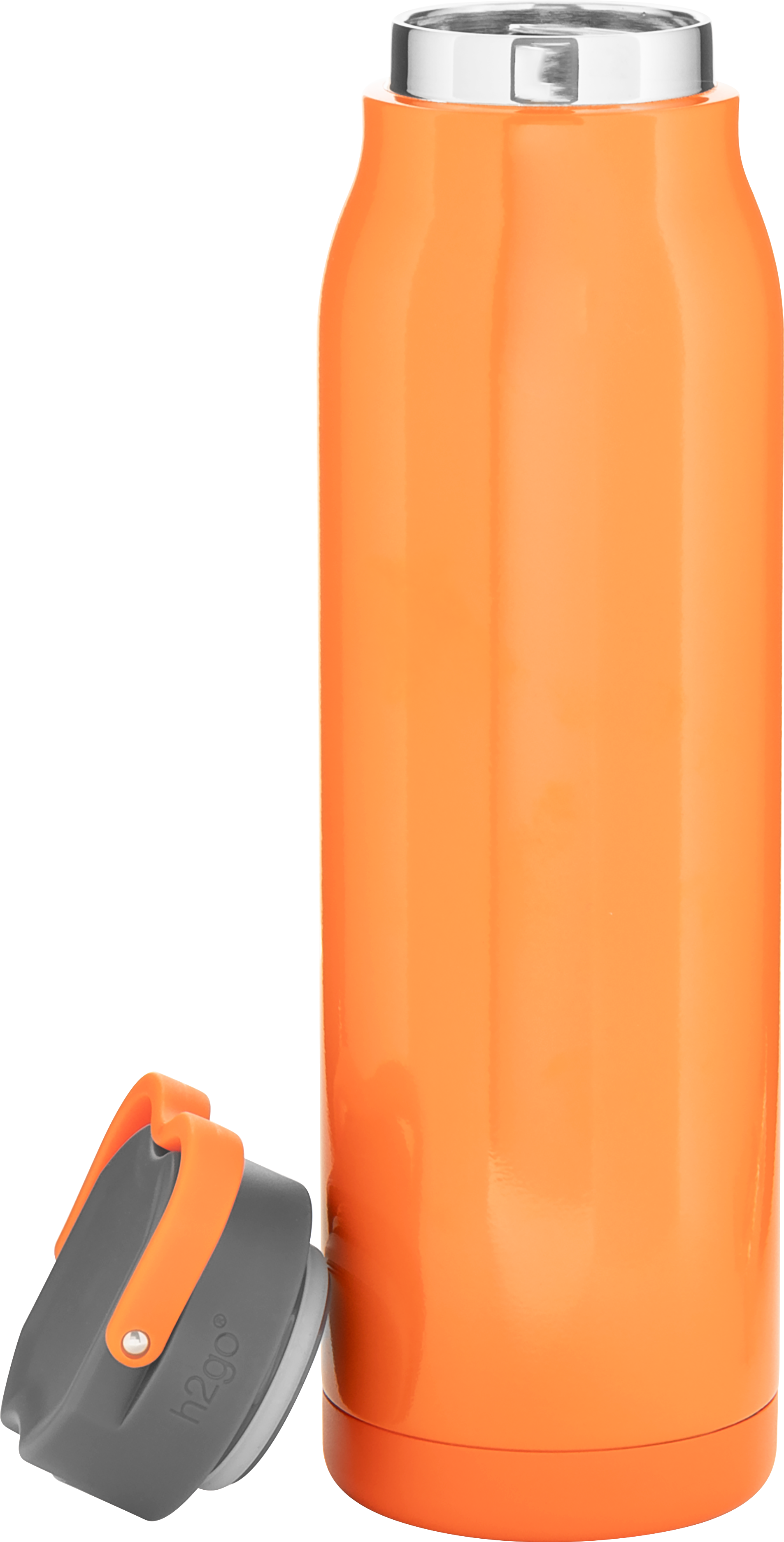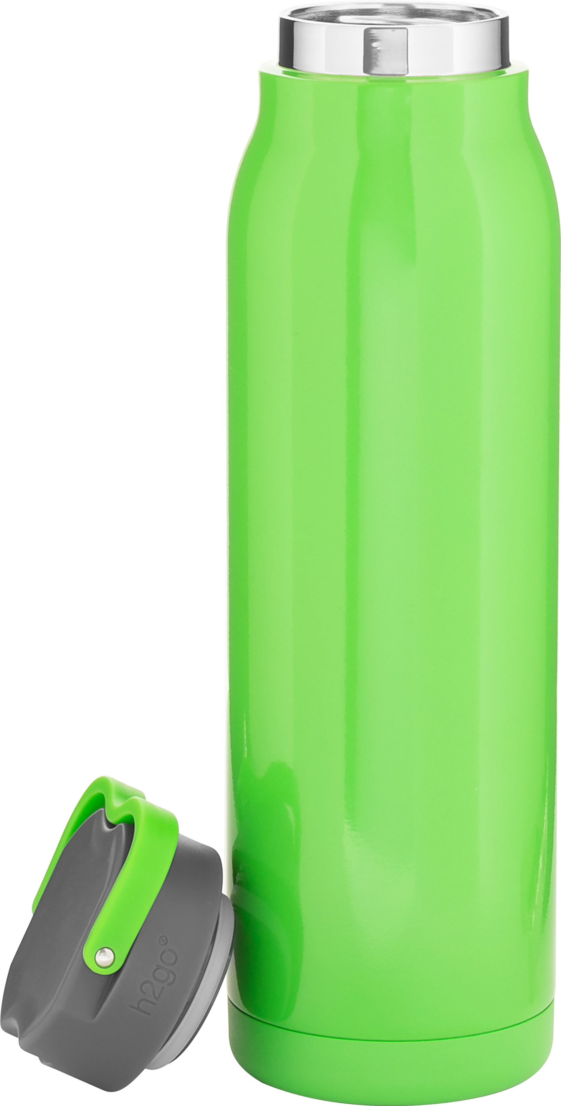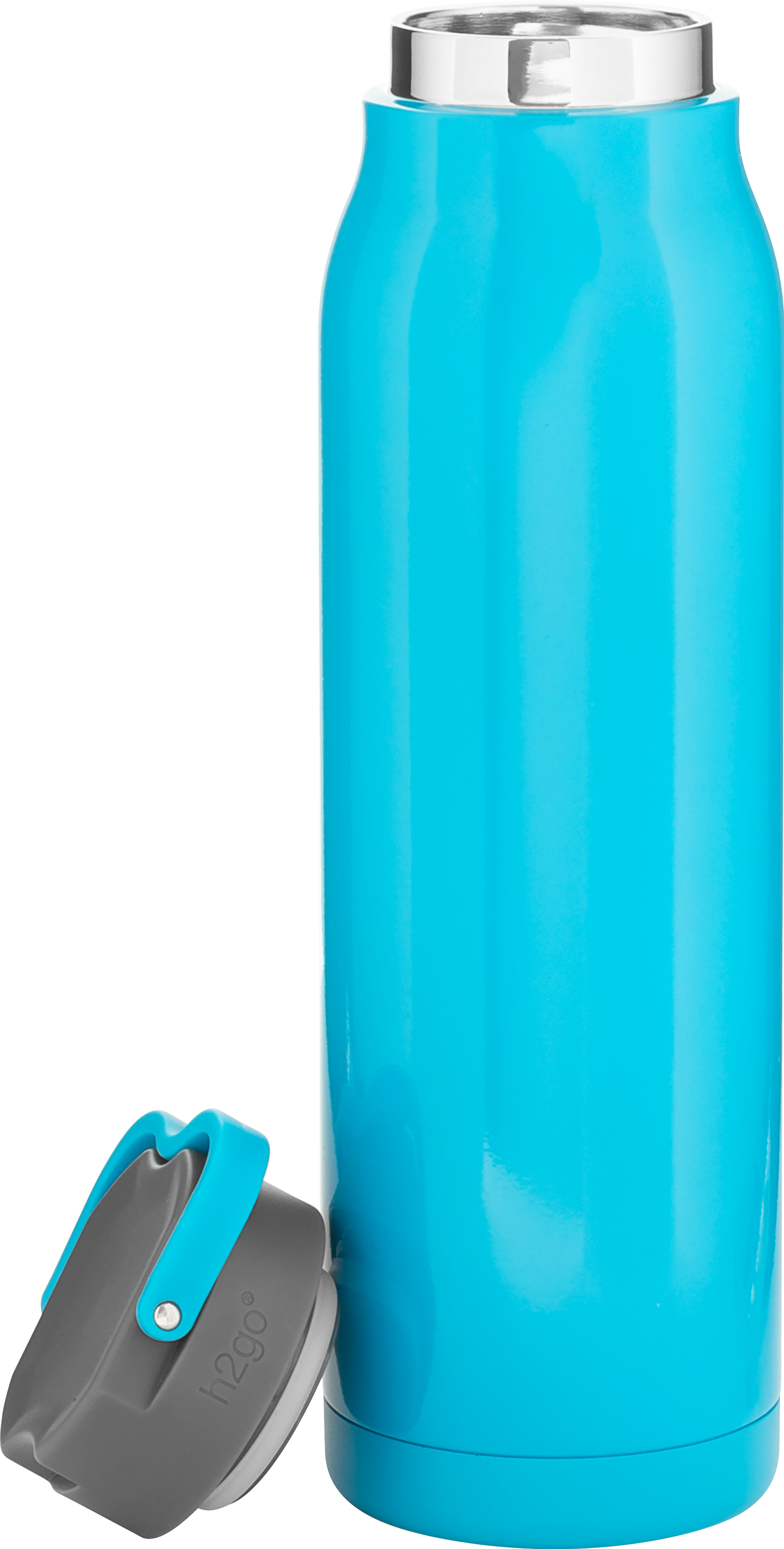 The h2go Flex 32 oz thermal bottle offers high-capacity hydration with a sleek, dual-texture finish. Made from durable double wall 18/8 stainless steel with copper vacuum insulation, it keeps beverages hot or cold for hours. It features a threaded insulated lid with a matching carrying handle for easy transport. A glossy powder coated body and matte powder coated base provide style, grip, and stability for life on the go.