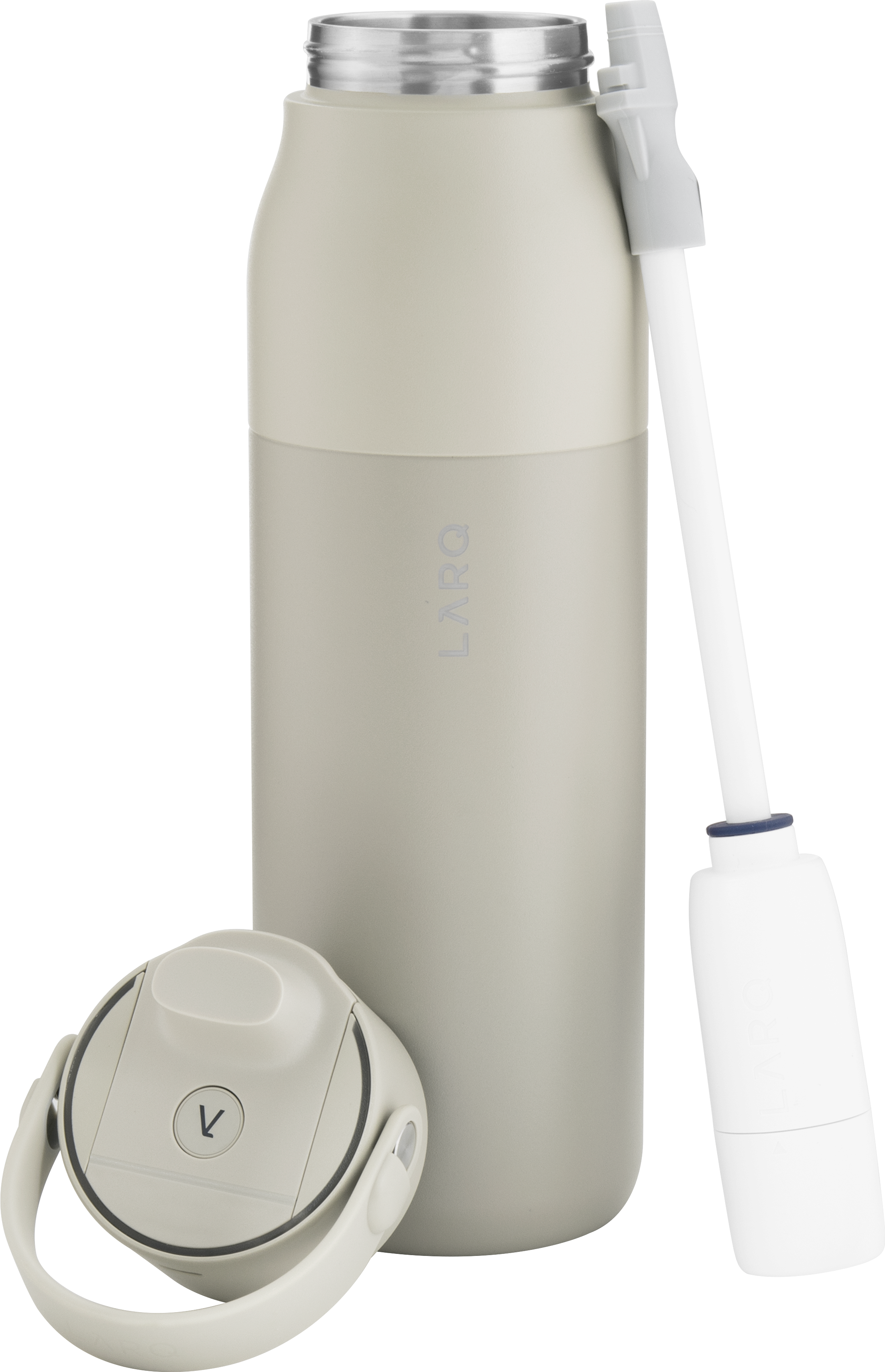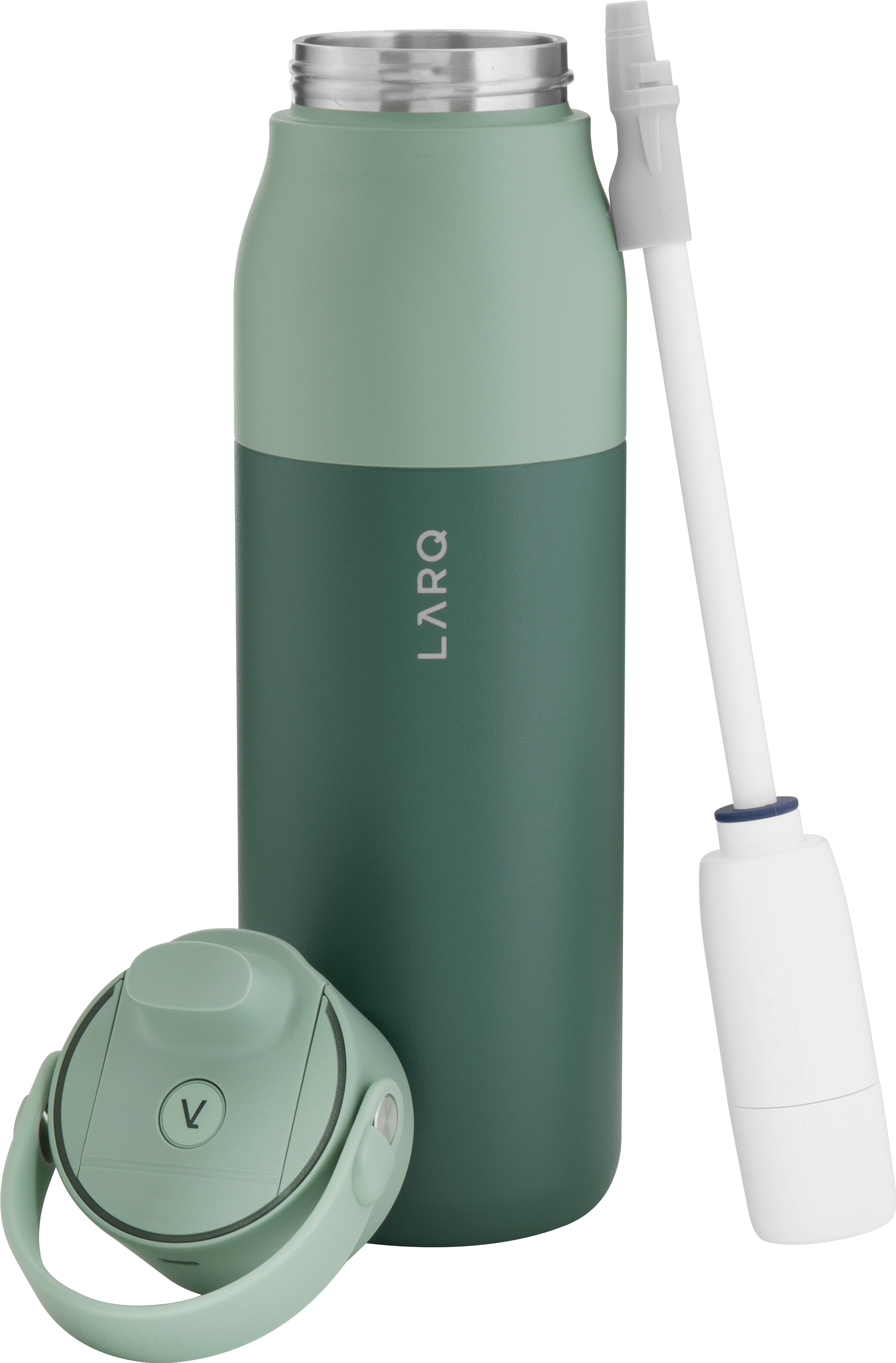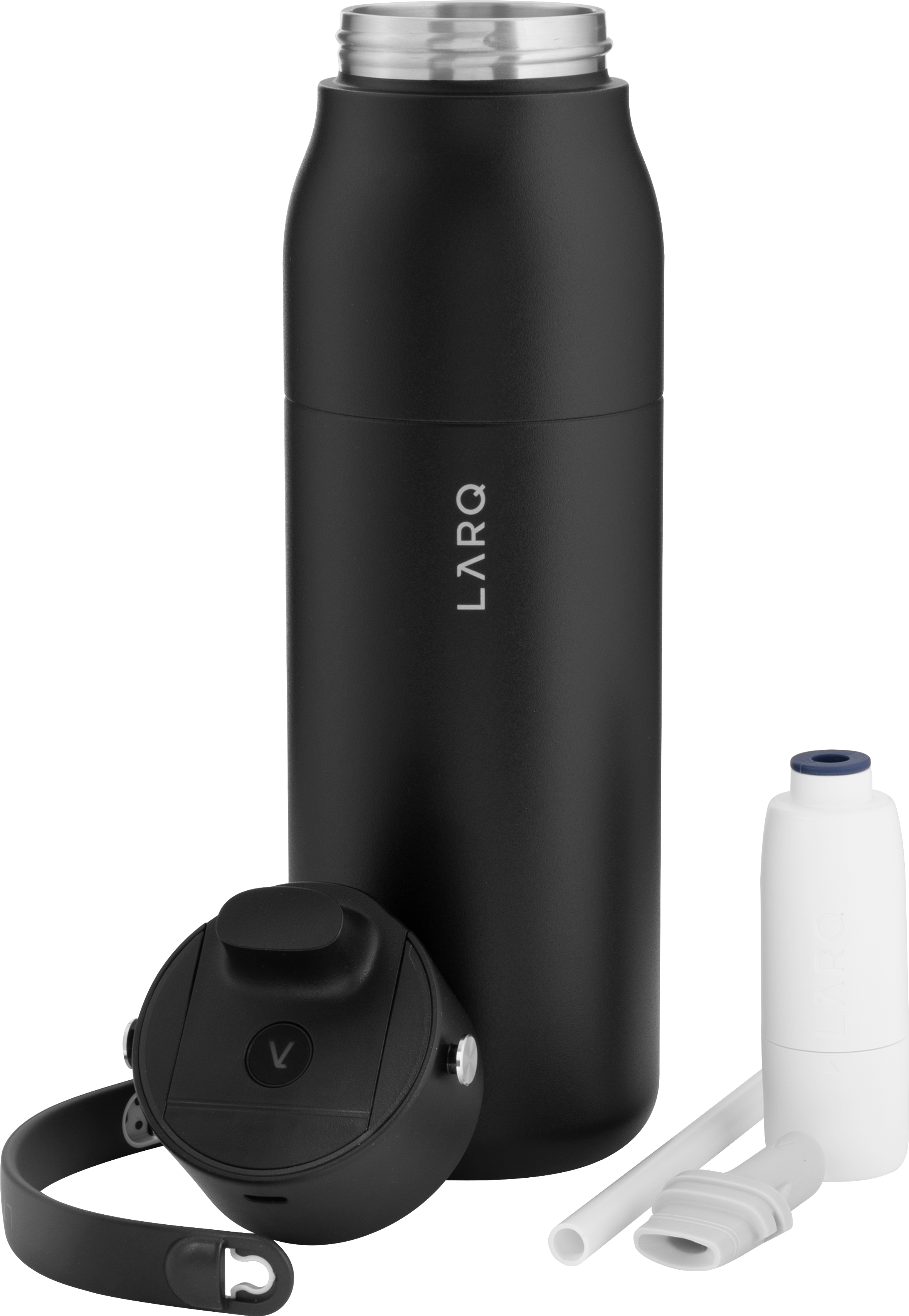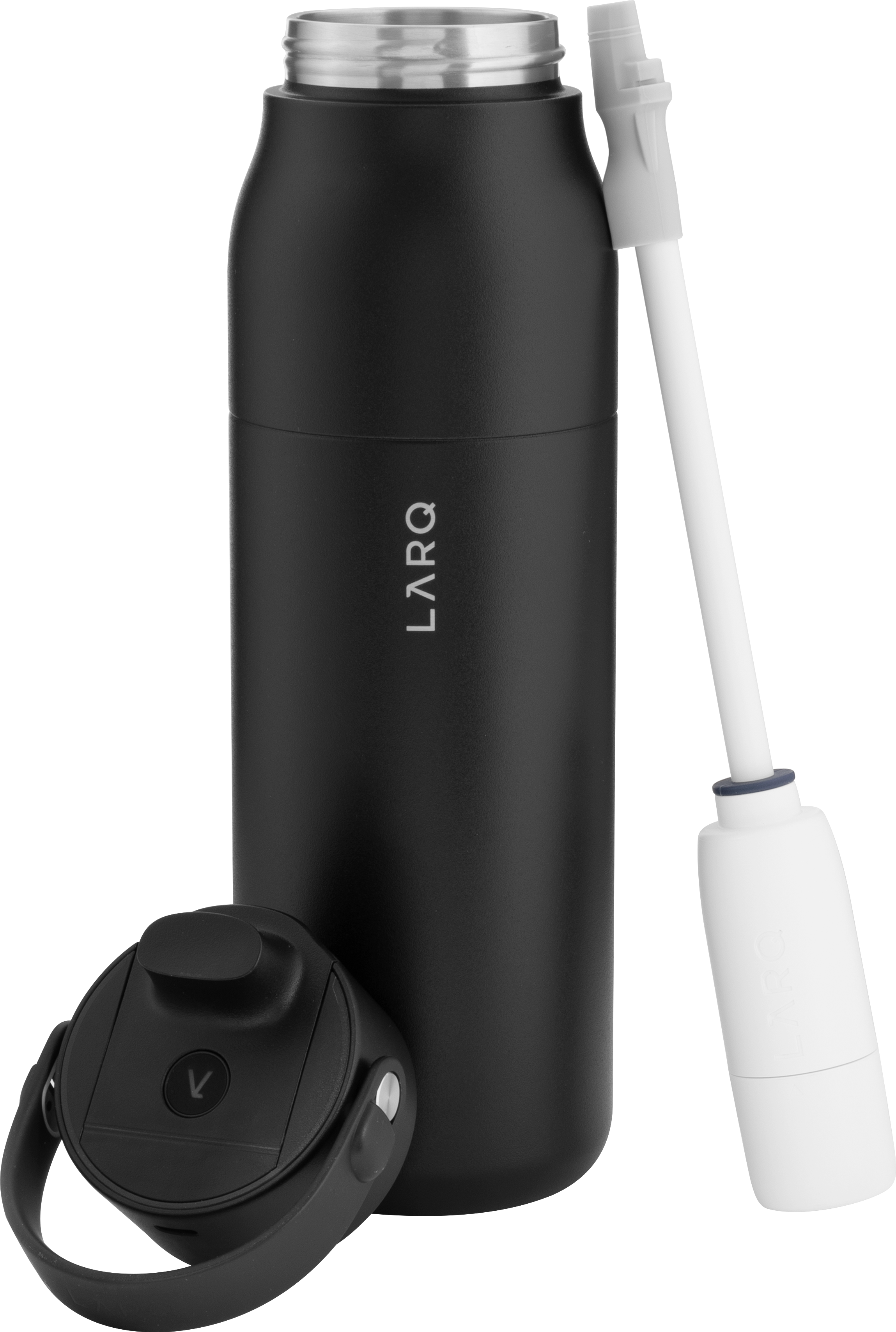 The LARQ PureVis 2 34 oz bottle combines advanced purification technology with everyday functionality. Made from premium electropolished 18/8 stainless steel with double wall construction and vacuum insulation, it keeps beverages cold for hours. It features a threaded lid with a swig top cap, an inner straw with a silicone holder, and a soft removable carrying handle for easy portability. With 280nm PureVis™ UV-C LED technology and a Nano Zero filtration system, it neutralizes bacteria and improves taste at the push of a button. Finished with a durable powder coated exterior, it's innovation you can carry anywhere.