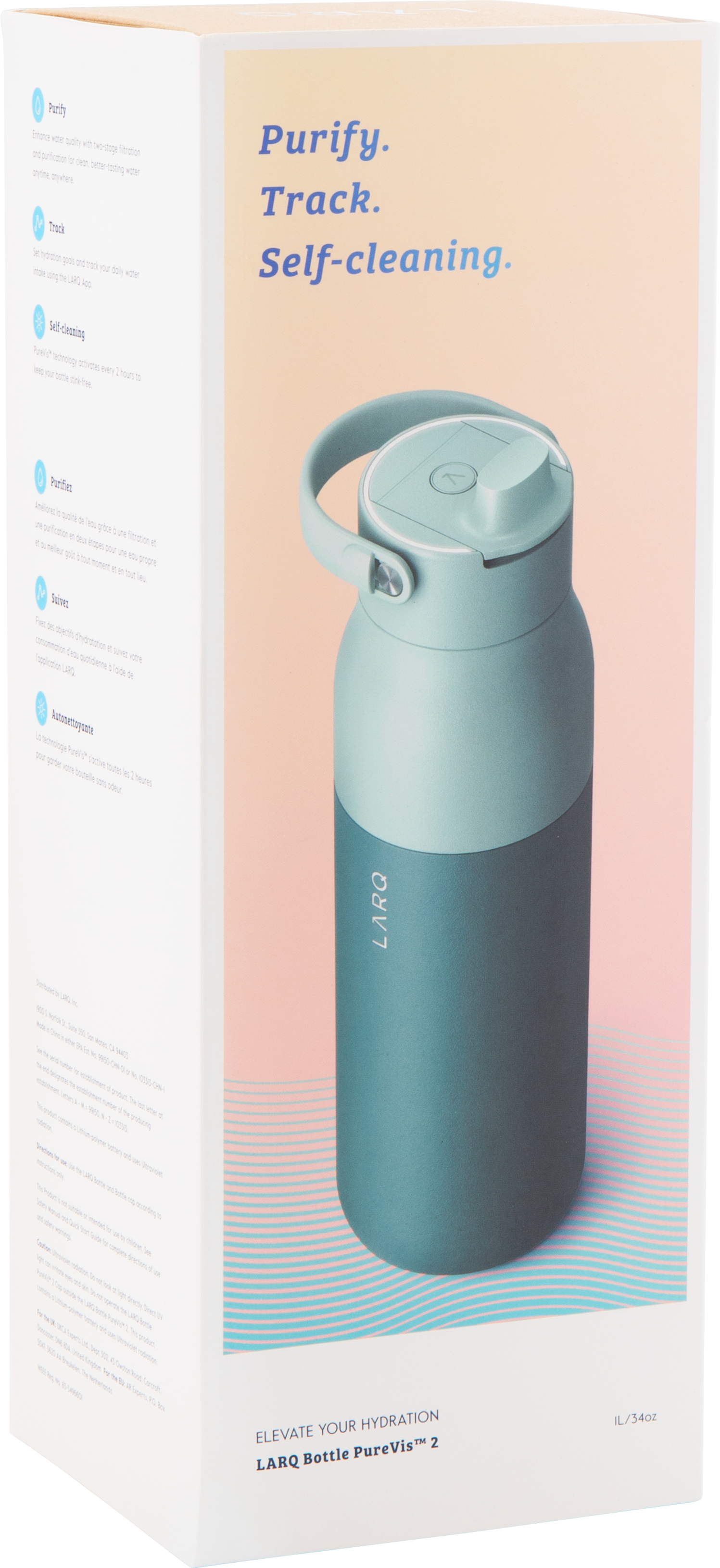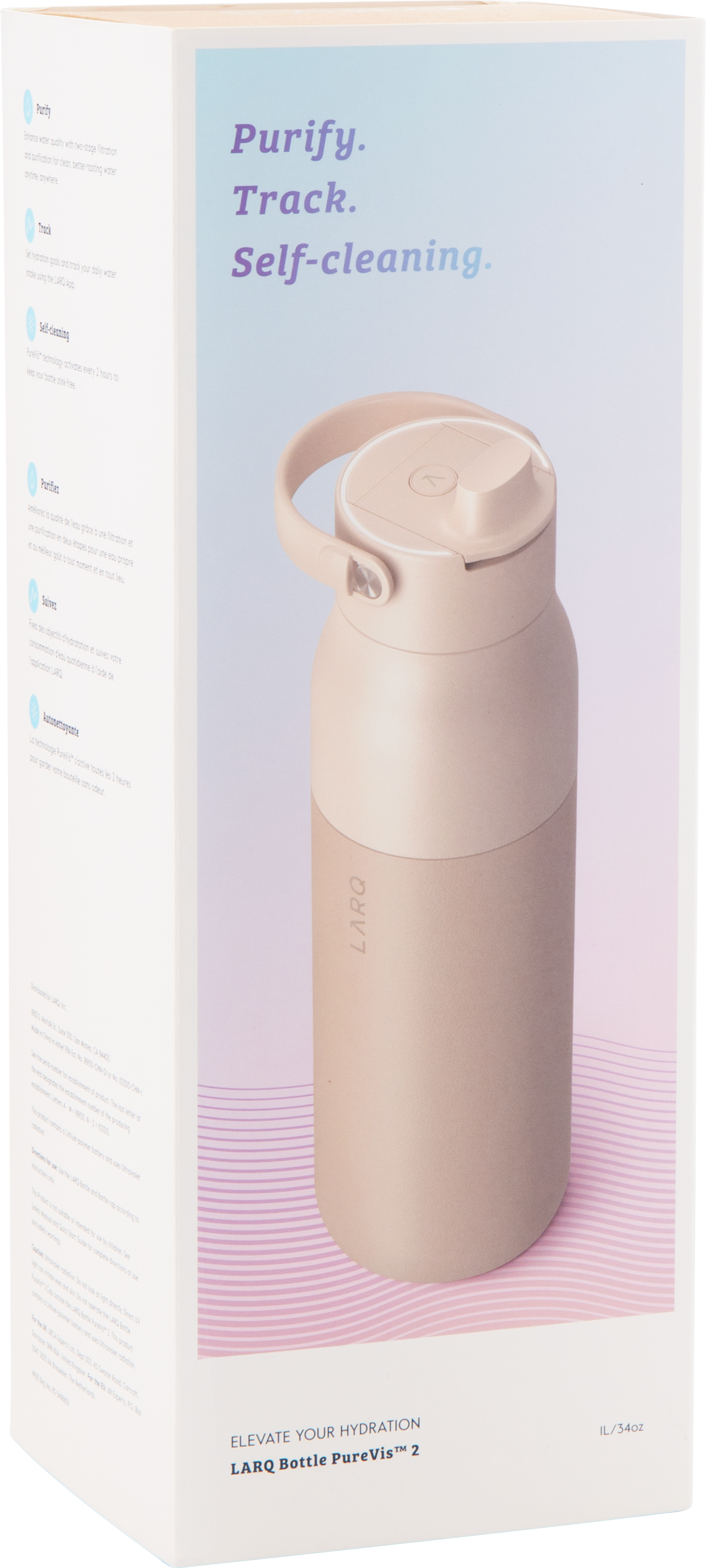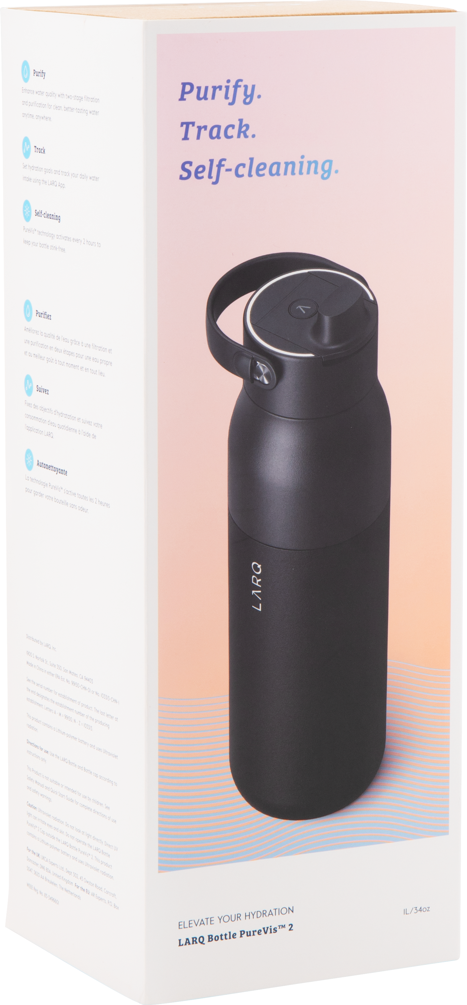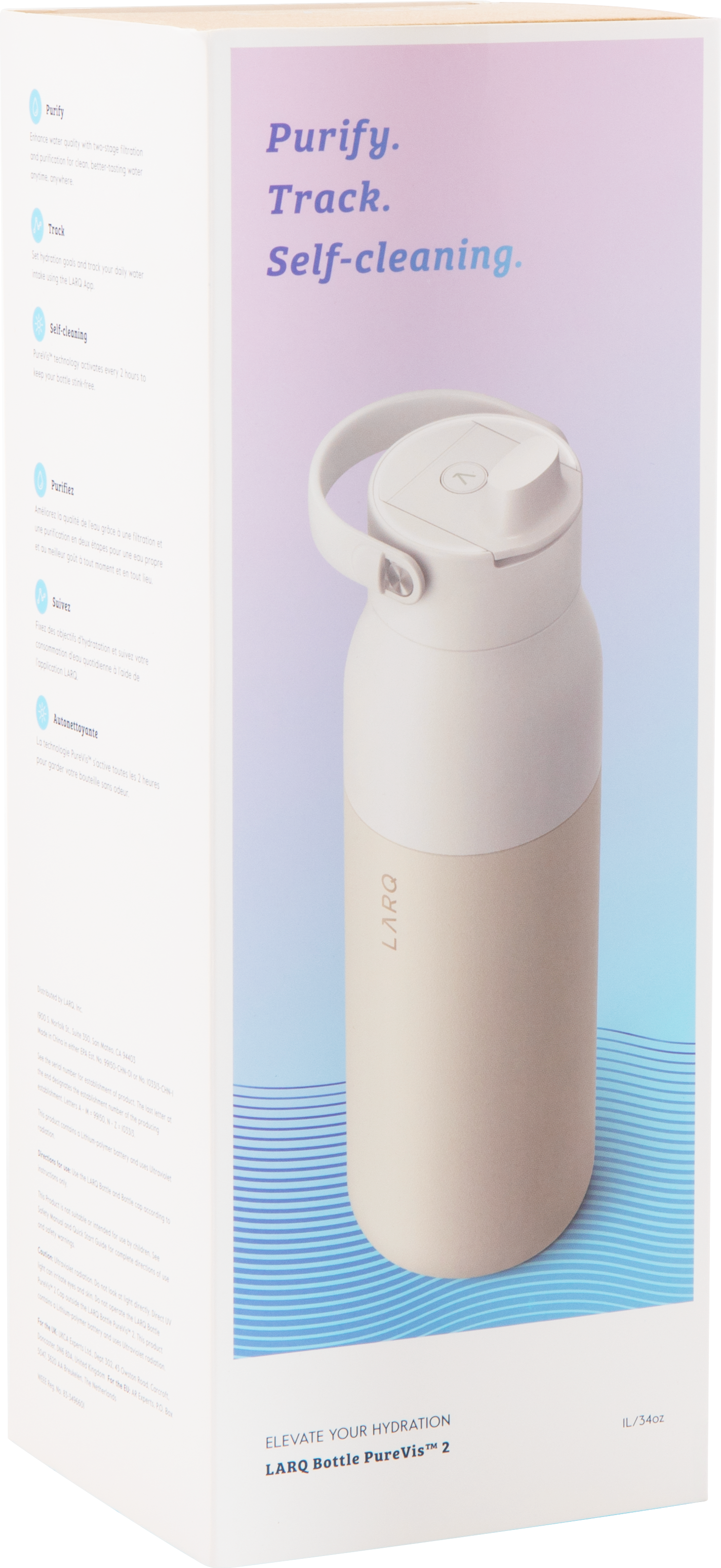The LARQ PureVis 2 34 oz bottle combines advanced purification technology with everyday functionality. Made from premium electropolished 18/8 stainless steel with double wall construction and vacuum insulation, it keeps beverages cold for hours. It features a threaded lid with a swig top cap, an inner straw with a silicone holder, and a soft removable carrying handle for easy portability. With 280nm PureVis™ UV-C LED technology and a Nano Zero filtration system, it neutralizes bacteria and improves taste at the push of a button. Finished with a durable powder coated exterior, it's innovation you can carry anywhere.
