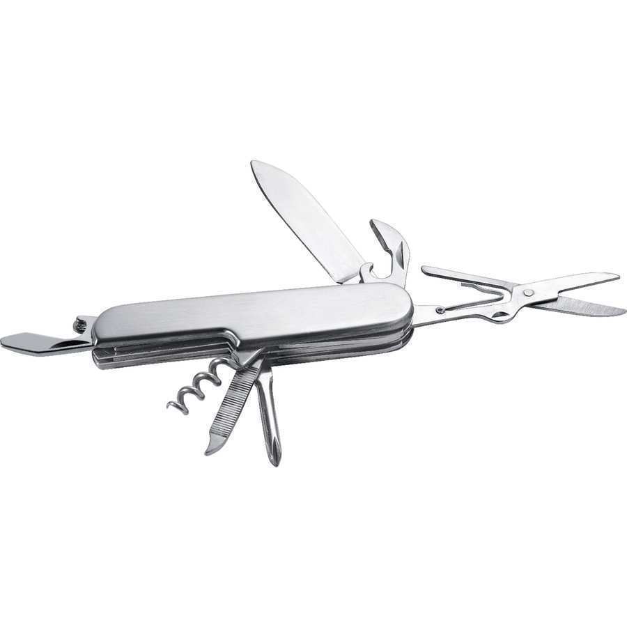 The 8-Function Stainless Steel Knife includes a knife, nail file, scissors, can opener, bottle opener/flat-head screwdriver, a Phillips-head screwdriver, a corkscrew and a mini metal split key ring.