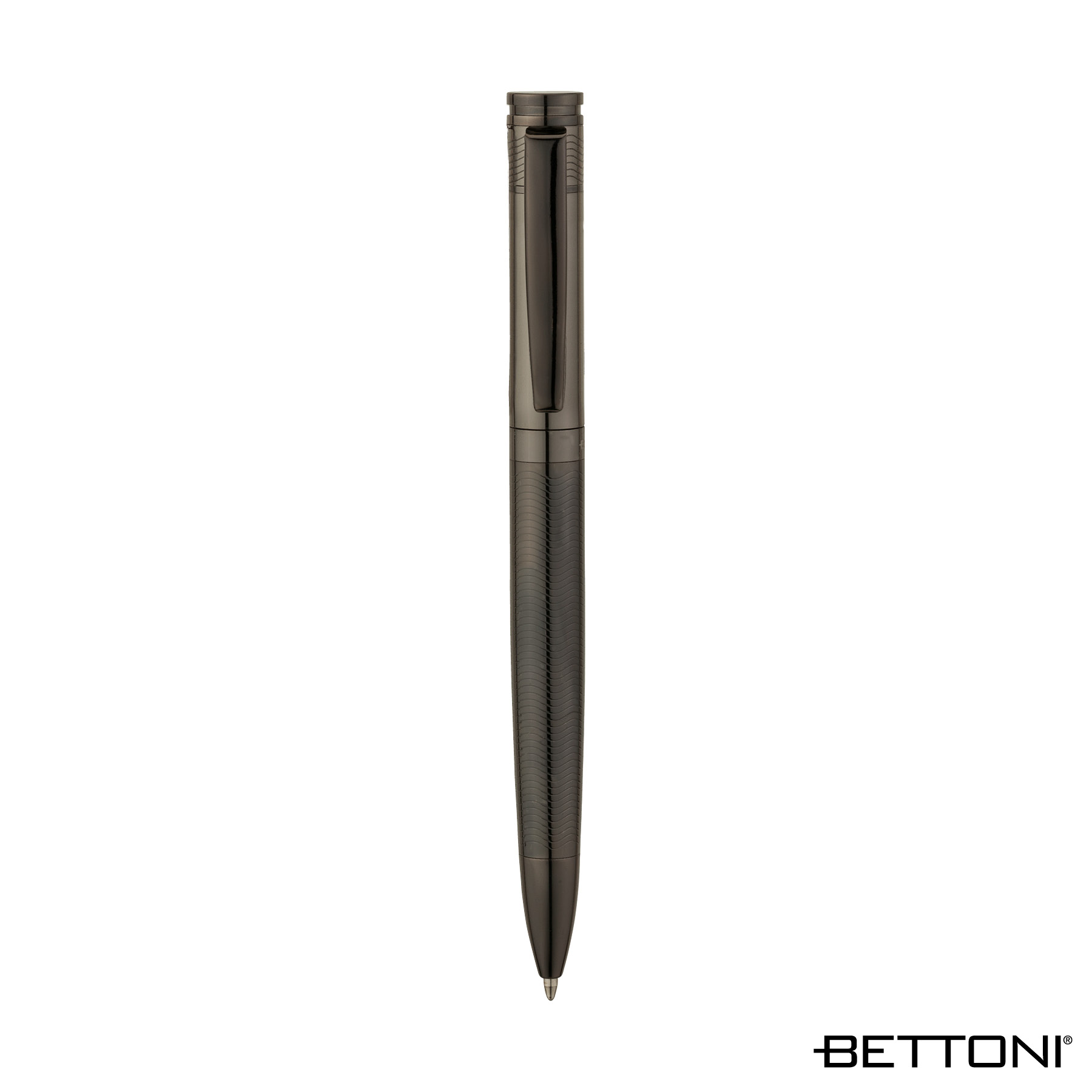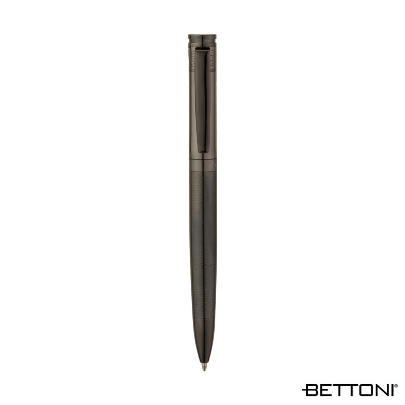 The Bettoni Abbracci brass ballpoint pen has a twist-action mechanism, gunmetal plating with high-gloss lacquer finish, USA-made ballpoint refill, and etched ridges that make it a pleasure to hold.