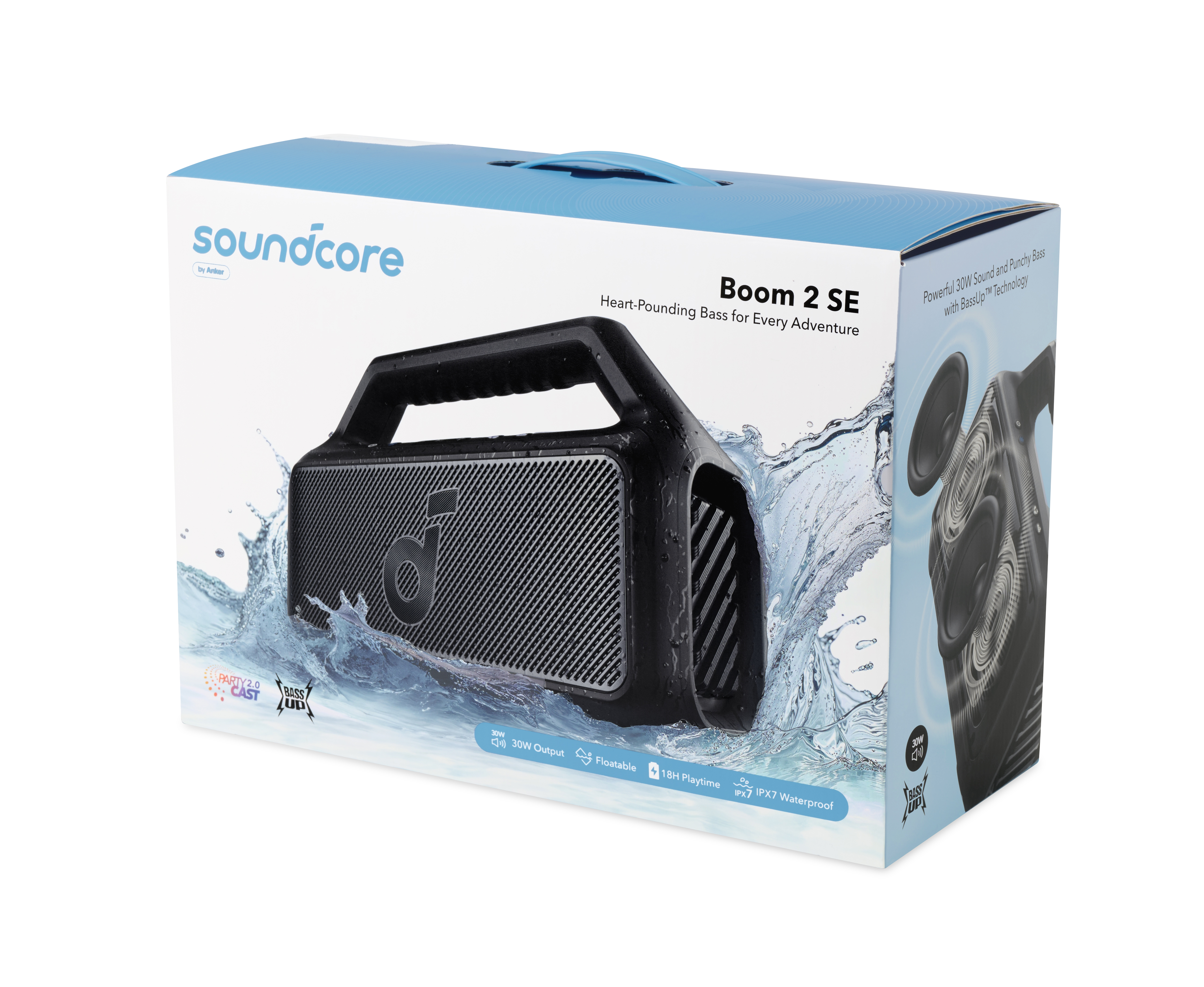 Big sound, built for adventure. The Anker Soundcore Boom 2 delivers up to 80W of booming bass with BassUp™ 2.0 and crisp 2.1 stereo sound. Play all day with 24-hour battery life and a built-in power bank to charge your phone. Waterproof, floatable, and PartyCast™ 2.0 enabled to link 100+ speakers—perfect for epic outdoor fun.