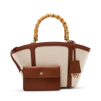 This satchel is designed with trending canvas exterior with richly colored faux leather trim and minimal branding. The featured genuine bamboo handle makes each satchel unique as no two are alike. Includes small coin/card case. Can be carried with handles or the convertible crossbody strap. Perfect for vacation or brunch. The bamboo detailing is all natural and should be treated with extra care.