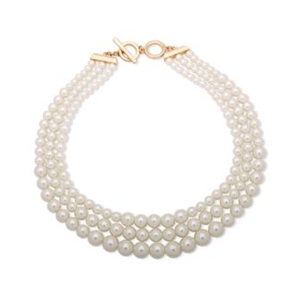 Classic three row graduated faux pearl collar necklace from Anne Klein. Pearls range from 6mm-12mm in size. Gold tone toggle closure.