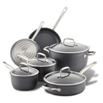 Gourmet performance has been perfected. Hard-anodized 10-piece cookware set is constructed with patented Precision Forge technology for thick bases, thin walls, and ultra-tough rims plus incomparably fast and even heating. Sapphire-reinforced, triple-layer nonstick lasts 16X longer than traditional nonstick and 80X longer than typical ceramic cookware. Dual riveted cast stainless steel handles, flat rivet Unity Surface, and stainless-steel capped bases are induction suitable, dishwasher safe, and oven safe to a blazing 500deg.F.