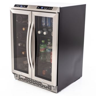 The 24 in. Wide French Door Wine Chiller/Beverage Cooler has a Capacity of : Wine Chiller (Left Zone): Up to 19 Wine Bottles, Beverage Cooler (Right Zone). There is Top Mounted Soft Touch Electronic Control and Display for Monitoring Temperature ( Degree C/ Degree F) for Each Zone. This unit boasts Glass Doors with Stainless Steel Frame and Handles.