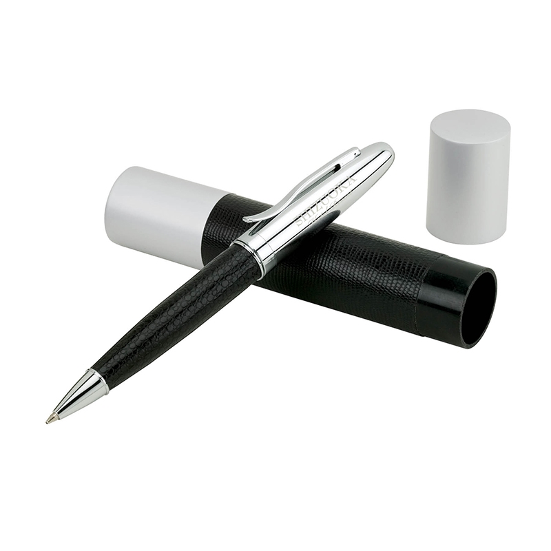 Twist-action mechanism, faux leather ballpoint pen with matching 1" x 6 3/16" tube case.