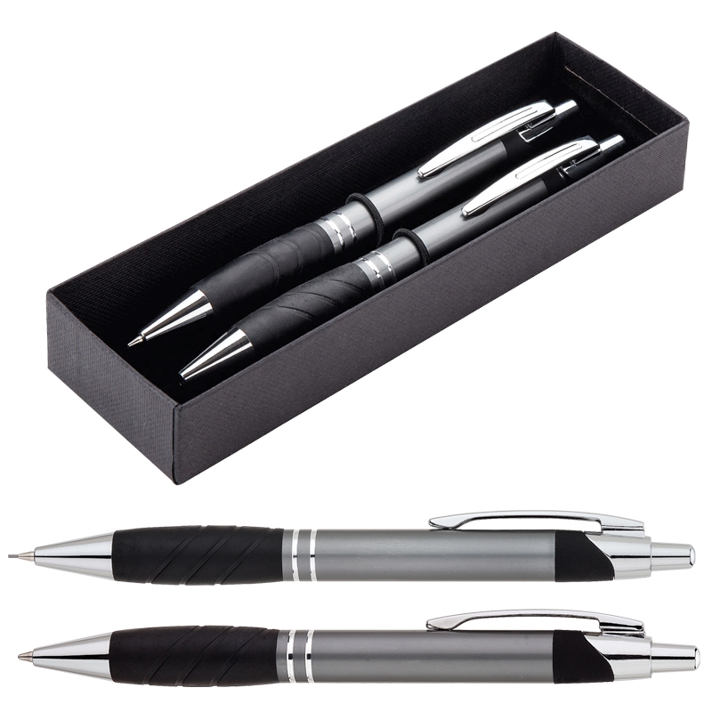 Plunge-action aluminum ballpoint pen and mechanical pencil set with rubber grip and metal clip set in a 2 piece gift box.