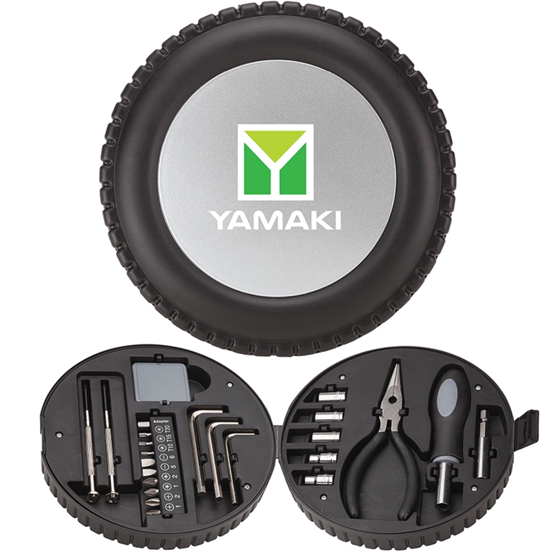 Tire-shaped tool case includes spring-loaded needlenose pliers with cutter, bit driver with 5-piece socket set, 9-piece screwdriver bit and adapter set. Also includes Phillips and flathead mini screwdrivers, 3-piece hex wrench set and a 3' tape measure with inch / metric scale.