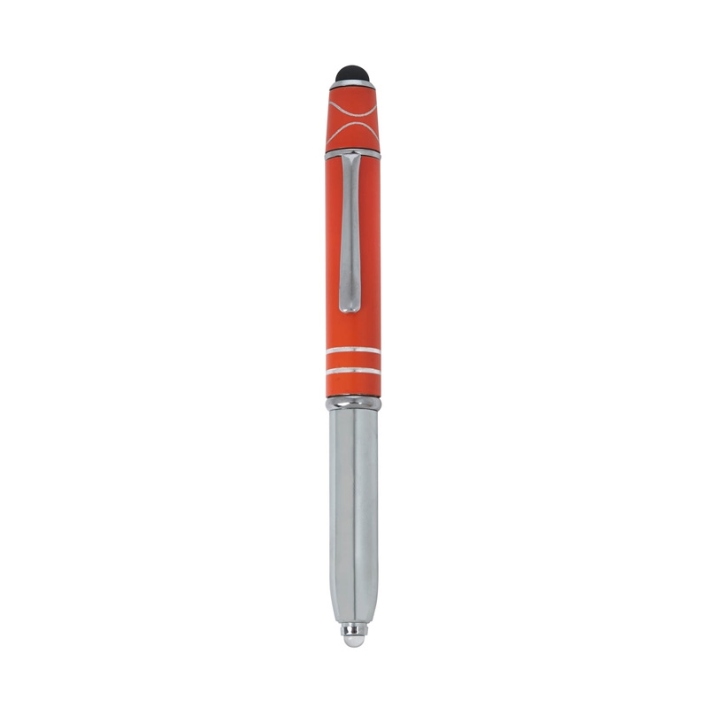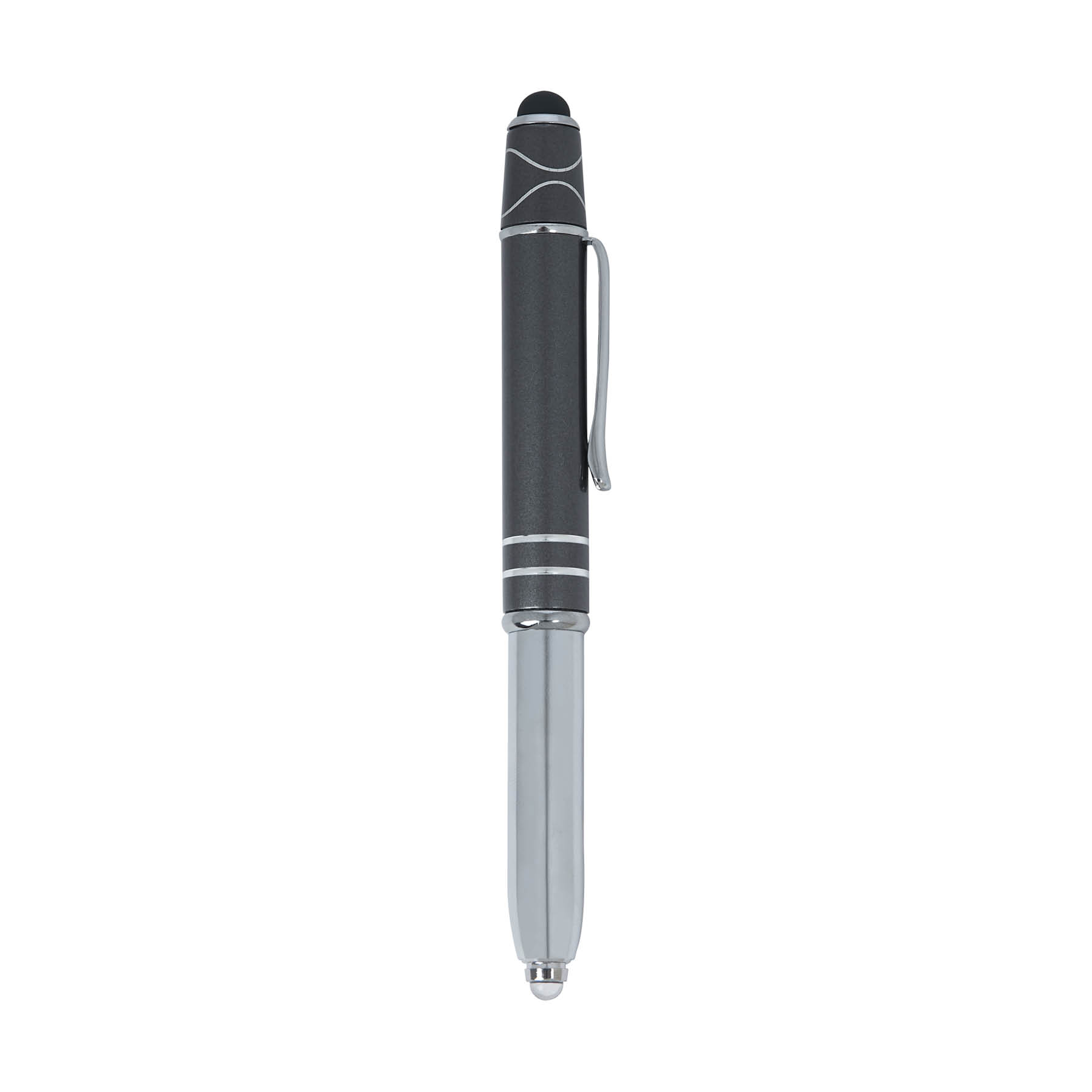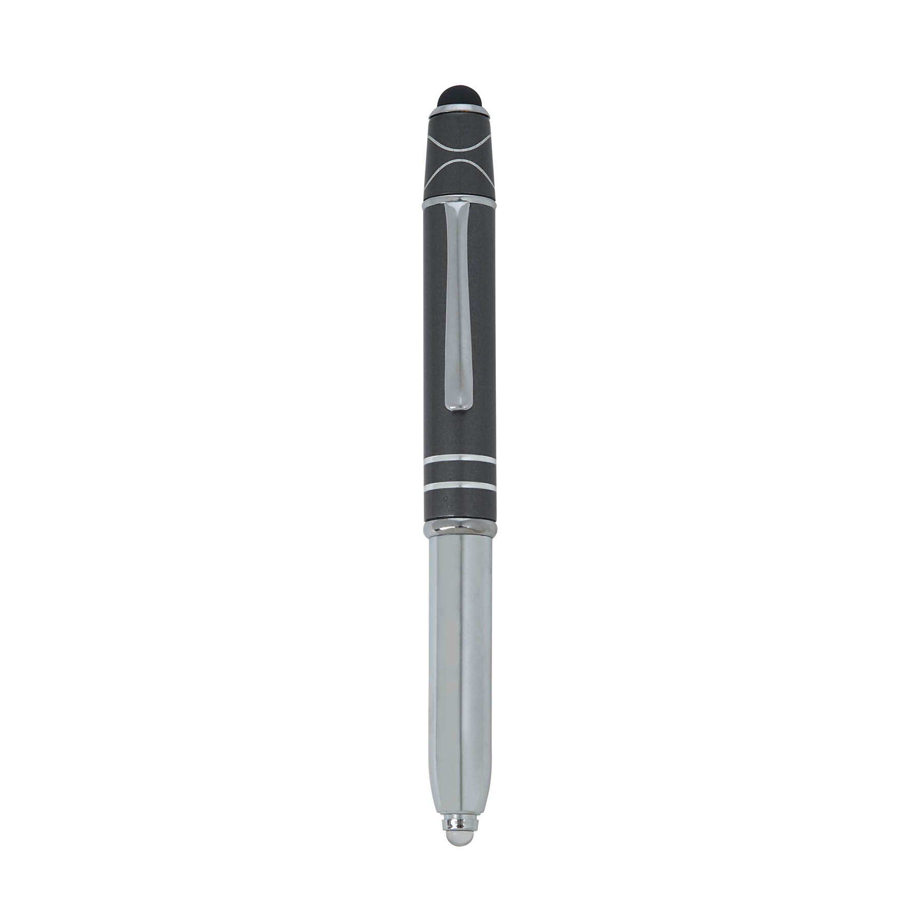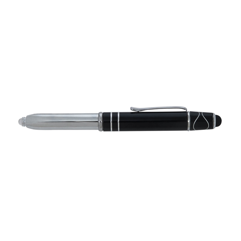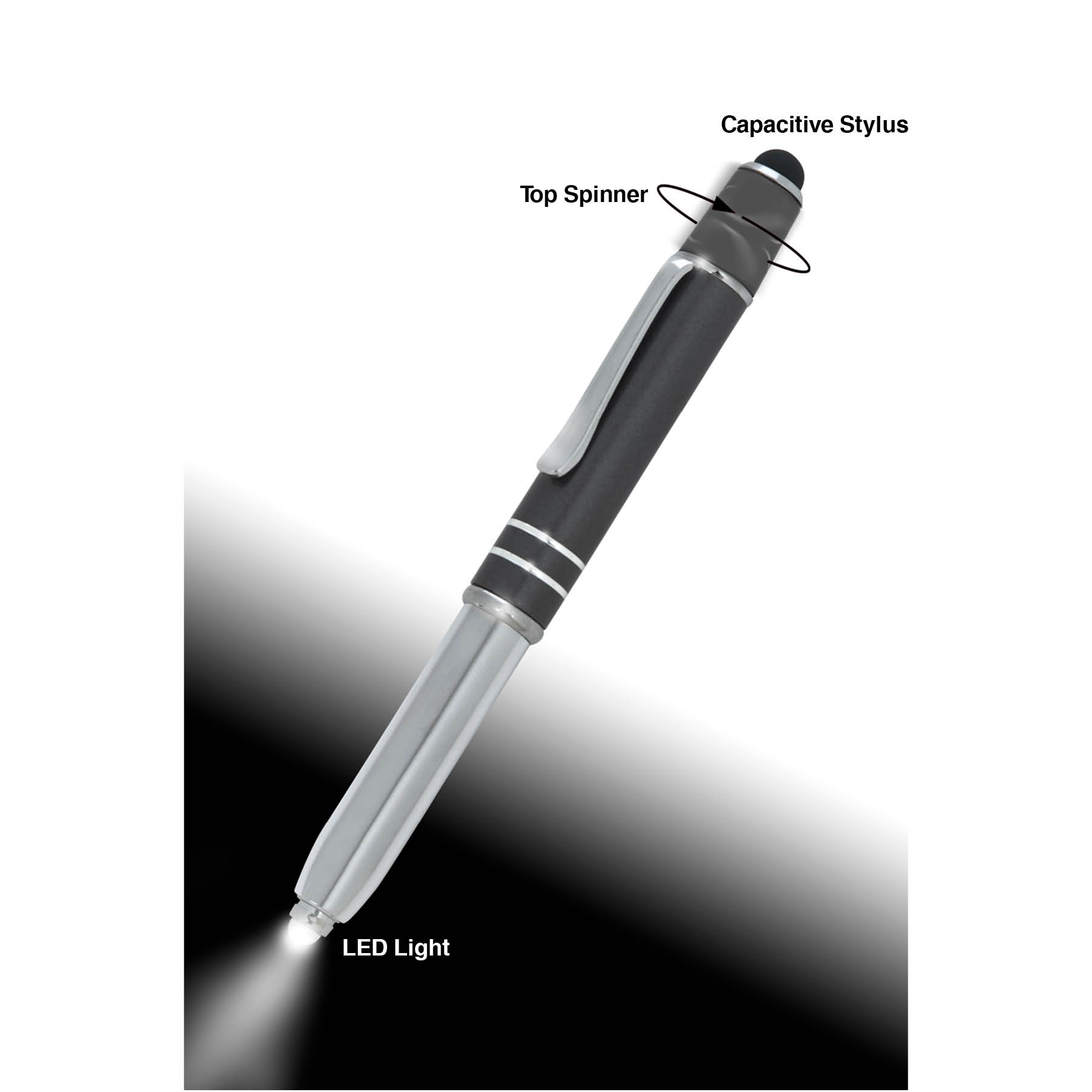 The Legacy Spin 4-in-1 Ballpoint Pen with Fidget Spinner is crafted from aluminum with a colored cap and features two accent rings. This cap-off writing instrutment is equipped with a capacitive stylus for touch screens, an LED light, and black ink making it your all-in-one writing tool for any task, and its added top spinner helps keep you focused with minimal distracting noise.