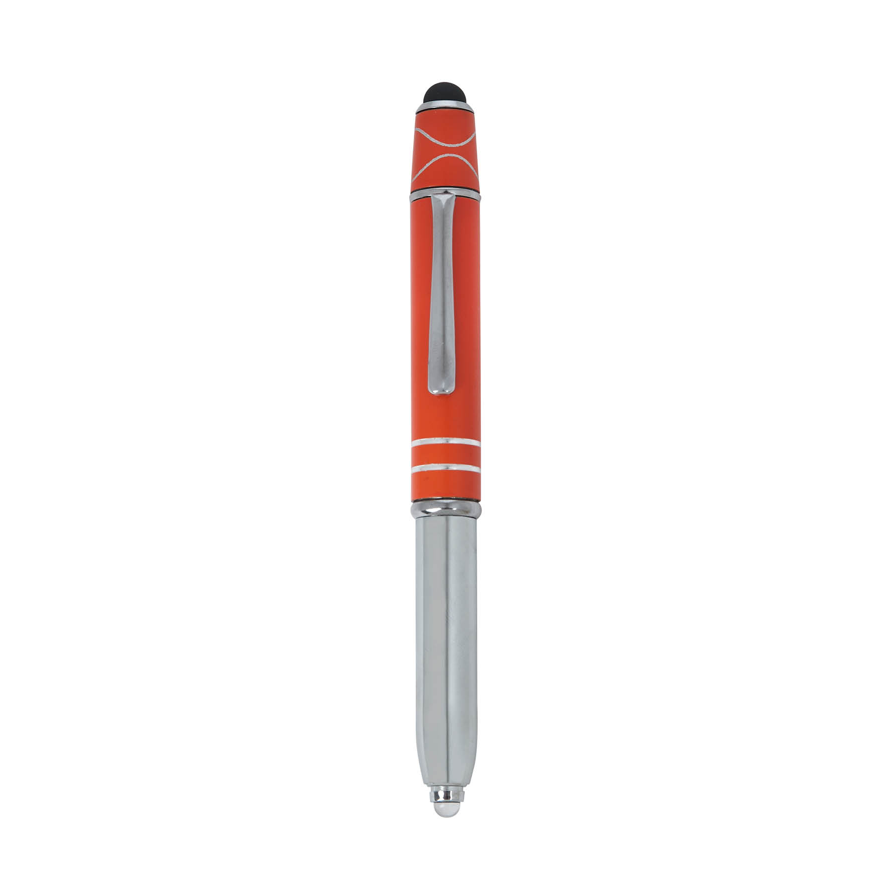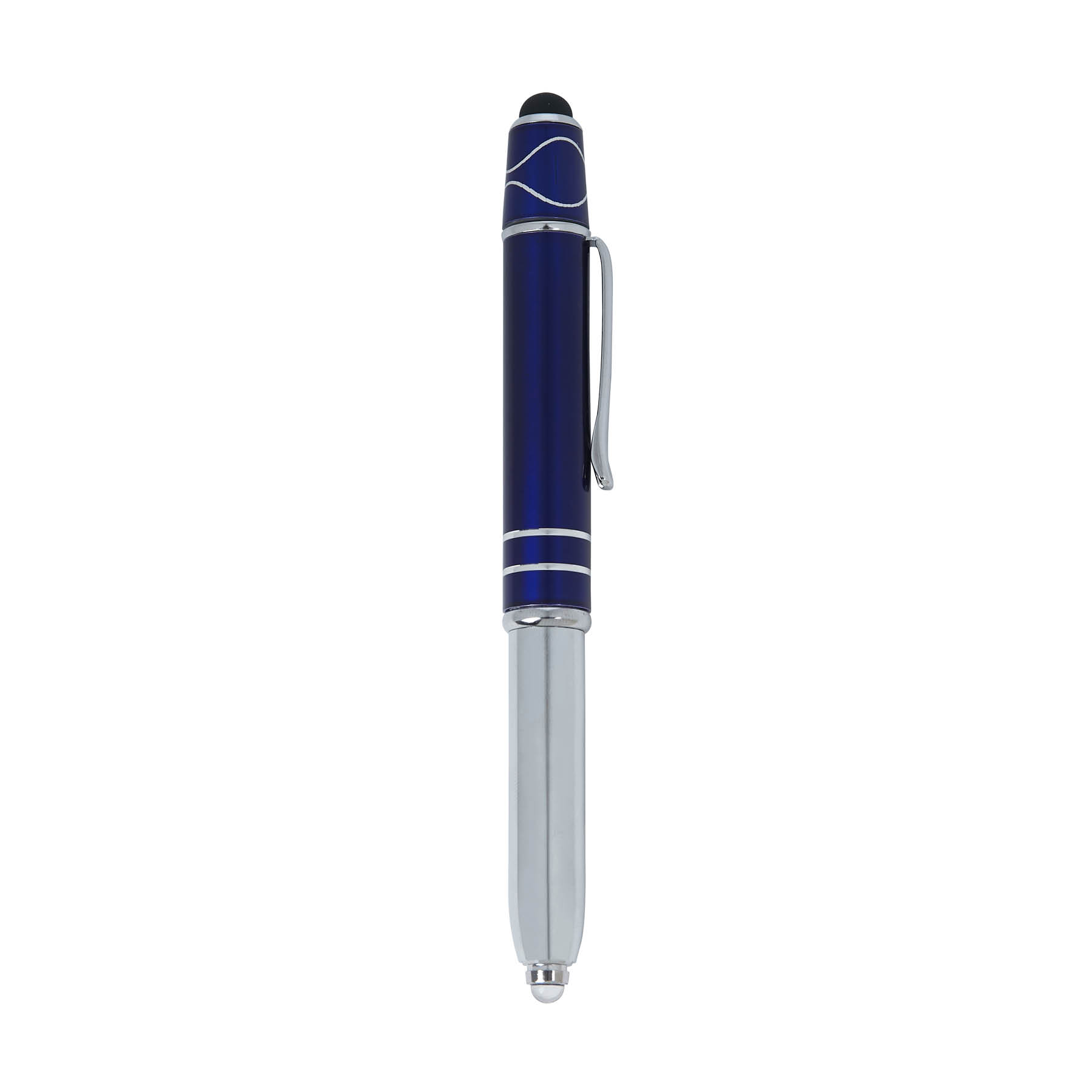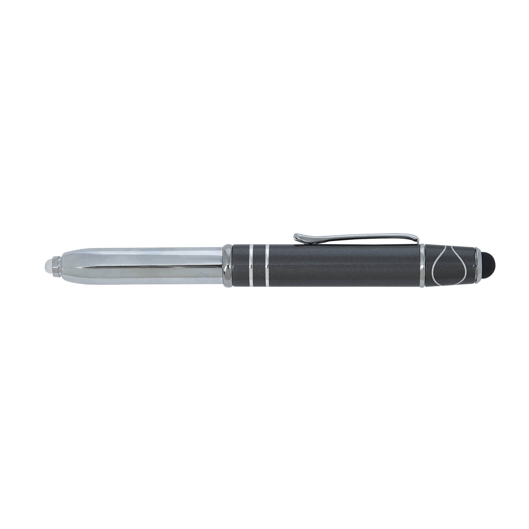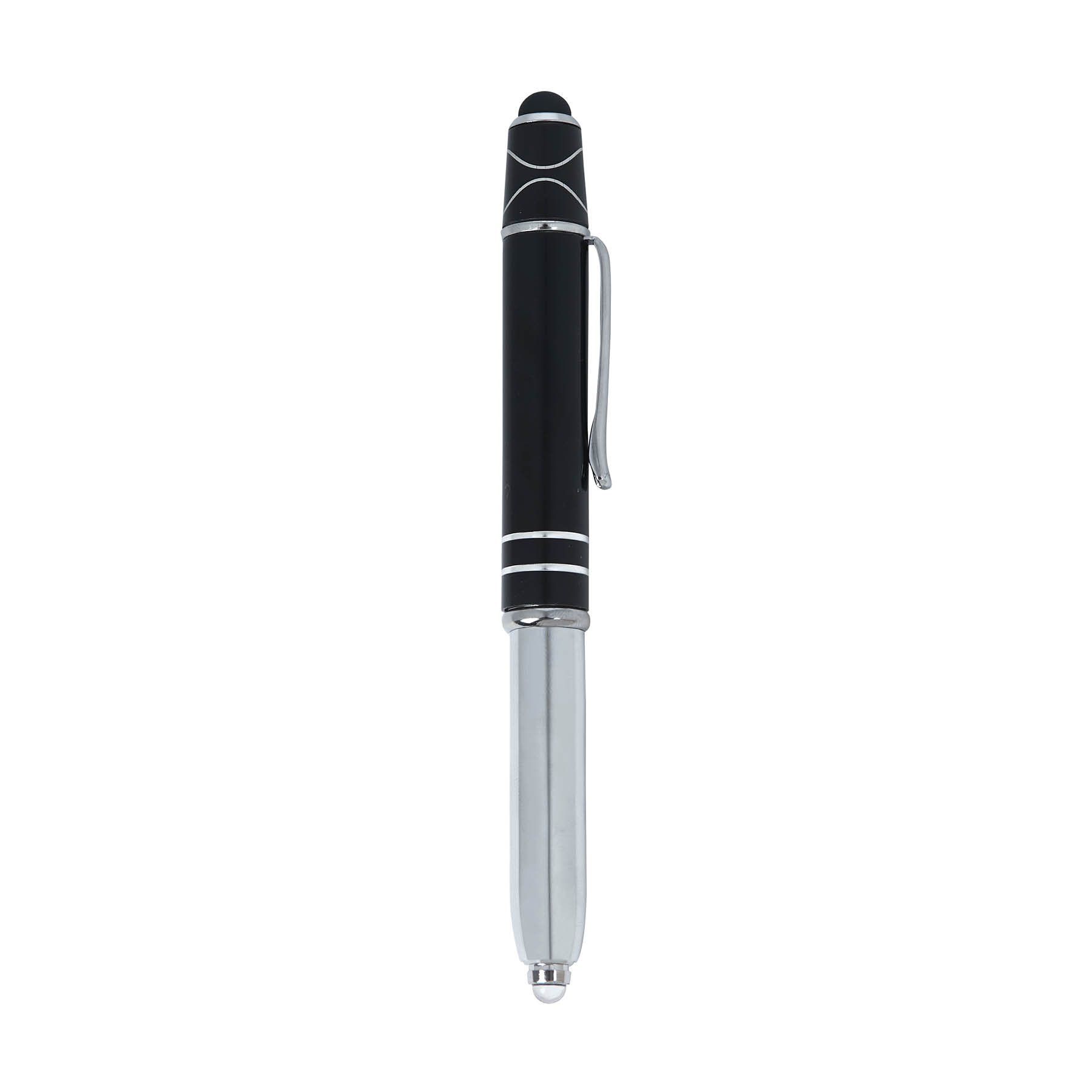 The Legacy Spin 4-in-1 Ballpoint Pen with Fidget Spinner is crafted from aluminum with a colored cap and features two accent rings. This cap-off writing instrutment is equipped with a capacitive stylus for touch screens, an LED light, and black ink making it your all-in-one writing tool for any task, and its added top spinner helps keep you focused with minimal distracting noise.