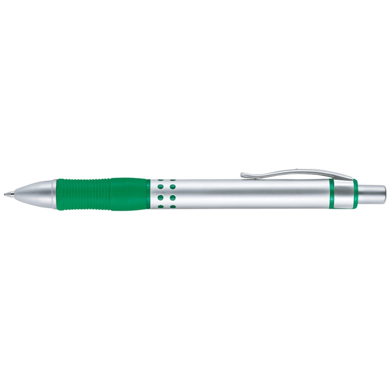 Plunge-action mechanism, metal barrel, matte silver tip and plunger, textured rubber grip, metal clip.