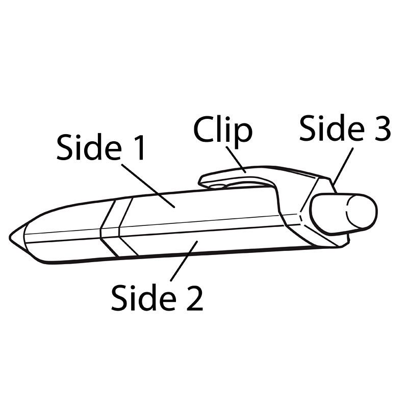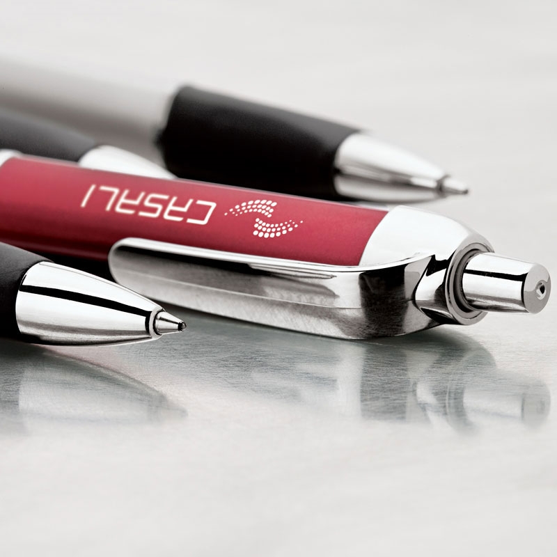 Plunge-action mechanism, colored metallic triangular barrel, soft rubber grip, chrome plated trims.