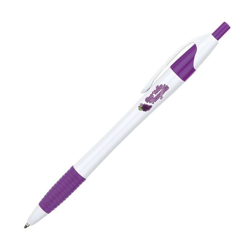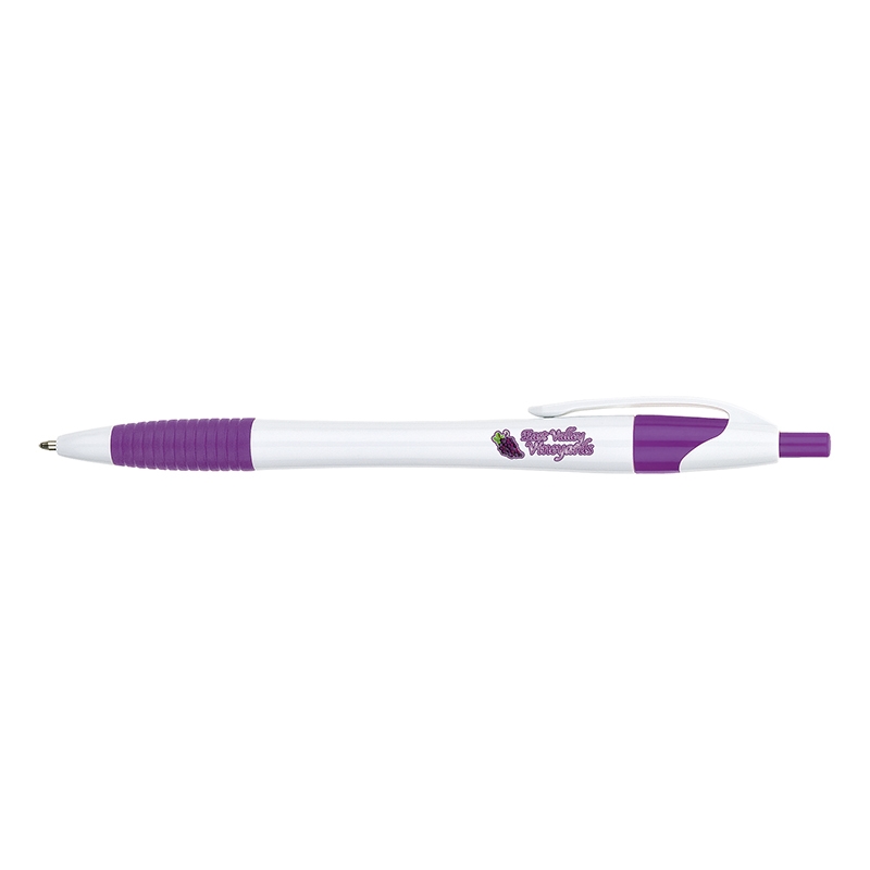 Plunge-action ballpoint with hourglass barrel design and soft rubber grip. For a limited time, price includes full-color imprint in one location. In addition, there are no set-up fees nor run charges for MOQ and above.