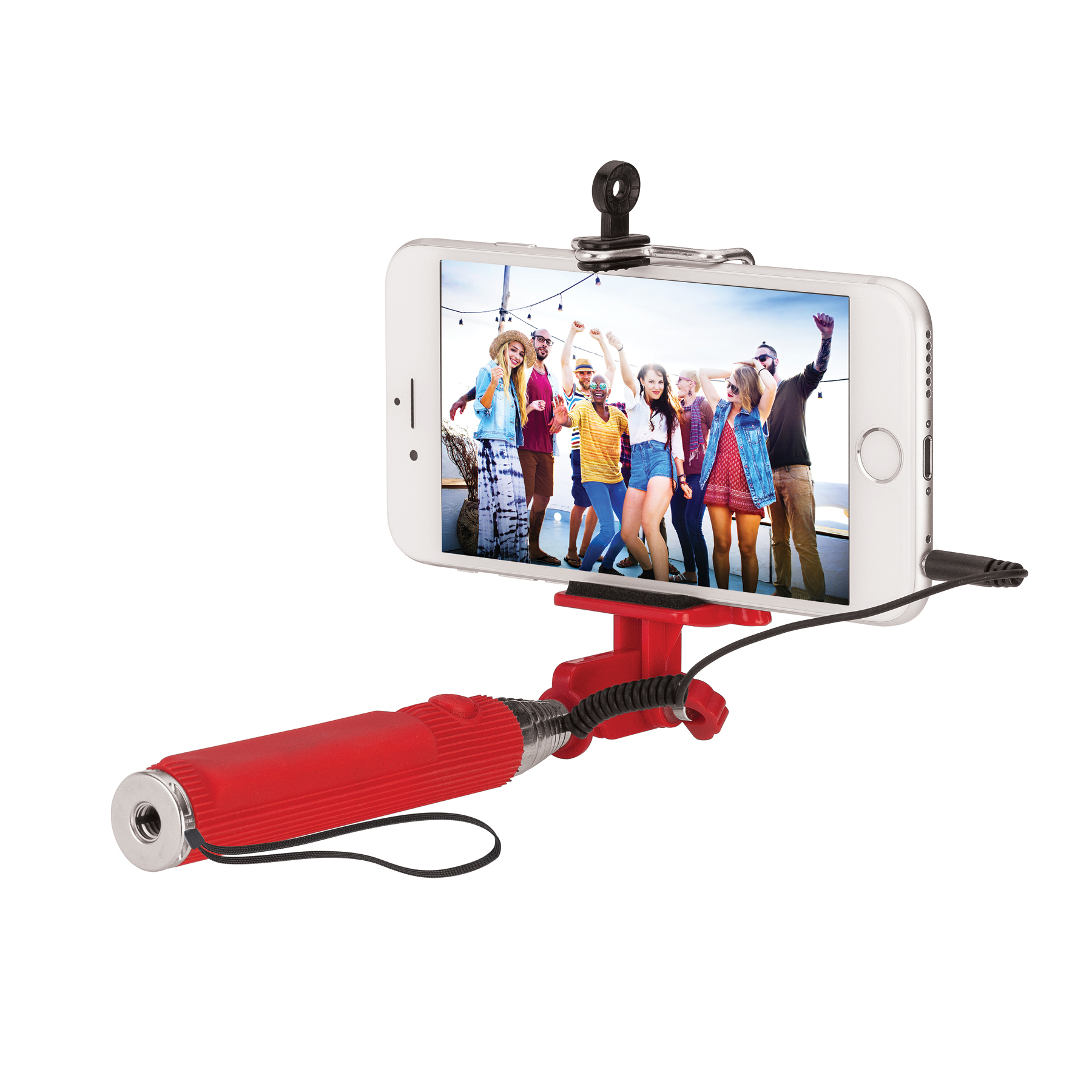 This compact selfie stick features a stainless steel handle and ribbed silicone grip. Hold your phone at a better distance for your next shot using the spring-loaded clamp. Insert the 3.5mm plug into your phone, turn on your camera and capture the moment with the handle-mounted shutter button. No batteries or Bluetooth necessary. The stick extends to 20 1/2" and can hold phones up to 3 1/2" wide. Accepts standard tripod mounting screw.