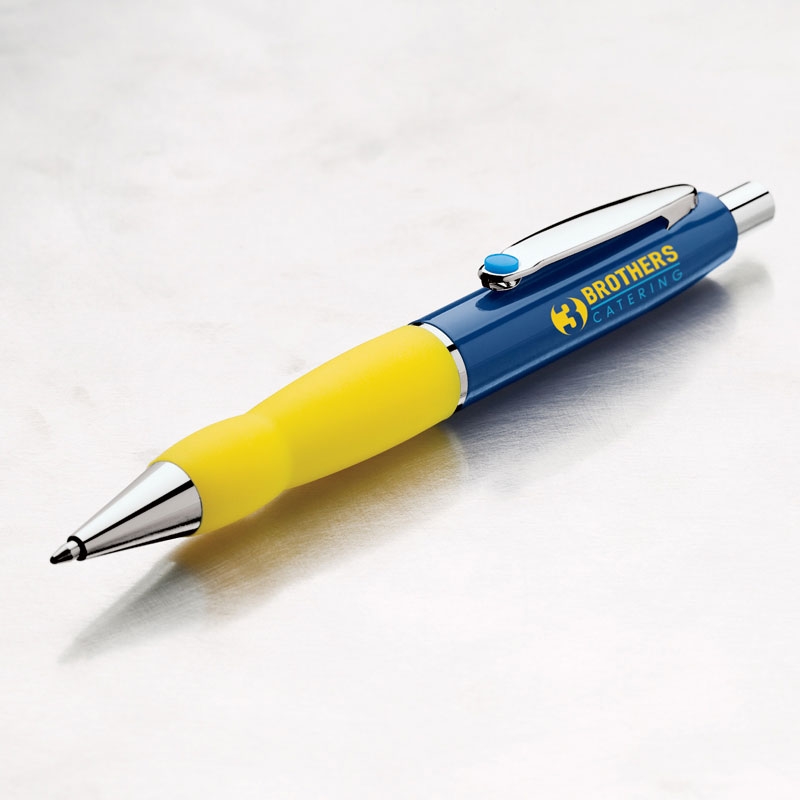 Build your own pen by choosing from 12 colors for your cap, clip dot and grip. The plunge-action ballpoint pen has a brass cap, chrome clip and trims and soft rubber grip.