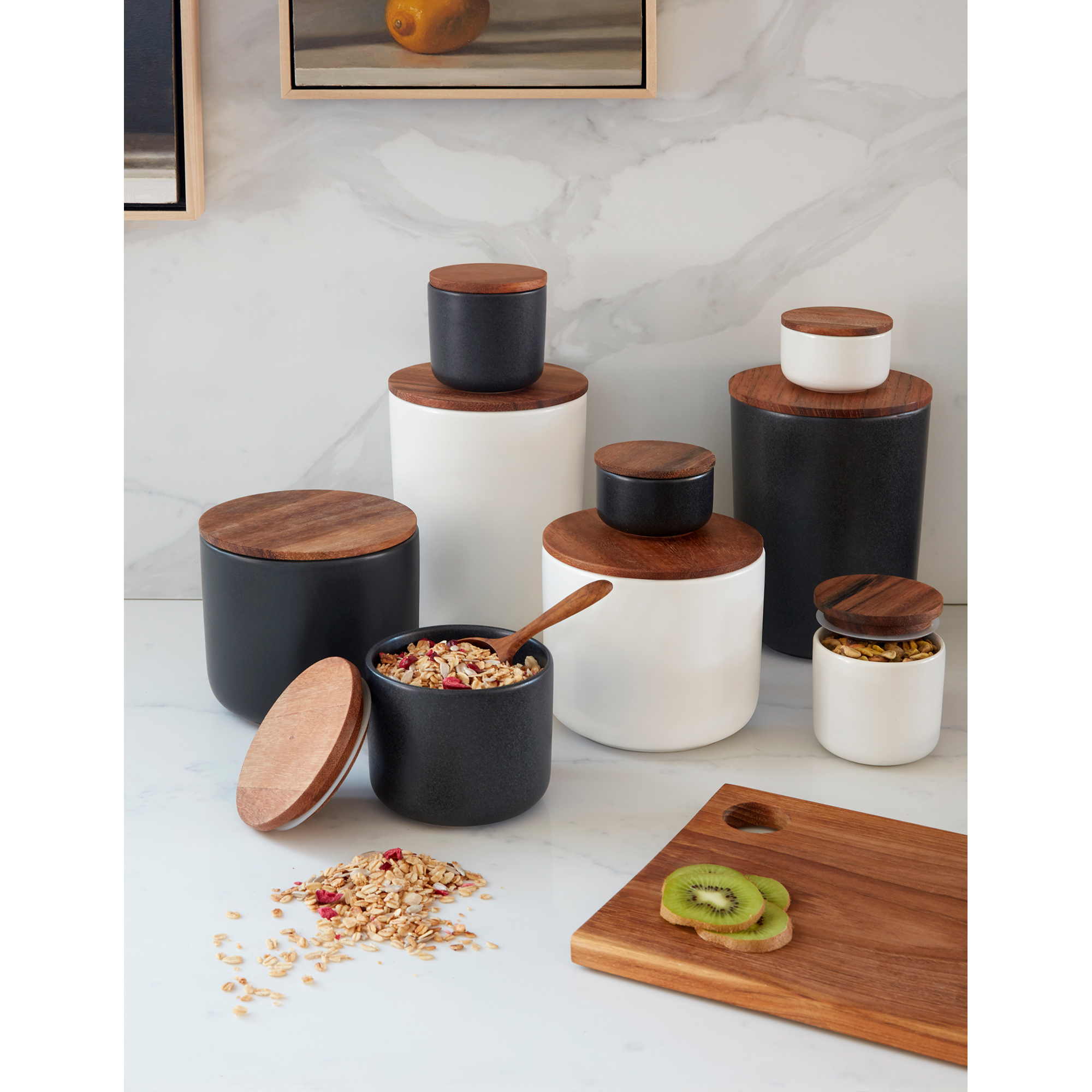 Ready to meet your culinary storage needs, this striking, but simple ceramic container is designed to store your kitchen staples in style. We love using them for everything from coffee to sugar, making it our go-to for any other cooking or baking goods. Accented by the rich warm grain of the sustainably-sourced acacia wood lid, they have a silicone ring to retain the freshness of whatever you choose to store inside. These containers are also great for organizing desktop and home essentials.