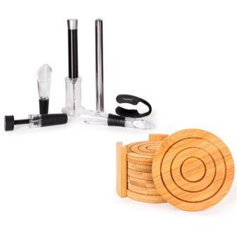 BergHOFF's Wine Set with Coasters. Taste the difference with this unique wine opener set by BergHOFF. This essential box set designed for wine enthusiasts features a foolproof air pump opener, foil cutter, stopper, aerator pourer, and chiller pourer. This set is your one-stop-shop for all of your wine needs. Protect your furniture from water marks with this set of 6 coasters. These bamboo coasters create a contemporary design, but would also compliment any traditional home. Generously sized coasters made from renewable eco-friendly bamboo. Set includes: 6x Round Natural Bamboo 4" Coasters, and Coaster holder, Air Pressure Opener, Foil Cutter, Aerator Pourer, Vacuum Stopper & Chiller Pourer
