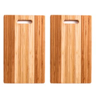 Upgrade your kitchen prep with BergHOFF's 2pc cutting boards set. Each 14" rectangular board is crafted from durable, eco-friendly bamboo and features a stylish two-tone design that adds a modern touch to your kitchen. Ideal for slicing, dicing, and serving, these boards are gentle on knives and resist moisture and odors. A convenient hanging loop allows for easy storage and quick access. Whether you're prepping vegetables or serving cheese and charcuterie, these versatile boards combine function with elegance. Perfect for everyday use or entertaining guests. Set includes: 2x Cutting Boards 14"