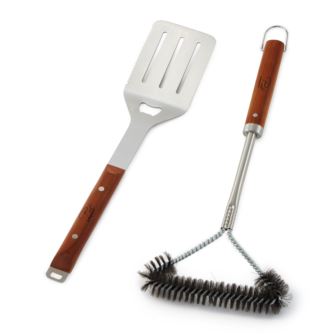 This 2pc BBQ set is the perfect addition to any grill enthusiast's arsenal. These tools are crafted from durable stainless steel and long wooden handles for long-lasting use. The ergonomic handles provide a comfortable grip, even when handling hot items. This set is ideal for both novice and experienced grillers, ensuring a smooth and enjoyable grilling experience. It is a must-have for any serious grill enthusiast, making your grilling adventures more enjoyable and efficient. Package includes: 16.25" Brush, 16" Turner