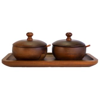 Let your seasonings be an on elegant display, filling your home with a fresh herb smell that will make you (and your guests) feel right at home. This Spice Jar Set is made of acacia wood, with a beautiful deep wood grain that is designed for durability. Fill each jar with your favorite seasonings - such as salt, pepper, cumin, herbs, or even sugar - and serve it on our high quality tray to complete the look. Handwash only. Package includes: 2x Spice Jars 10" x 5.12" x 93.5", 2x Spoons, Tray