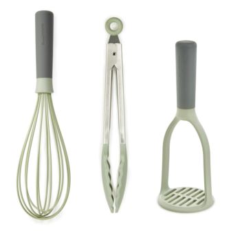 This versatile Leo Balance 3pc kitchen tools set is a must-have in any kitchen. The serving tongs is perfect for flipping bacon, turning chicken, or serving spaghetti. Its non-slip handles and heat-resistant silicone tips make it safe for non-stick cookware. Our silicone whisk, made from recycled PP, won't harm your cookware while beating eggs, cream, or sauces. Create creamy mashed potatoes, guacamole, or egg salad effortlessly with our colorful masher. Its fine-grid plate and ergonomic soft-touch handle ensure smooth mashing without straining your wrists. Plus, it won't scratch non-stick pans thanks to the reinforced nylon head. Easy to clean and dishwasher safe. This set includes Serving tongs 10.5", whisk 11", potato masher 9.25".
